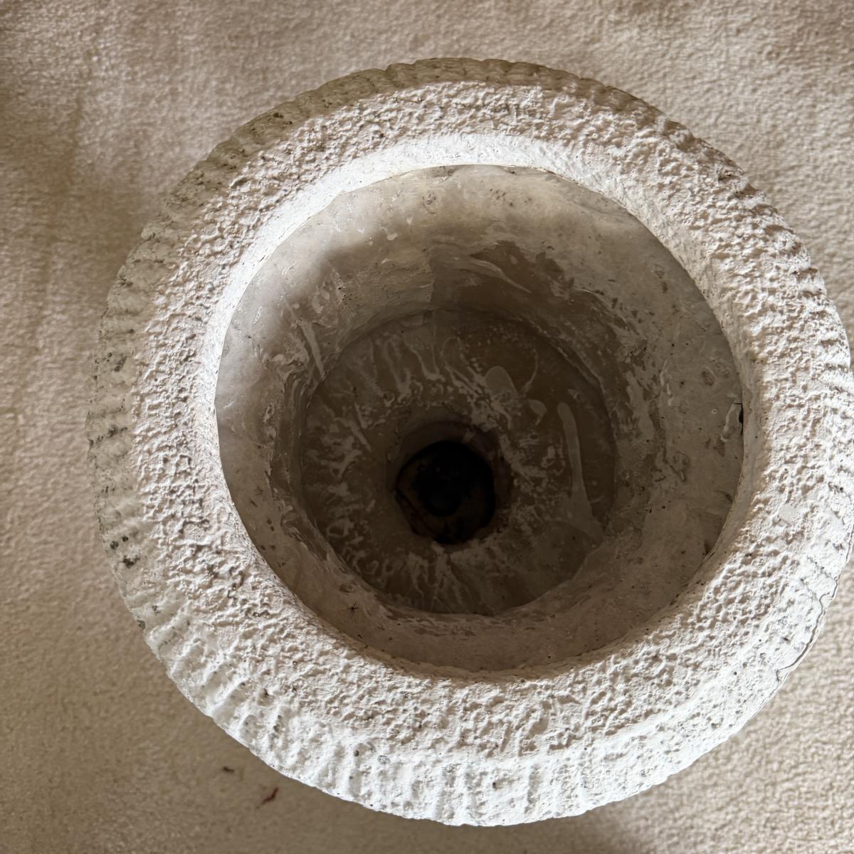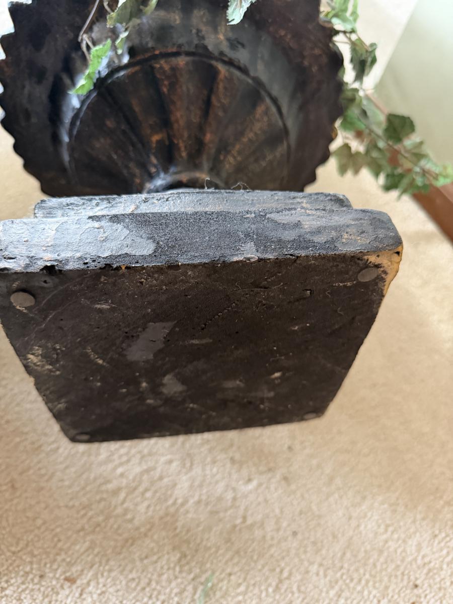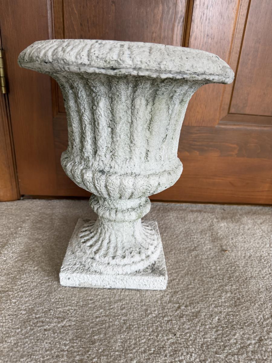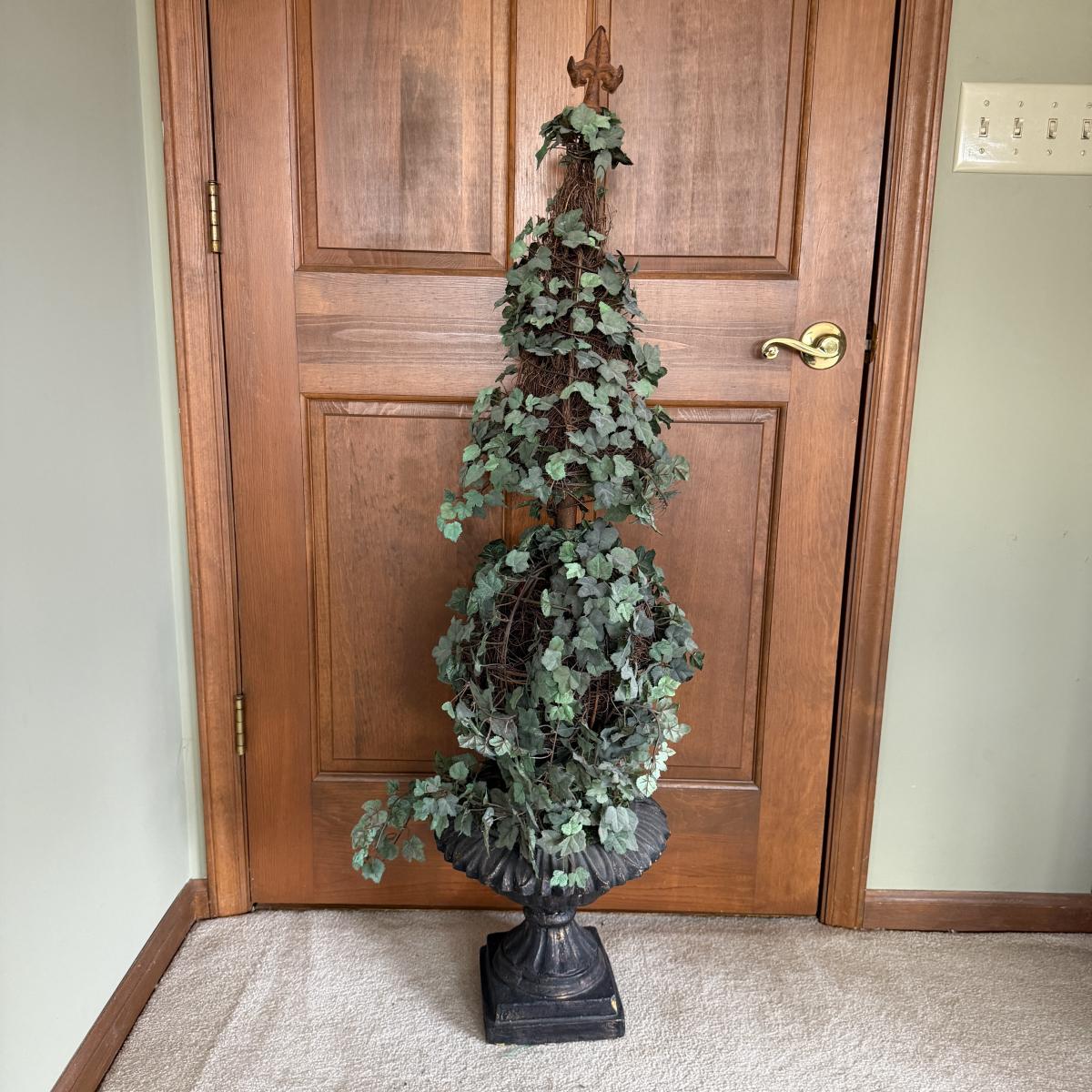 Lot includes a faux cement resin planter and a faux ivy topiary in a foam black urn planter. Topiary measures 13”D x 51”H.