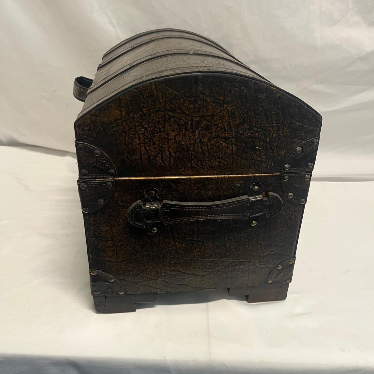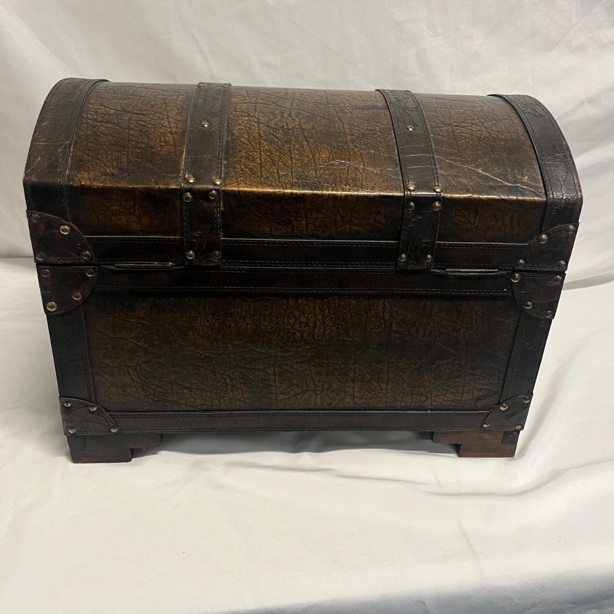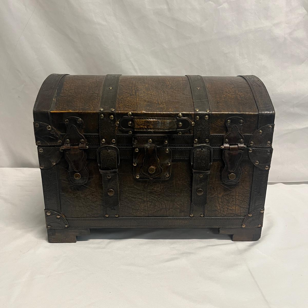 This small wooden trunk has a faux leather covering and snap closures on the front. Trunk measures 12” x 20” x 15”H.