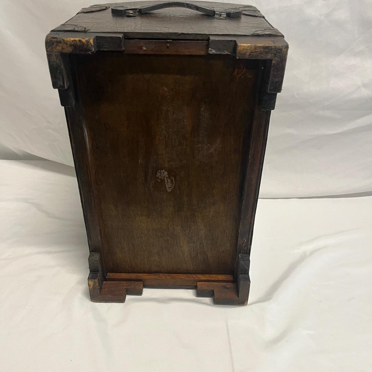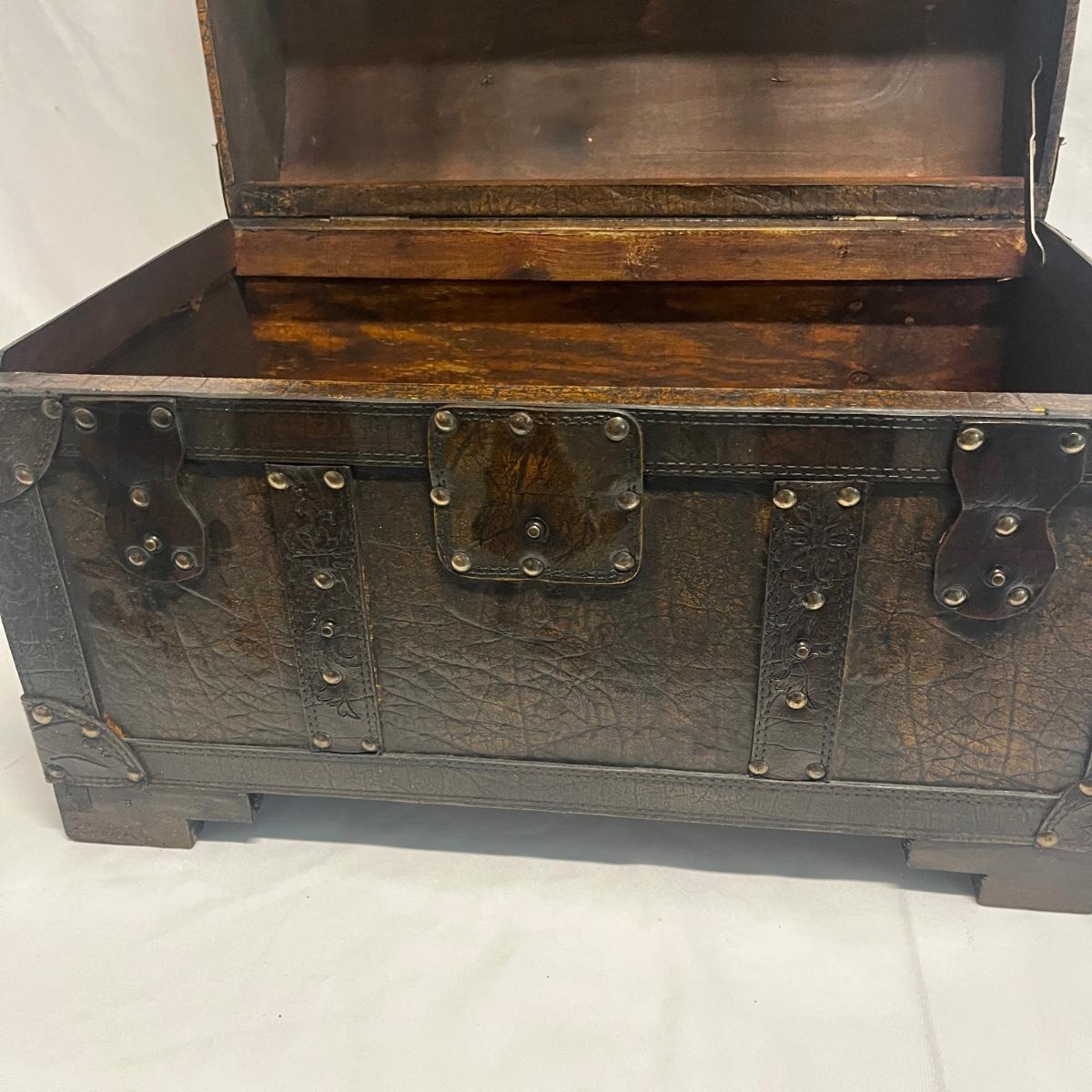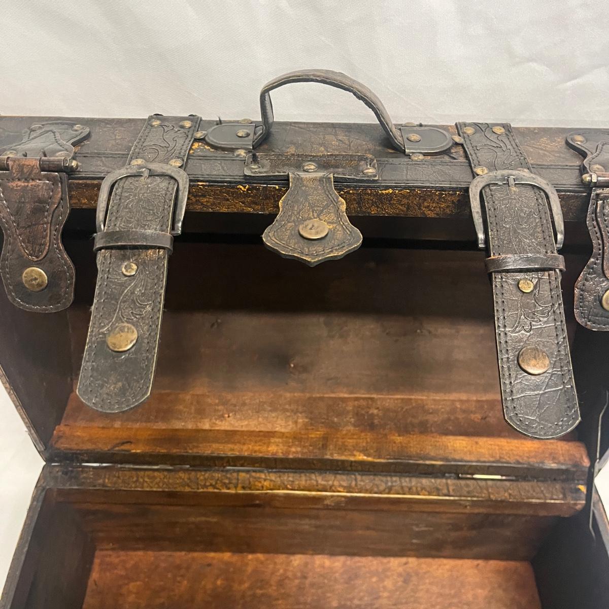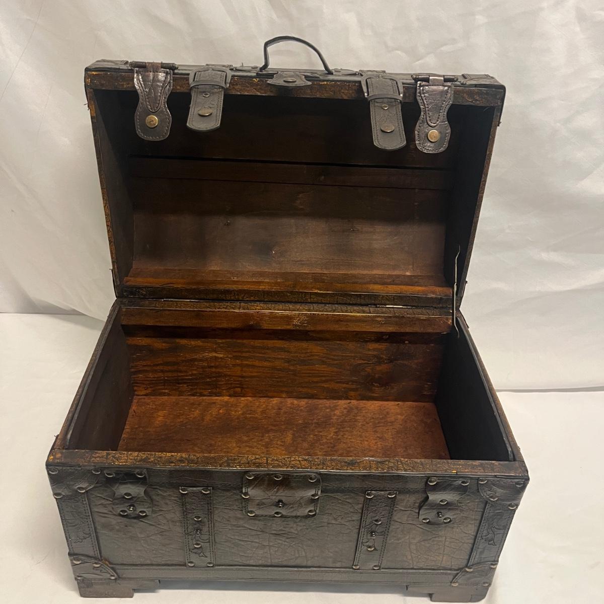 This small wooden trunk has a faux leather covering and snap closures on the front. Trunk measures 12” x 20” x 15”H.