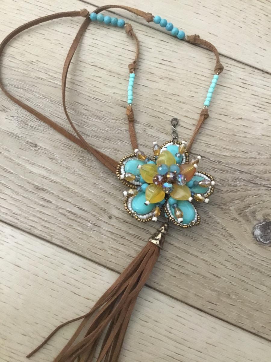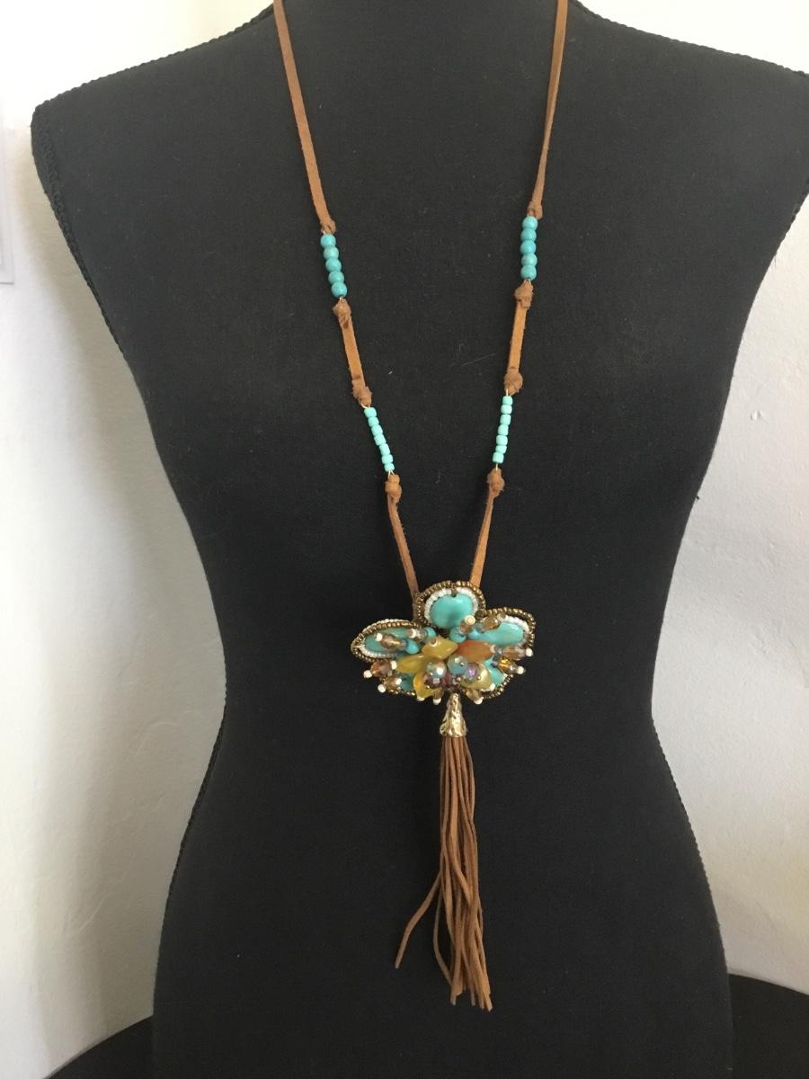 Faux leather, faux, turquoise, rhinestone flower statement, tassel necklace