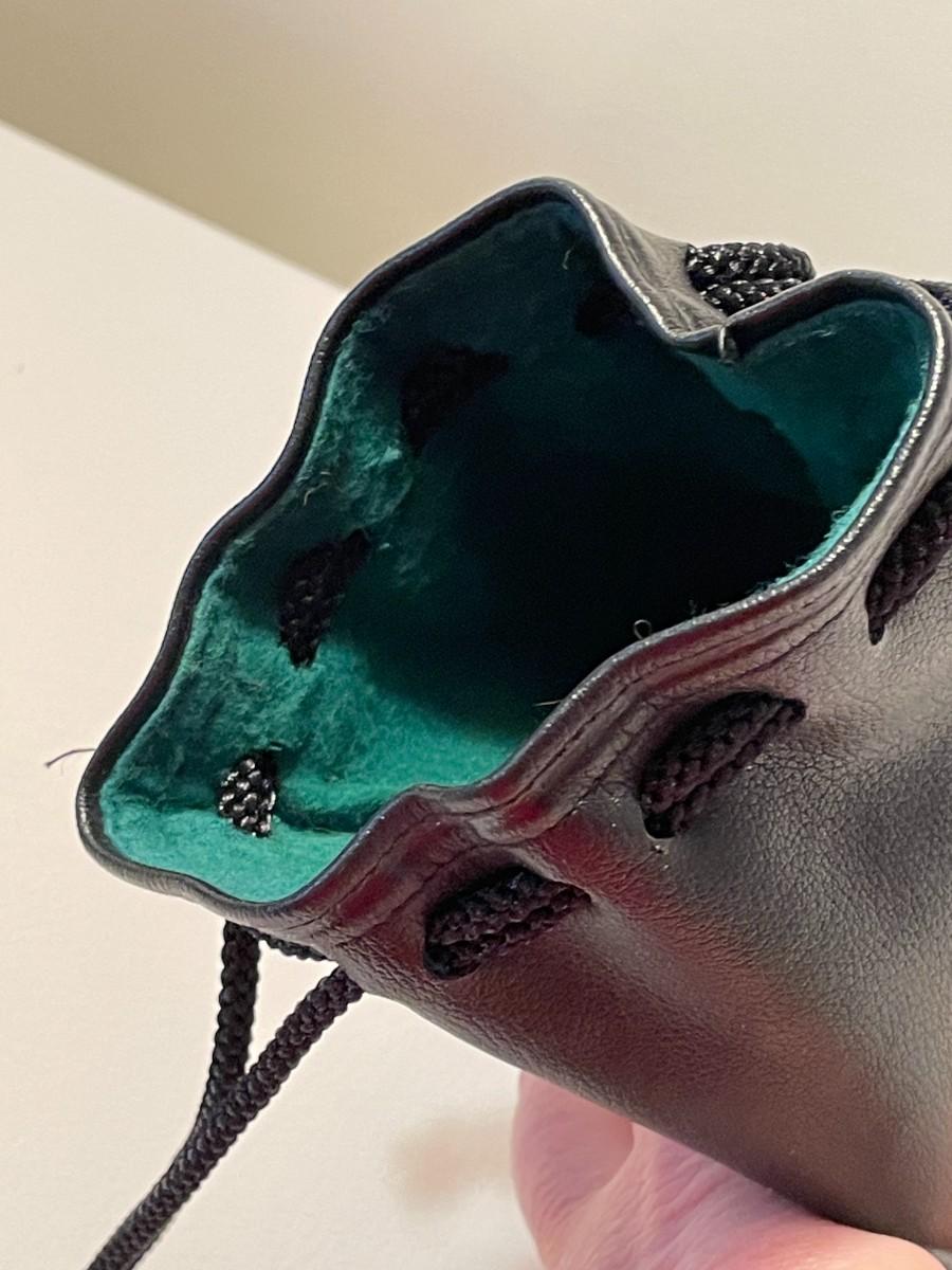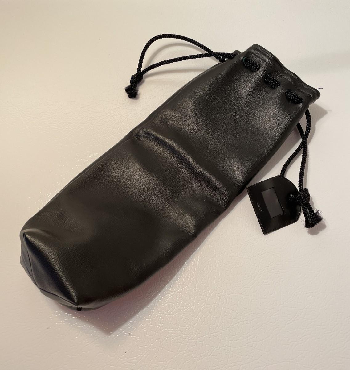 This is a great bag to dress up your bottle of wine. It is about 13 inches long, and the exterior is a faux black leather while the interior is lightly padded and has a felt like material so that the bottle slides easily in and out.