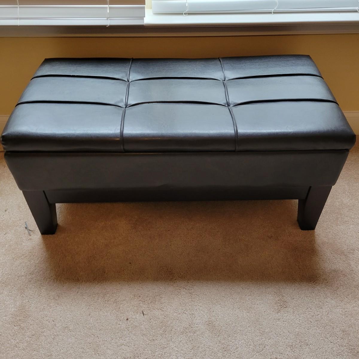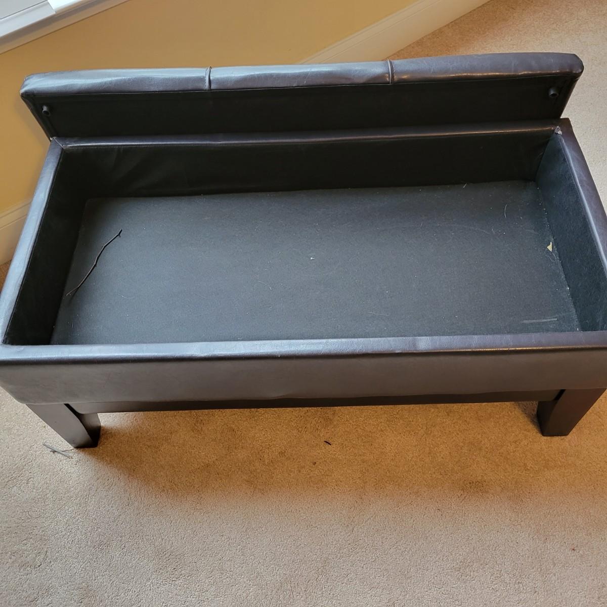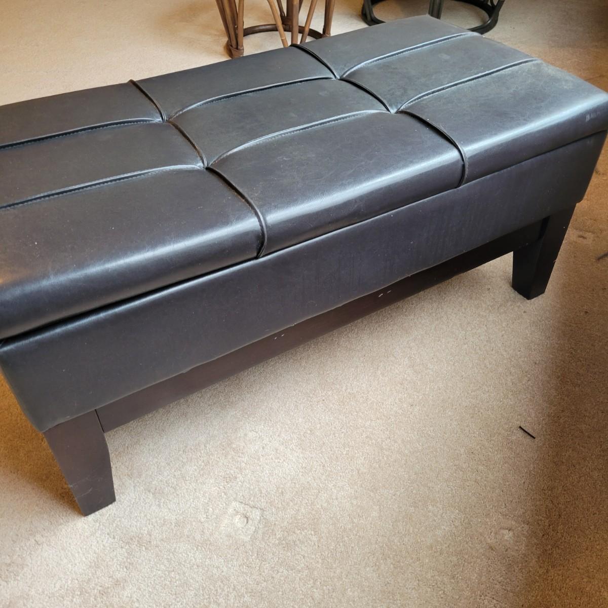 A black faux leather ottoman with a storage space inside of it. The top is completely removable to access the storage space. It has a wooden base that is stained black and there are some minor holes in the surface. Measures approximately 39.5" x 19.5" x 17.5"H. Local pickup only