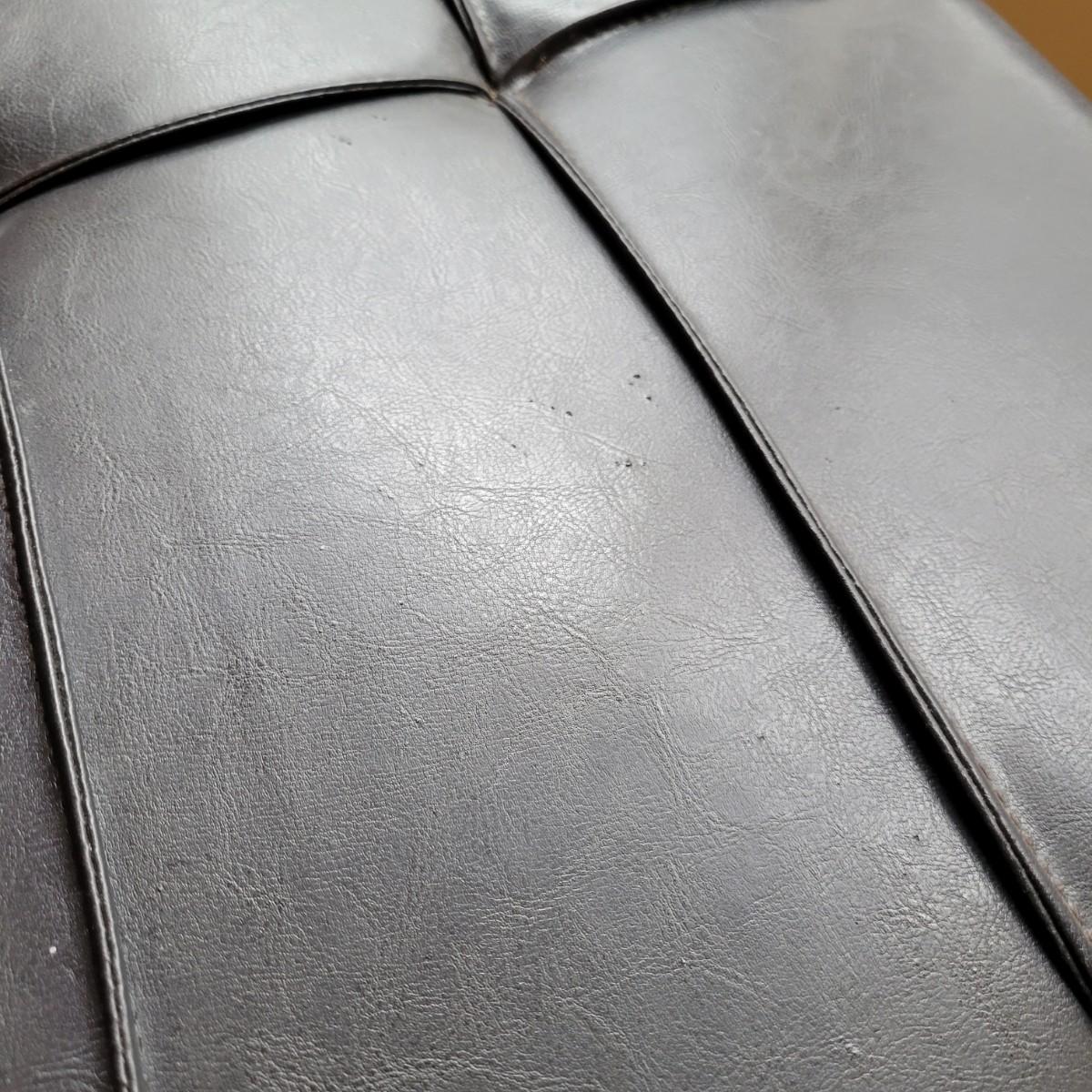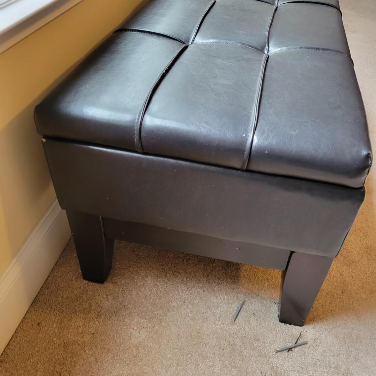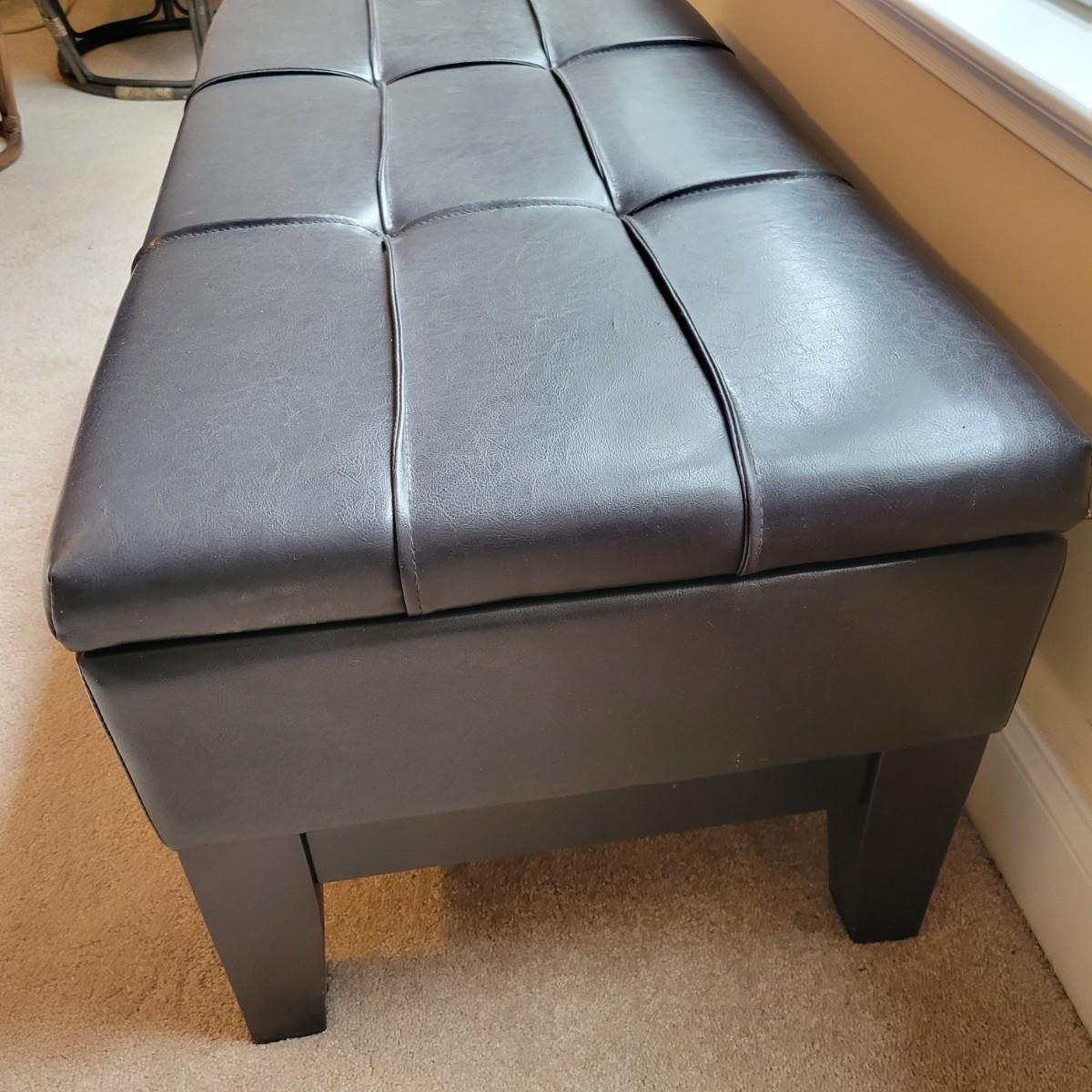A black faux leather ottoman with a storage space inside of it. The top is completely removable to access the storage space. It has a wooden base that is stained black and there are some minor holes in the surface. Measures approximately 39.5" x 19.5" x 17.5"H. Local pickup only