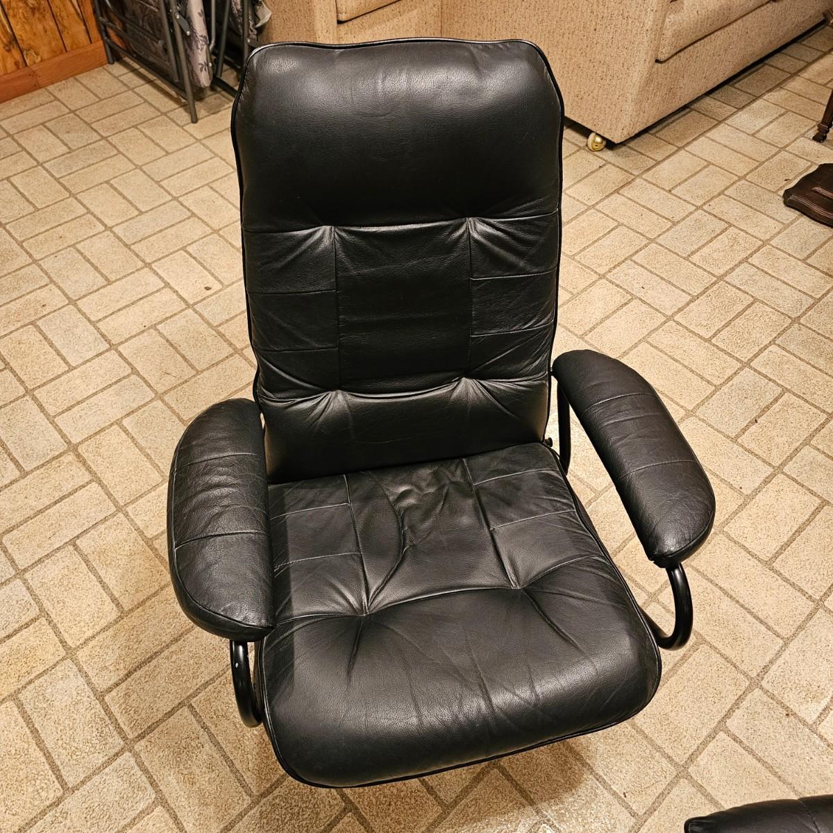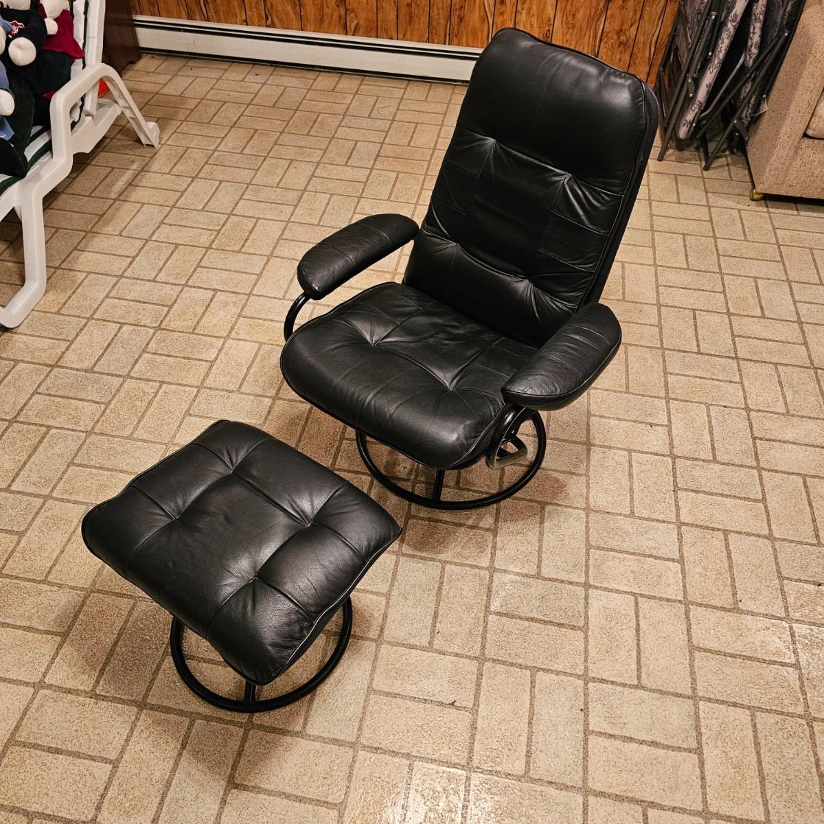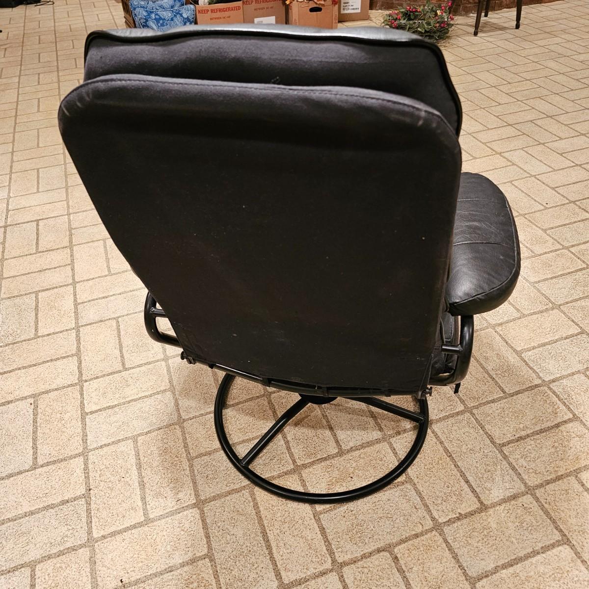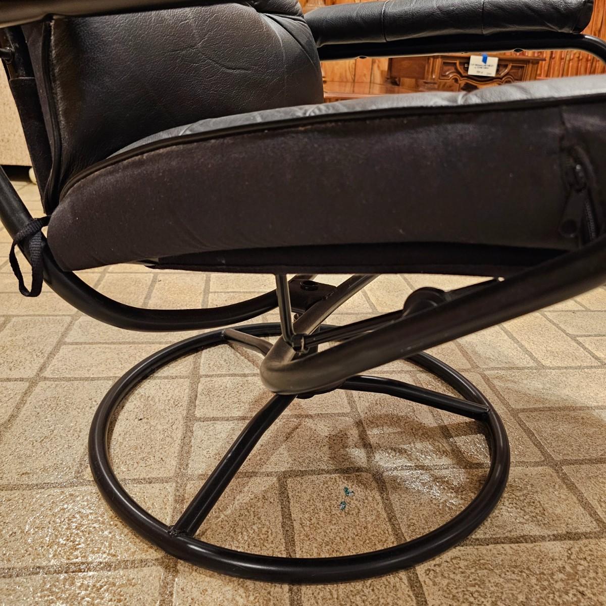 Black vinyl/faux leather chair and ottoman. Chair copies the stressless style, reclines back and swivels. Metal base and frame on both. Chair measures 29" x 29" x 38"H, seat height 18". Lays out to 42" open. Ottoman is 20" x 16" x 15"H. See photos for details. Local pickup only.