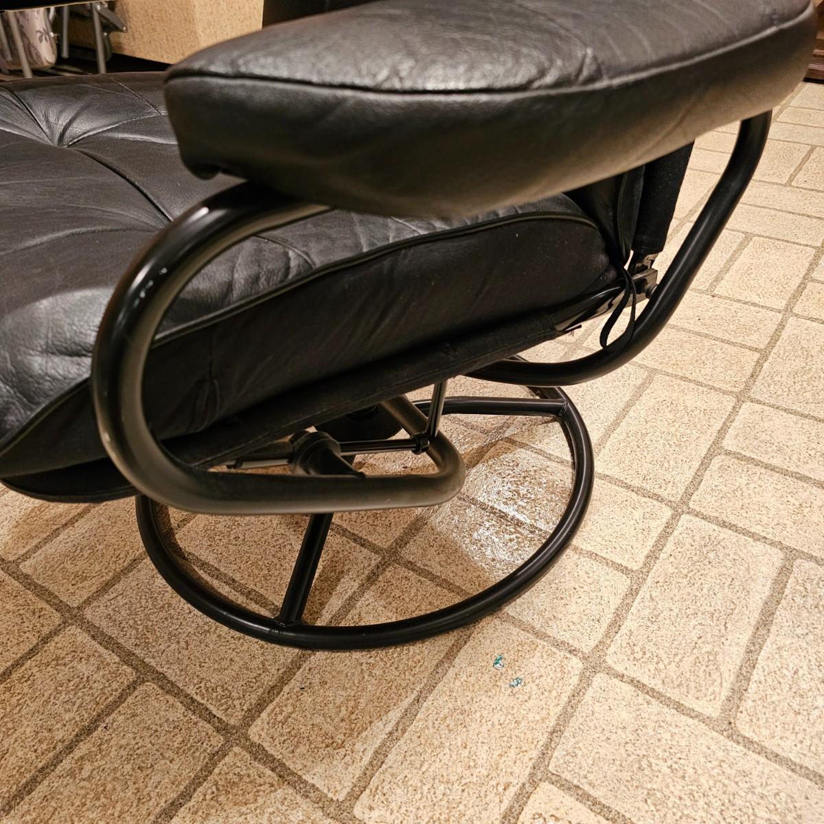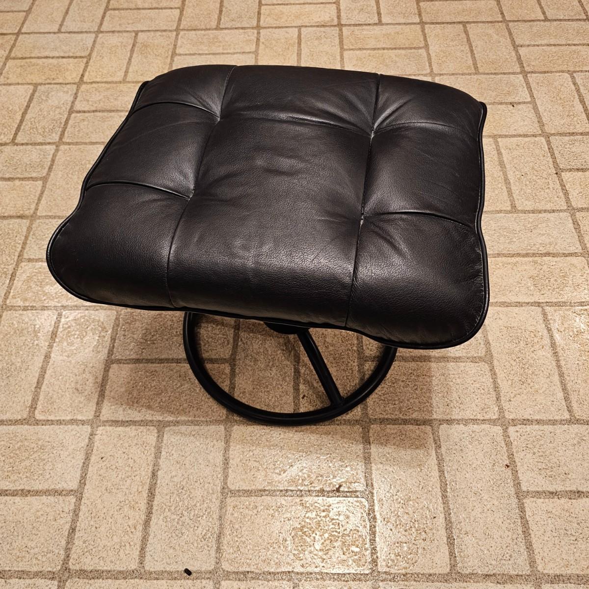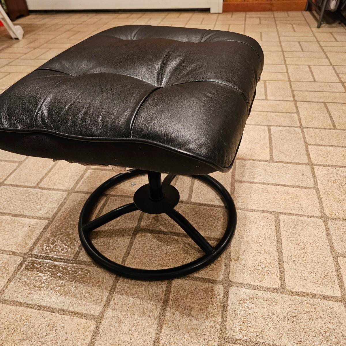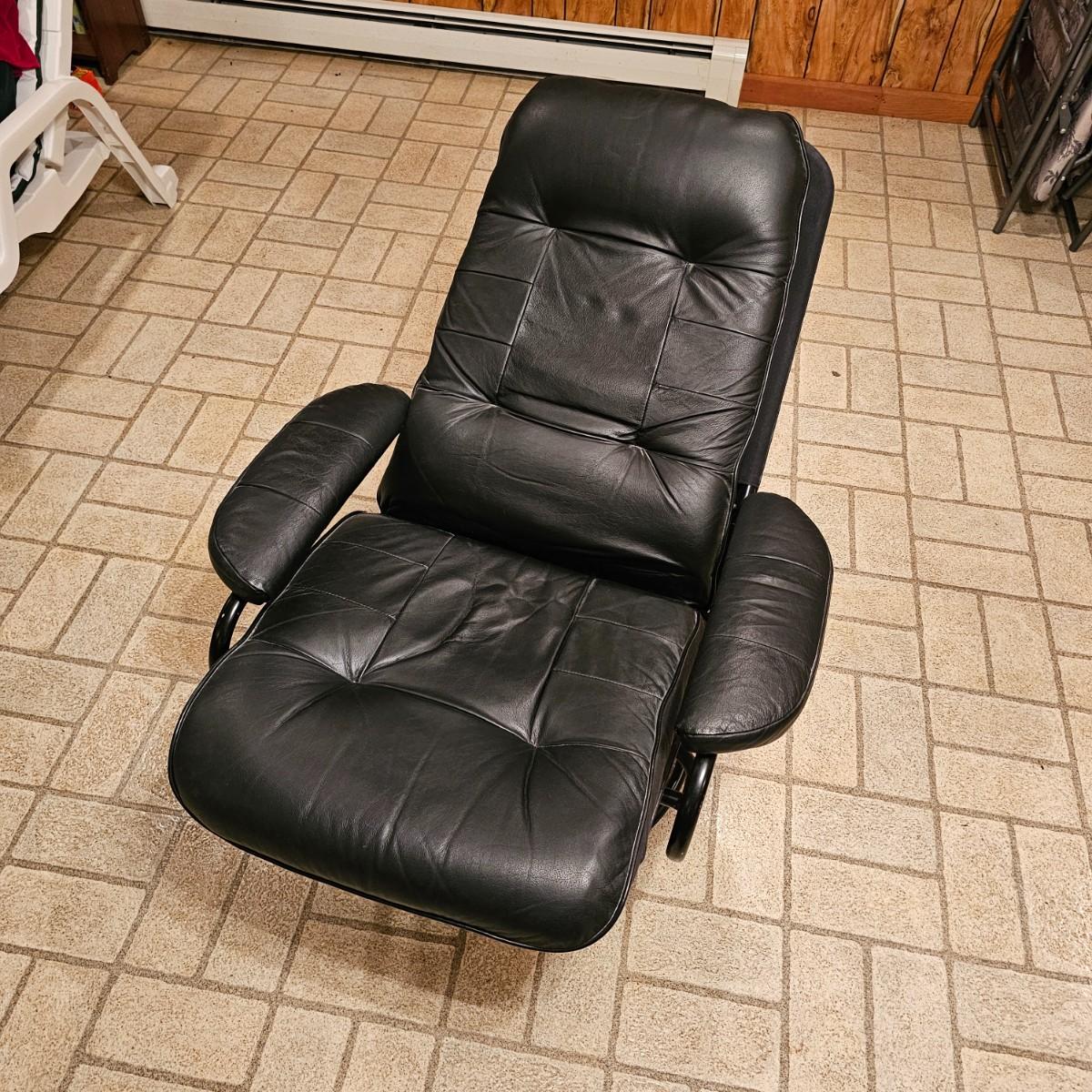Black vinyl/faux leather chair and ottoman. Chair copies the stressless style, reclines back and swivels. Metal base and frame on both. Chair measures 29" x 29" x 38"H, seat height 18". Lays out to 42" open. Ottoman is 20" x 16" x 15"H. See photos for details. Local pickup only.