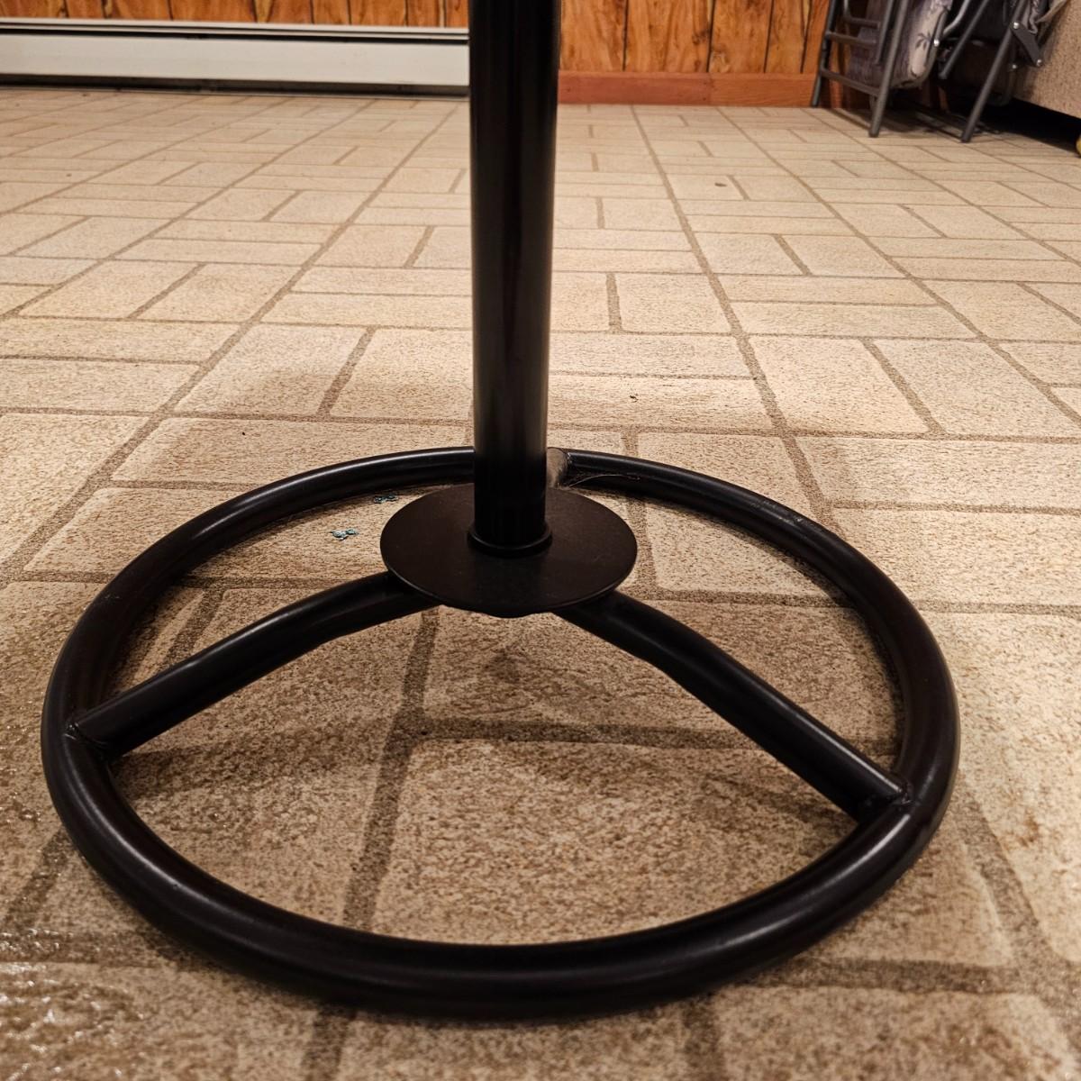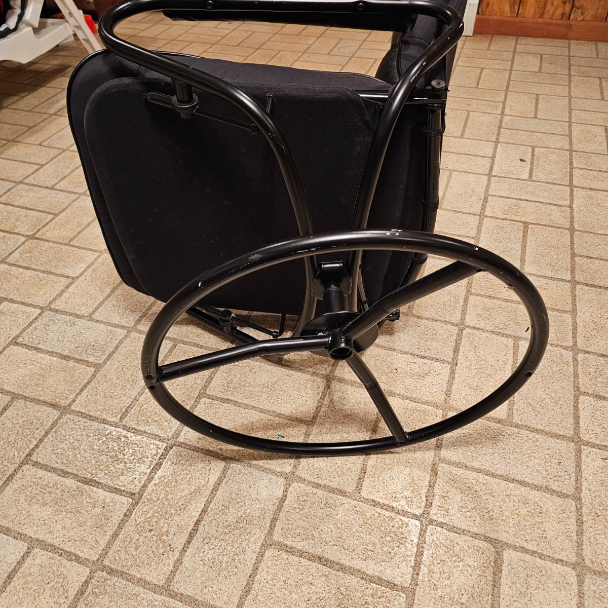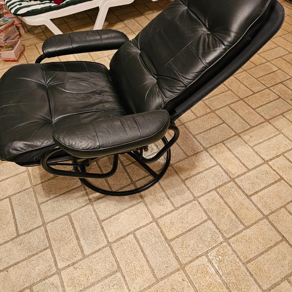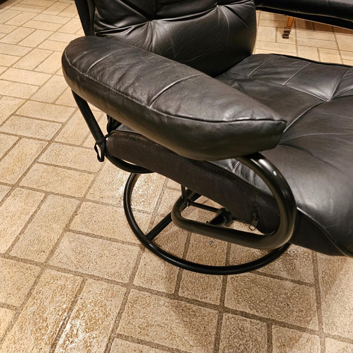 Black vinyl/faux leather chair and ottoman. Chair copies the stressless style, reclines back and swivels. Metal base and frame on both. Chair measures 29" x 29" x 38"H, seat height 18". Lays out to 42" open. Ottoman is 20" x 16" x 15"H. See photos for details. Local pickup only.