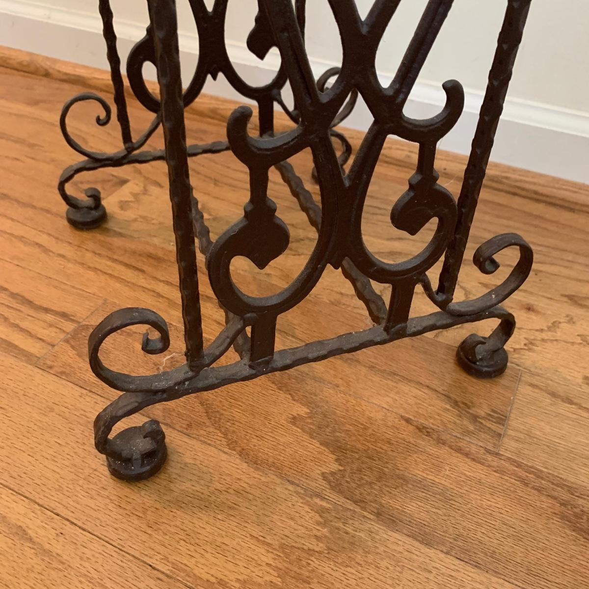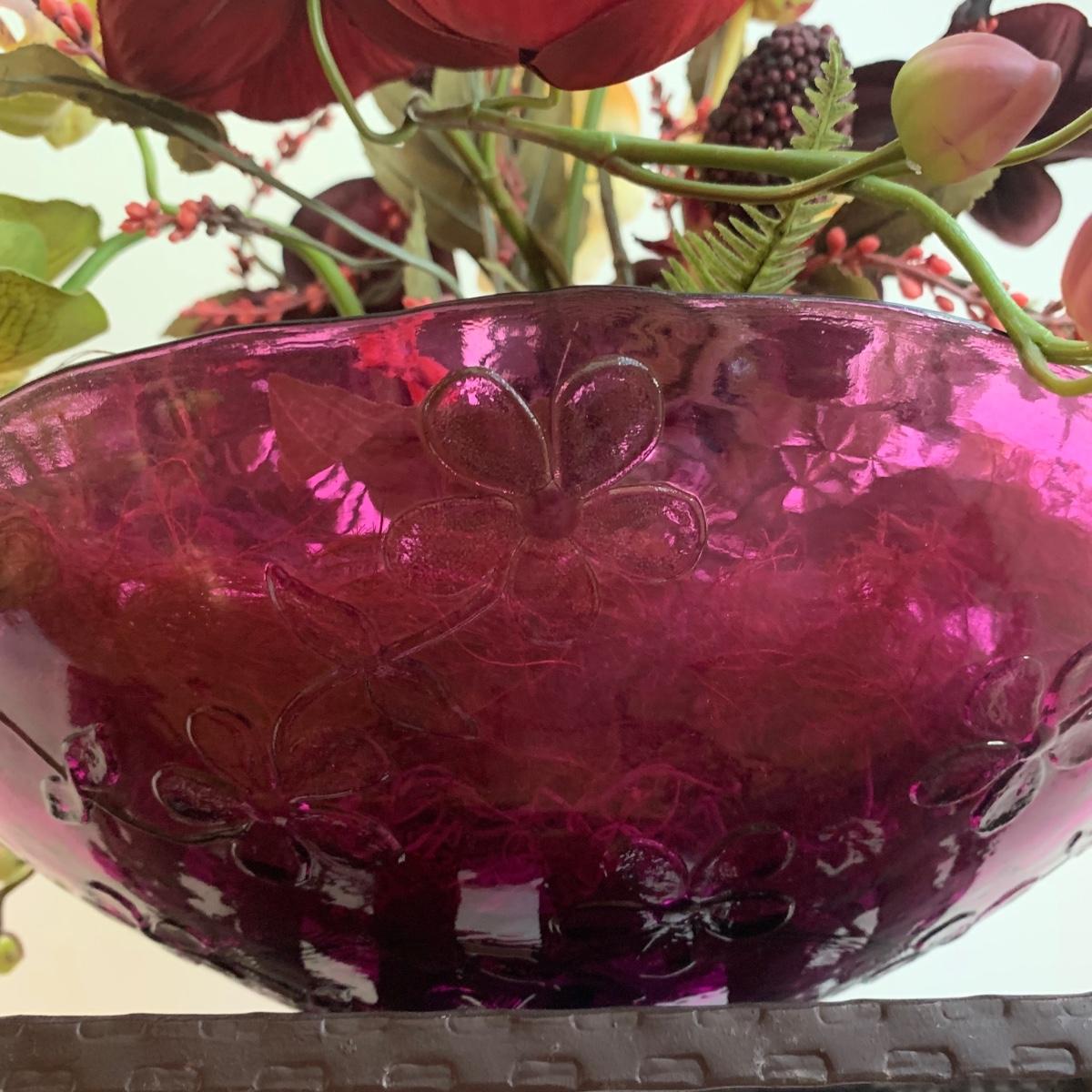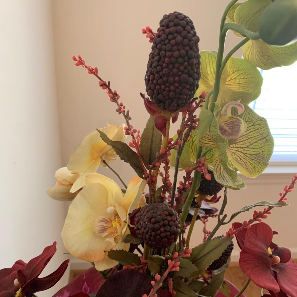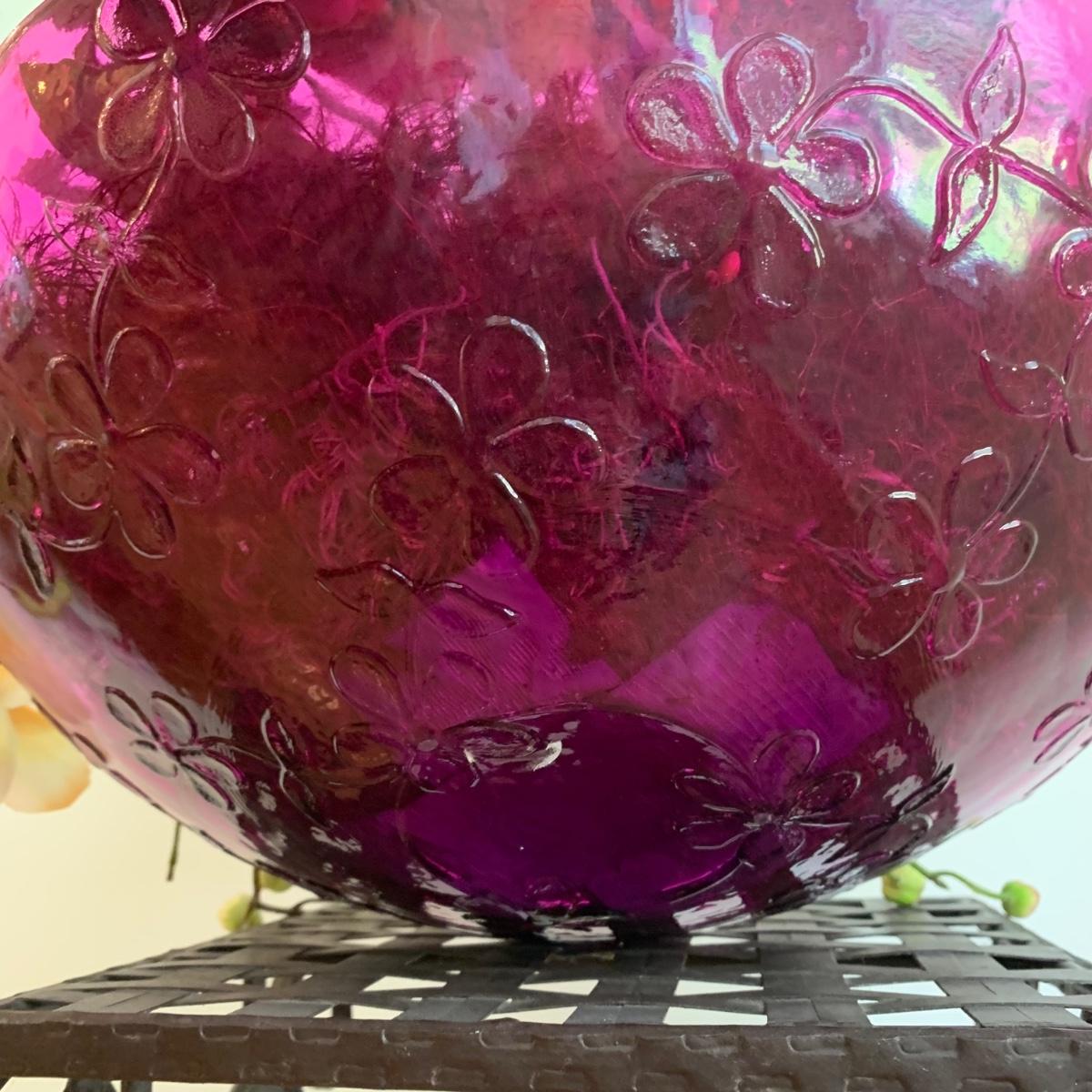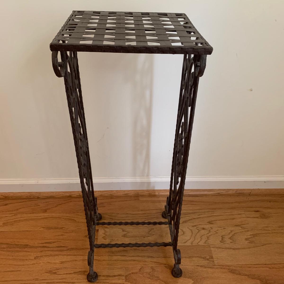 This lovely faux orchid flower arrangement comes in a pink floral glass dish. The wide point of the dish is about 14” in diameter. The floral arrangement is approximately 23” tall. The stand is made of a sturdy metal. It features a woven surface and ornately decorated sides. It measures 11” x 11” x 29”. Both items appear to be in great condition. Local pickup only.