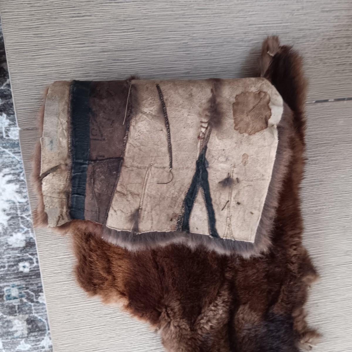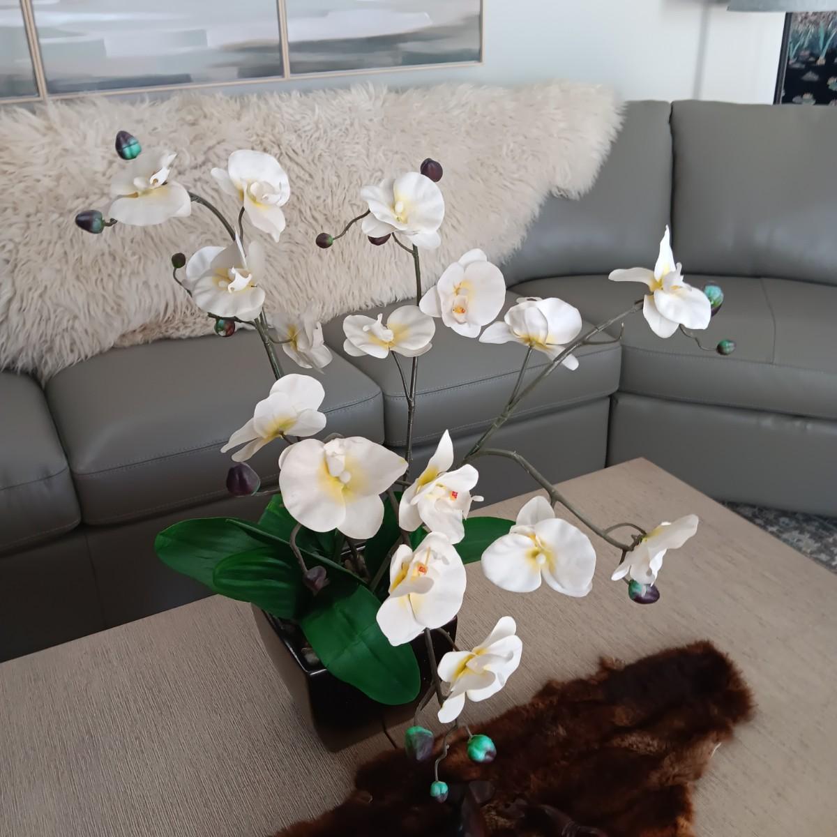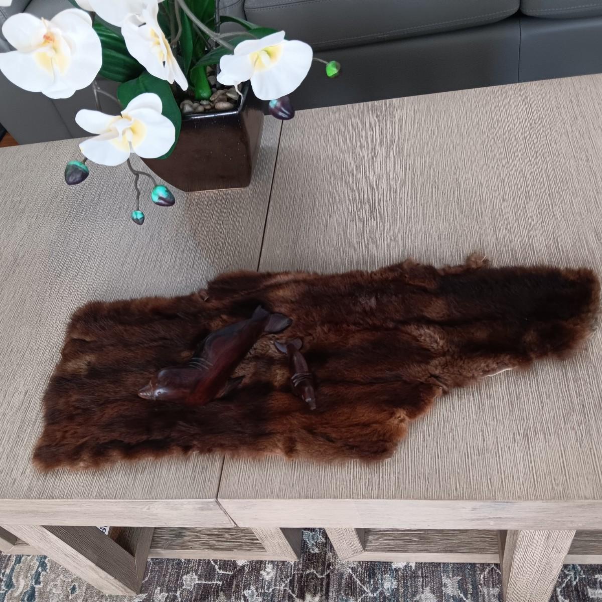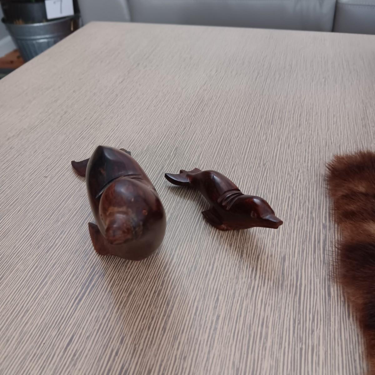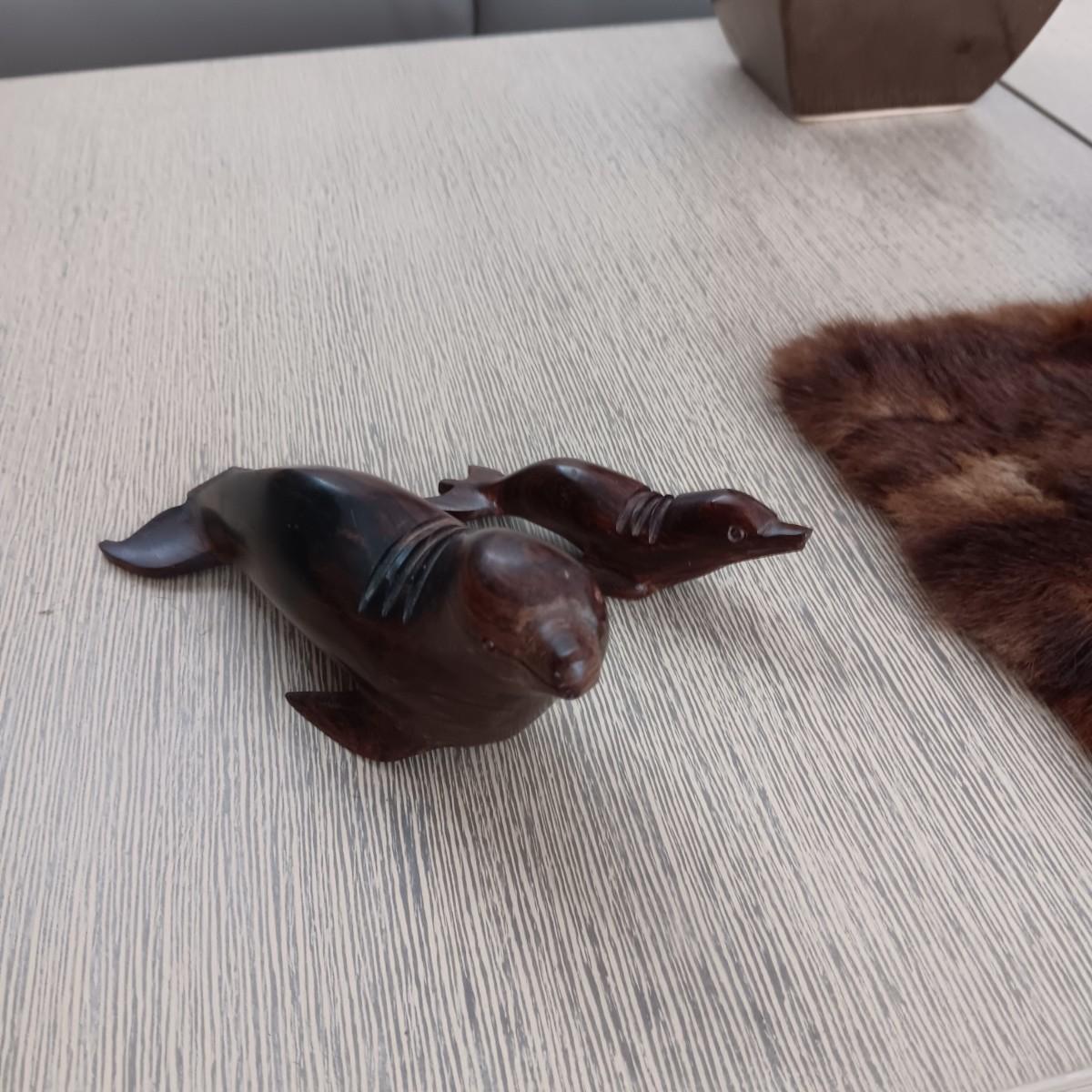 FAUX ORCHID IN CERAMIC POT, CARVED WOODEN SEALS AND AN ANIMAL PELT