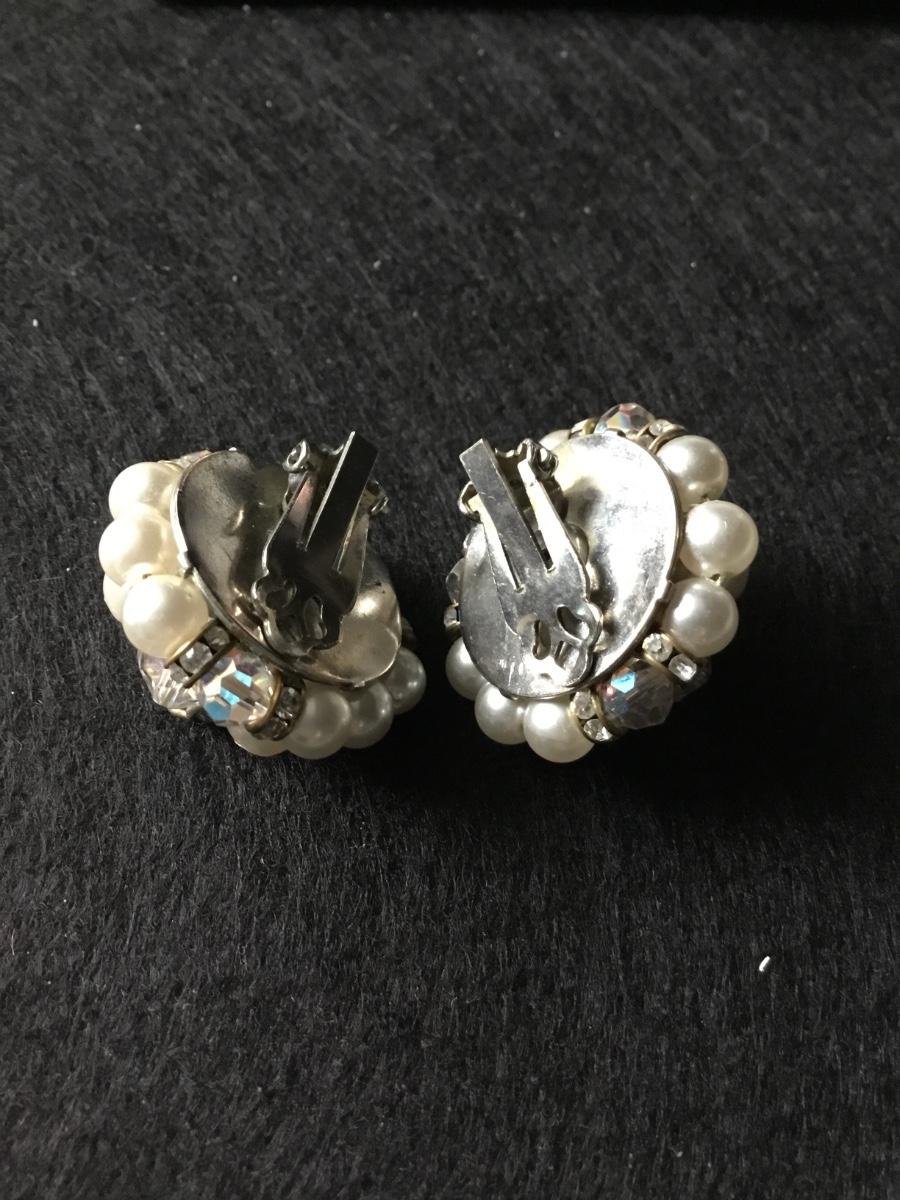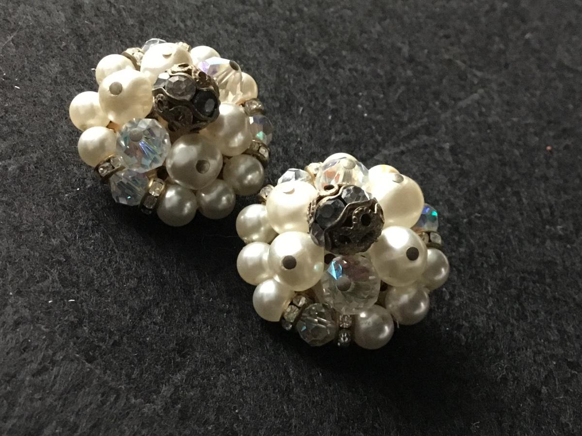 Faux pearl and aurora borealis crystal type beaded cluster clip on earrings vintage