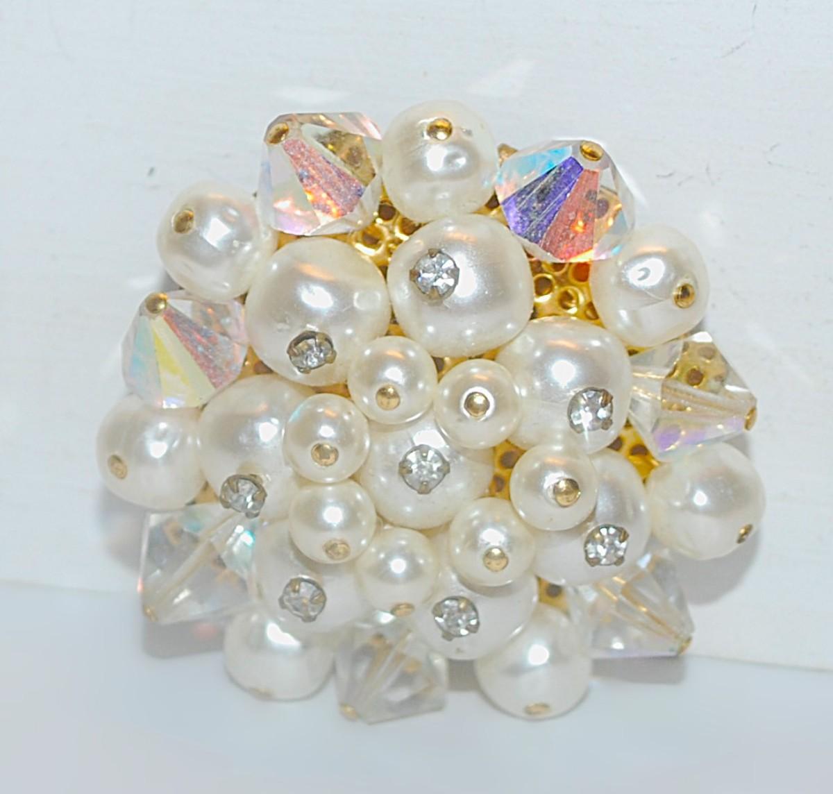 Faux Pearl BROOCH (1¾" Diam.) with Clear Stone "Tips" and Iridescent Prism Beads with Dark Gold Tone Setting