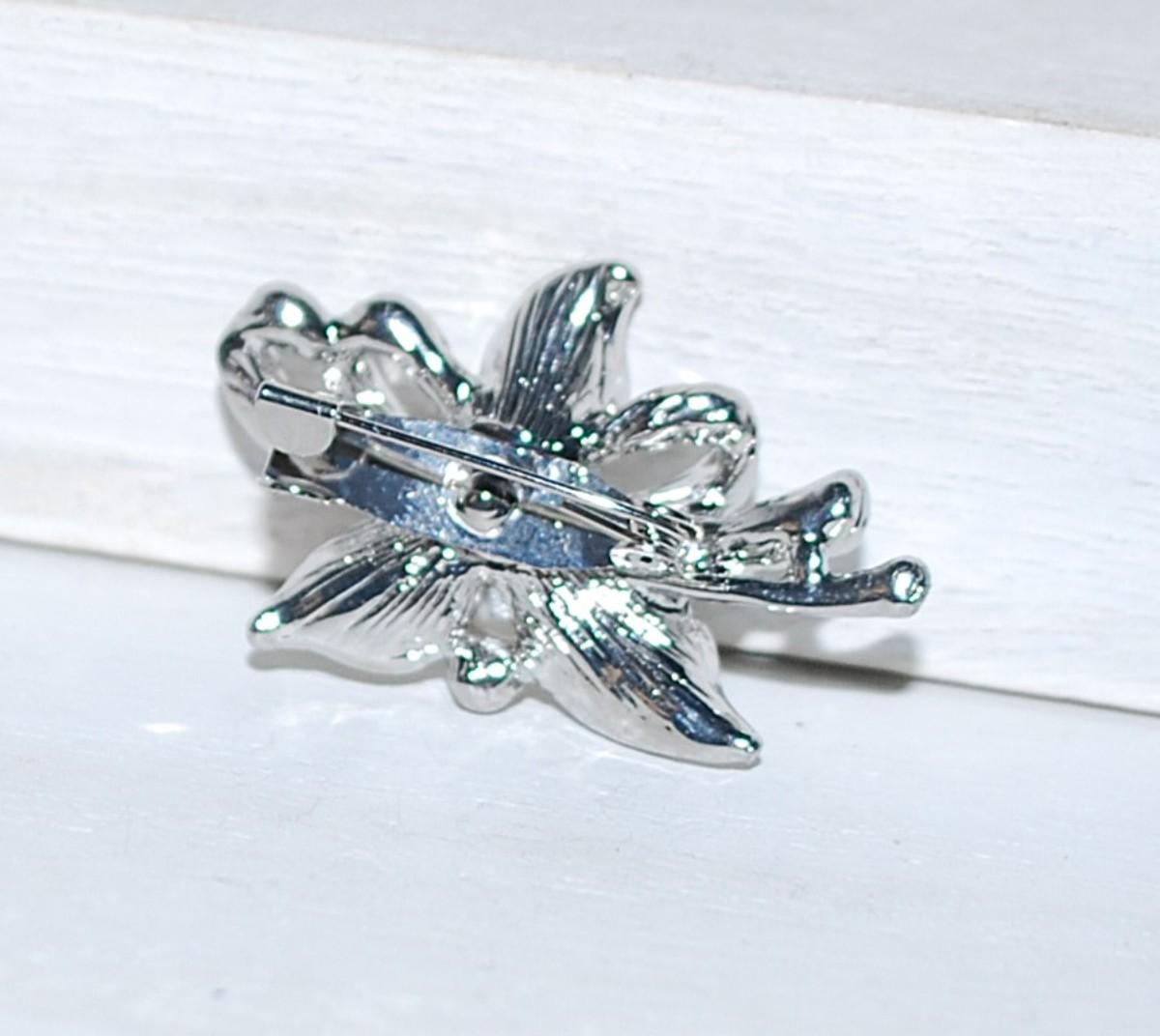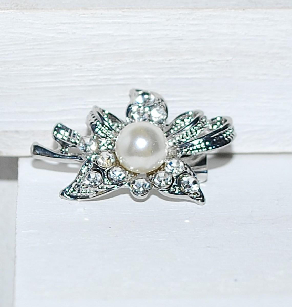 Faux PEARL Center Bowtie and 11 Accents Clear Stones BROOCH (1¼" x ¾") on a Silver Tone Setting