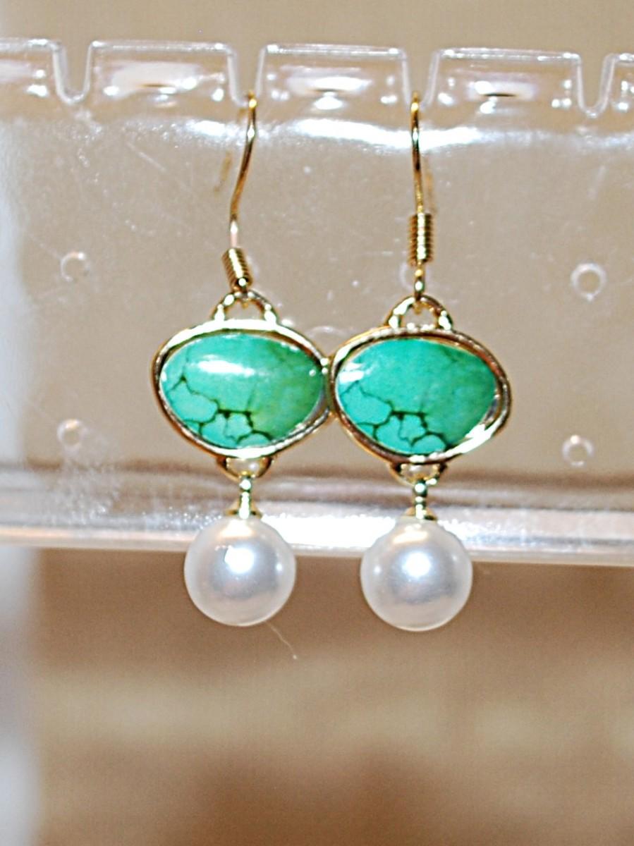Faux Pearl & Green Jade Style Earrings Set with Wire Hook Clasps