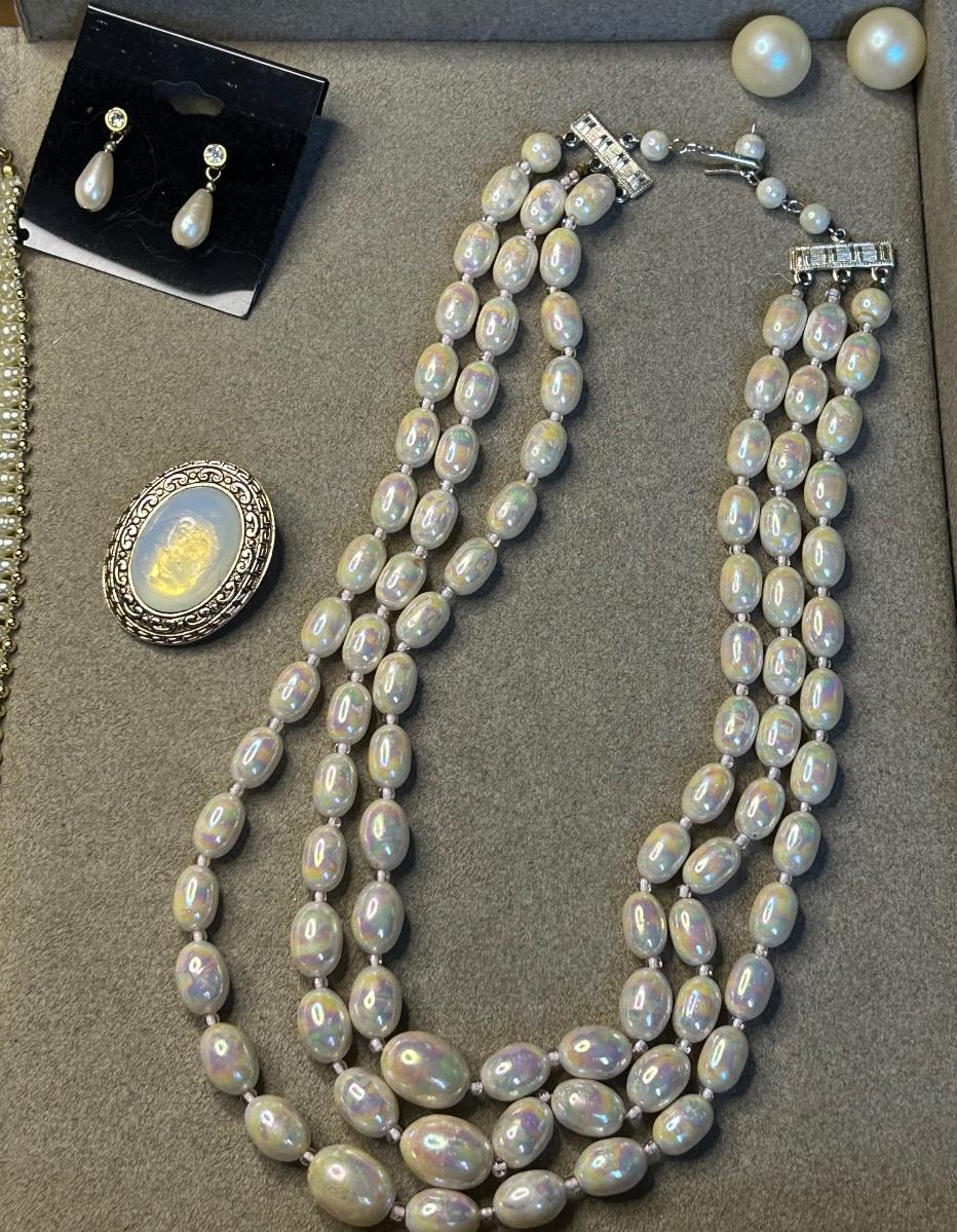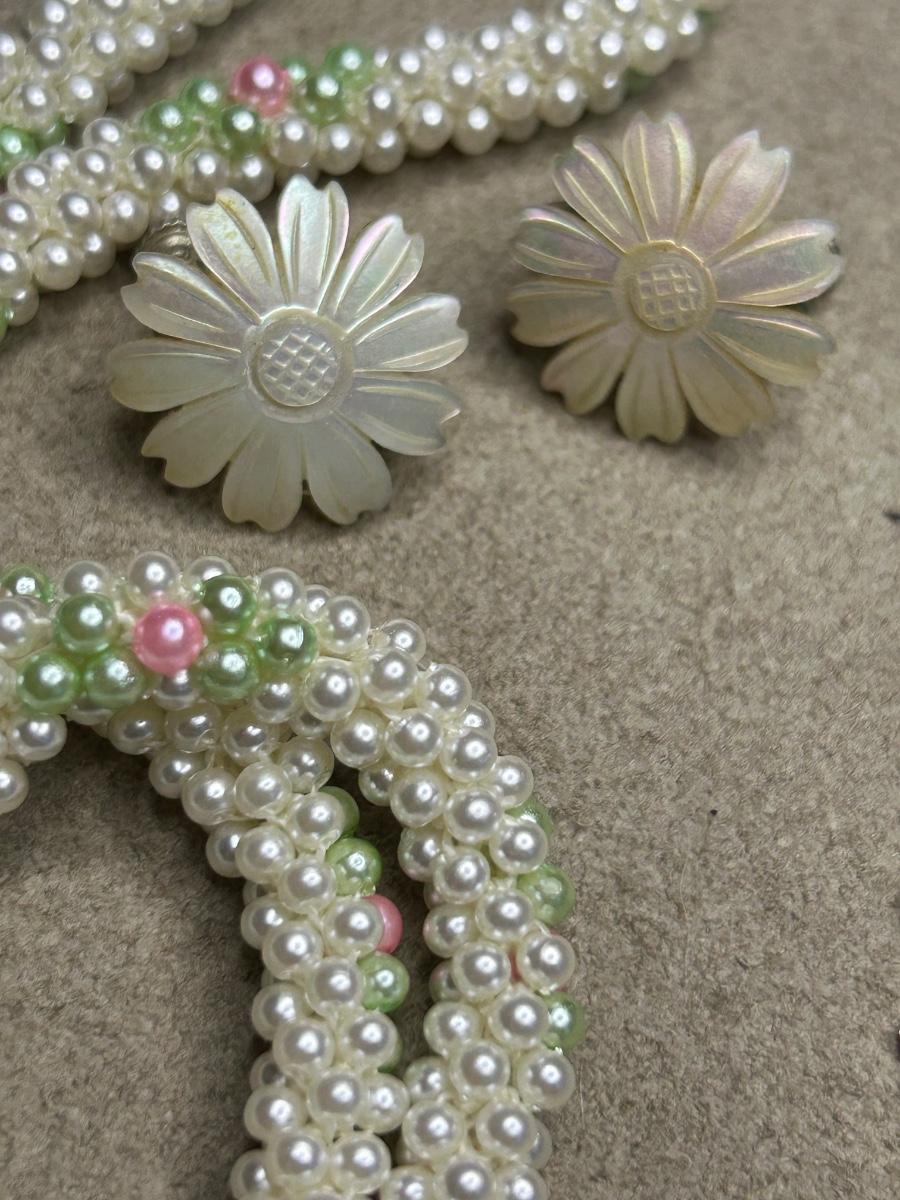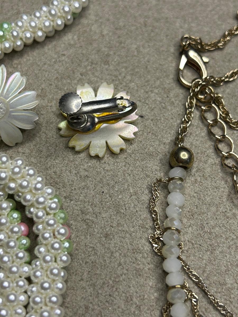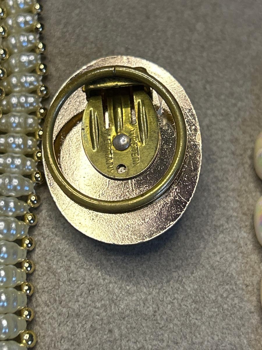 The flower earrings are clips & the rest are pierced. The oval piece is a scarf clip & is stamped western Germany, the triple strand necklace is stamped Japan.