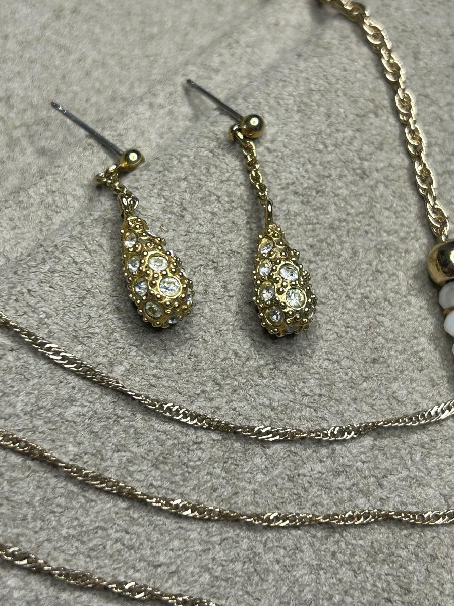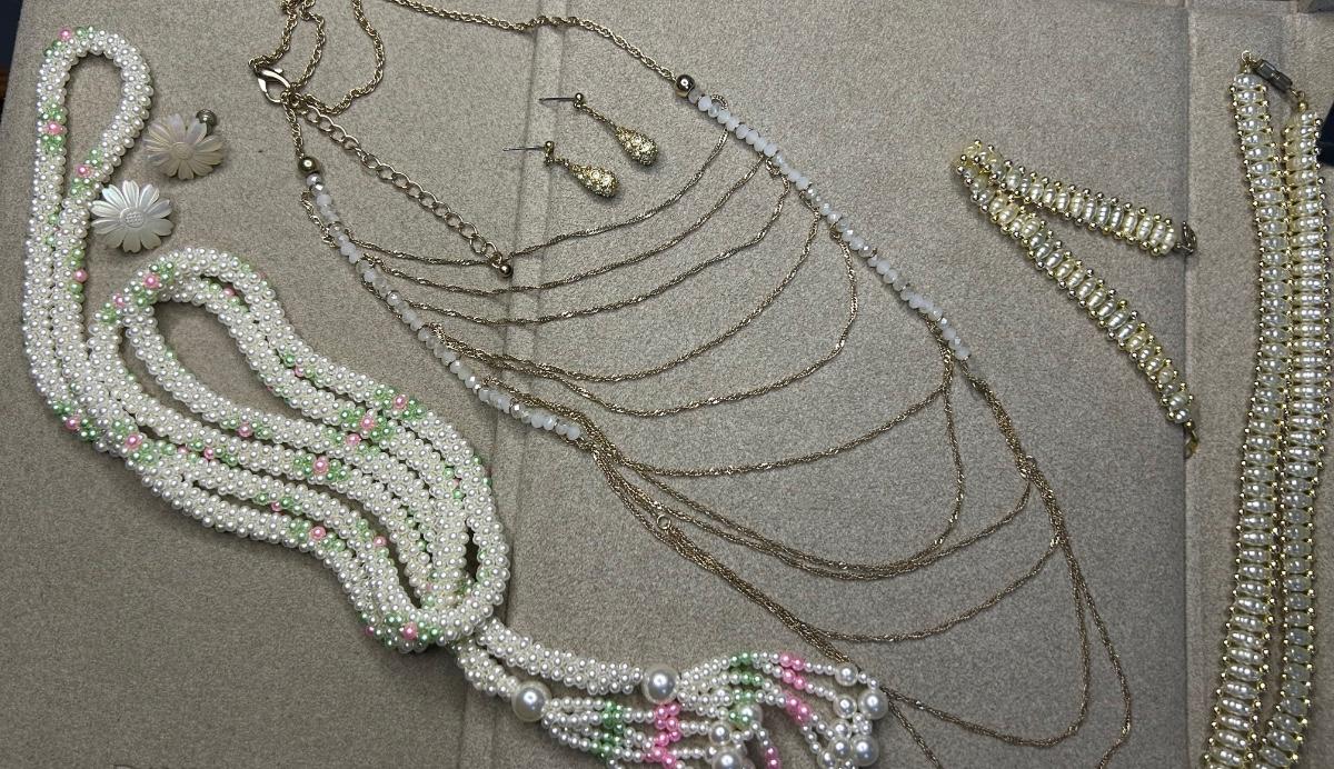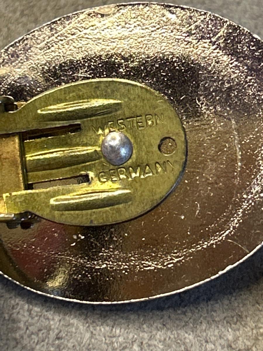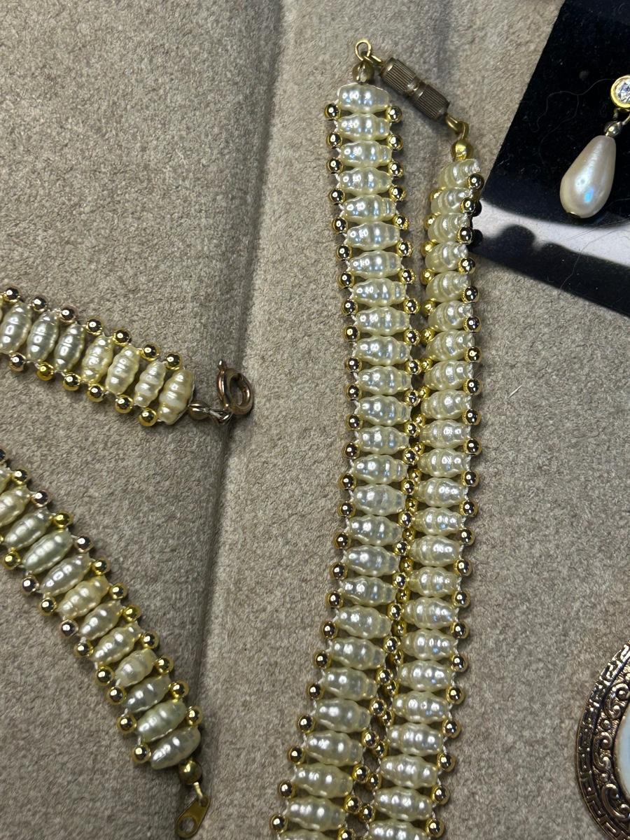 The flower earrings are clips & the rest are pierced. The oval piece is a scarf clip & is stamped western Germany, the triple strand necklace is stamped Japan.