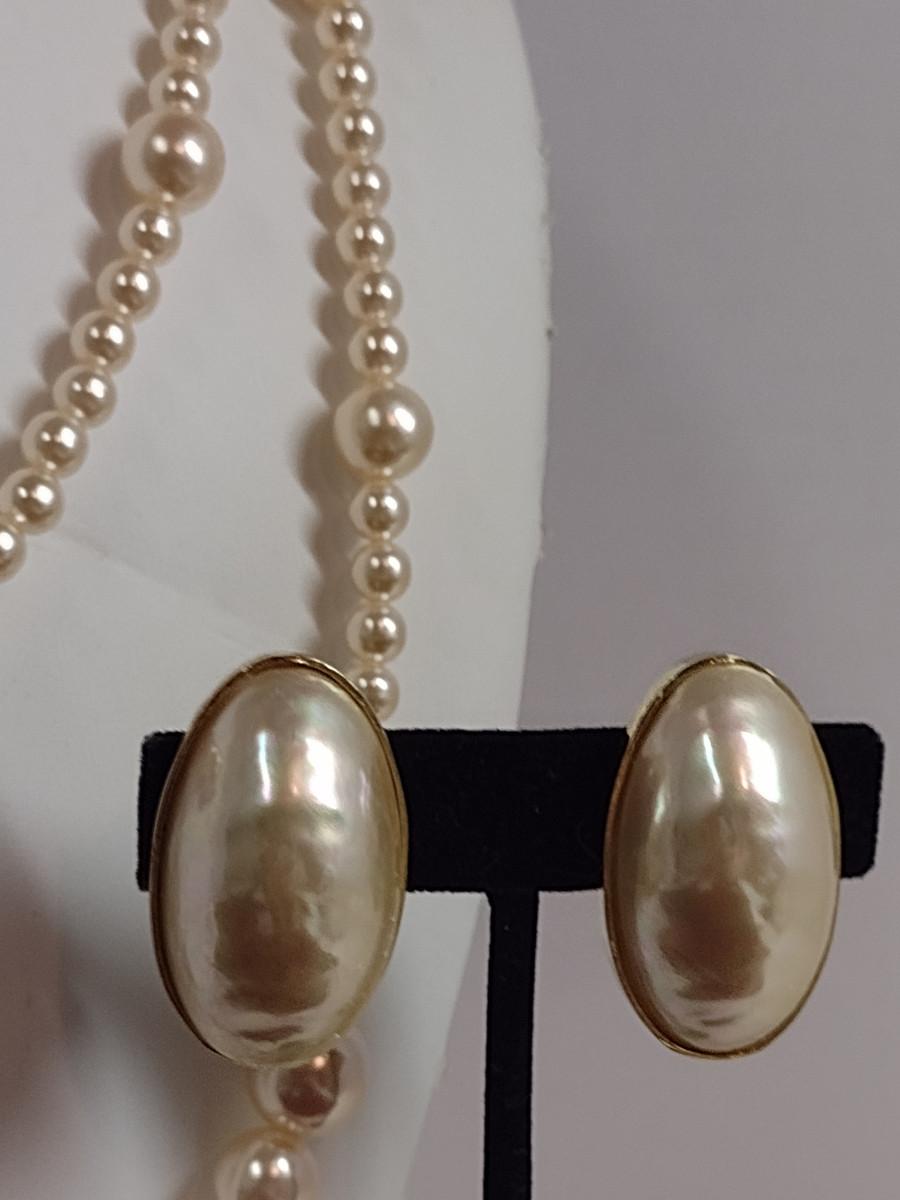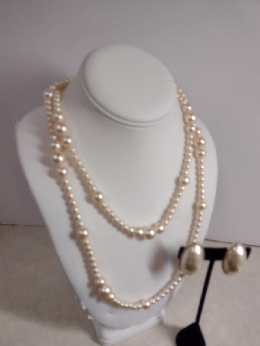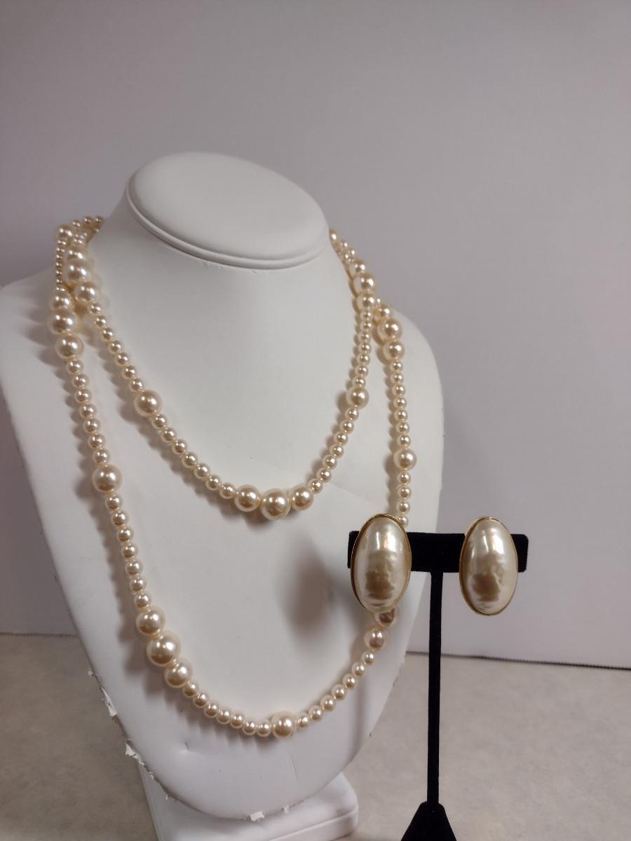 Faux Pearl Necklace and Earring Set (#28). Necklace approx 41" long. Earrings marked 'KJL'. Earrings are clip-on.
