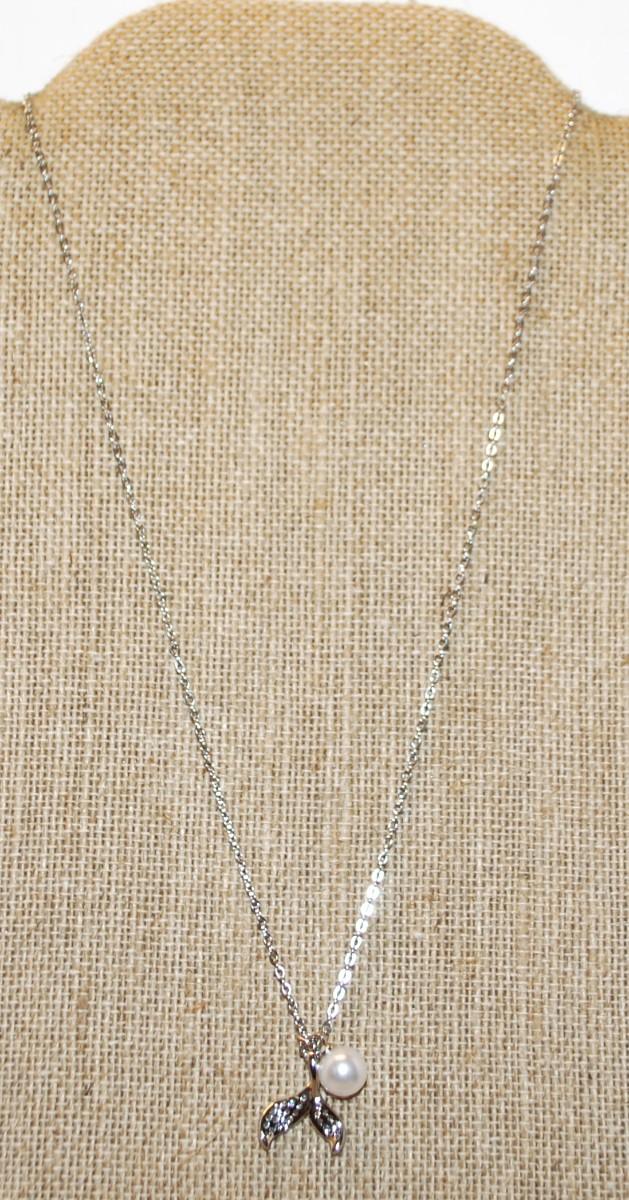 Faux "Pearl & Whale Tail" PENDANT on a Silver Tone Necklace Chain 17" L