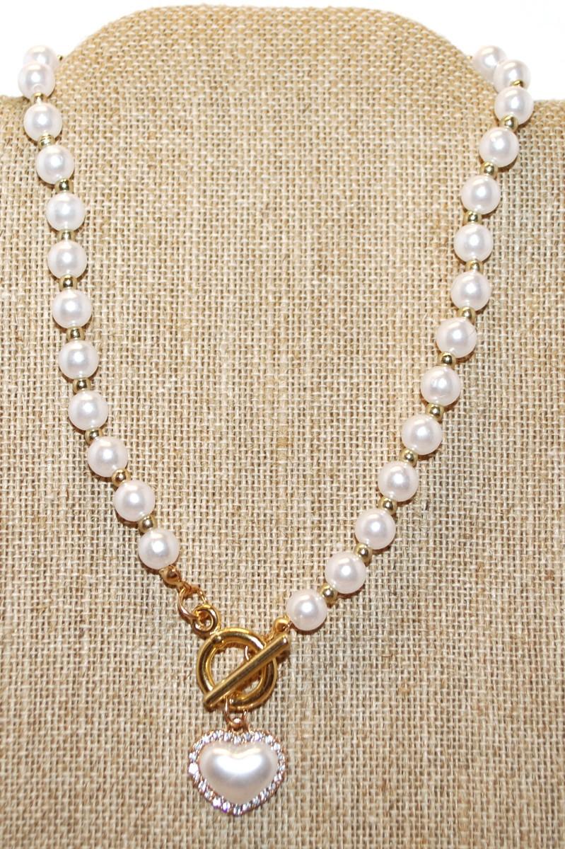 Faux Pearls & Pearl Styled Heart Necklace Choker & PENDANT (¾" x ½") with Toggle Clasp 12" L