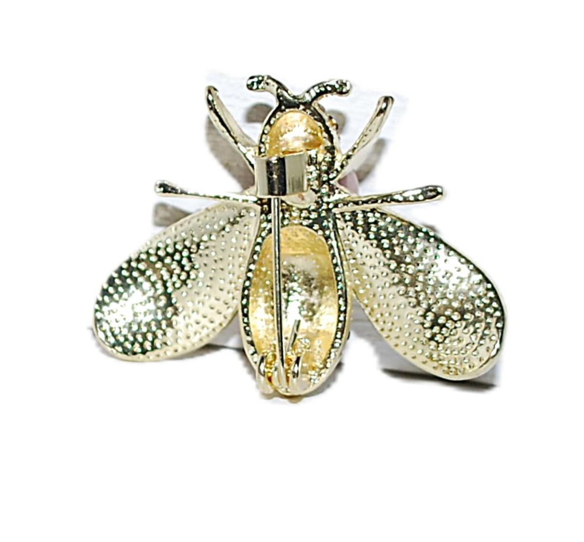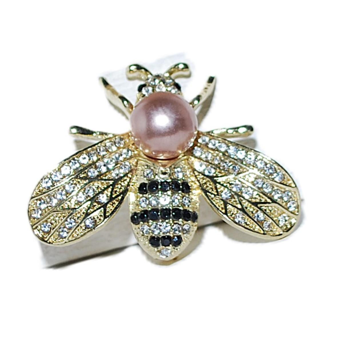 Faux PINK PEARL BUMBLEBEE BROOCH (1½" x 1¼") with Glitter Stone Wings and Black Stones Body Stripes on a Gold Tone Setting