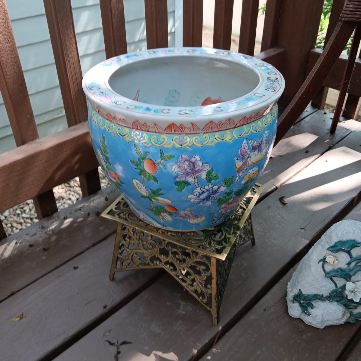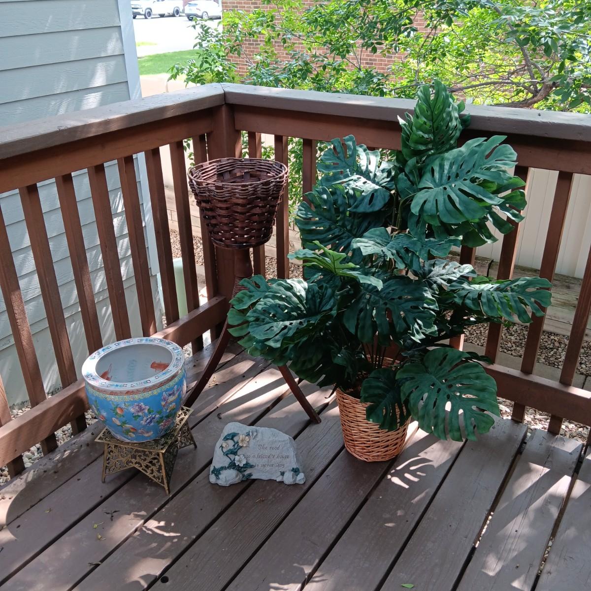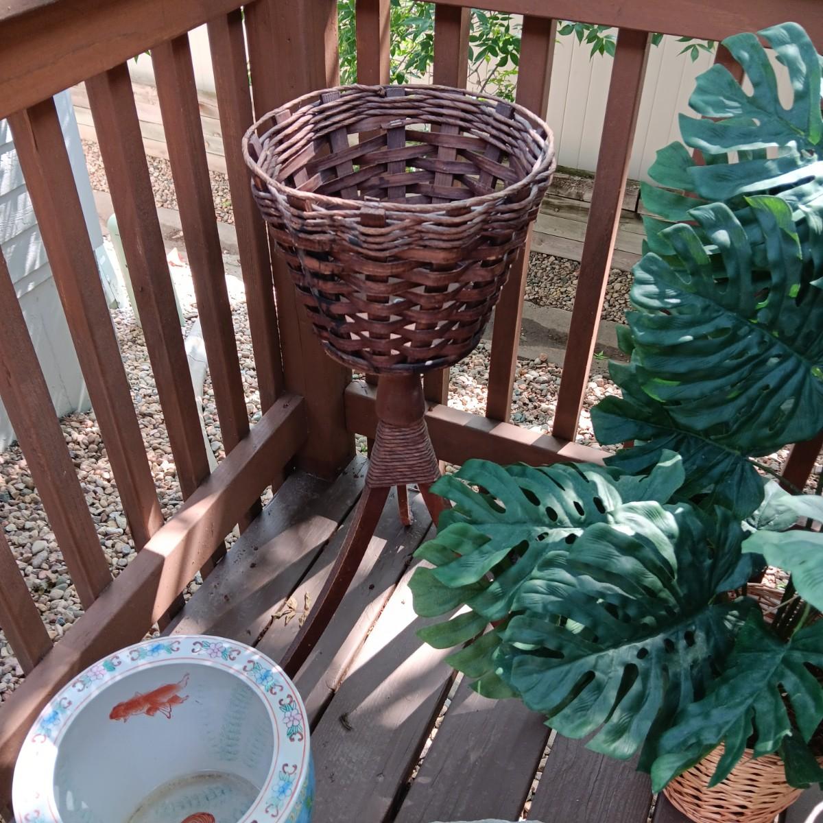 FAUX PLANT, BRASS PLANT STAND, KOI THEMED PLANTER, FAKE ROCK W/WORDS AND A WICKER PLANT STAND