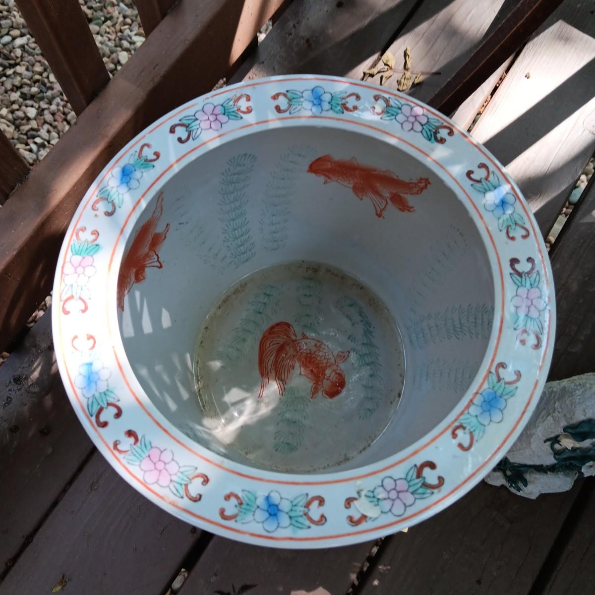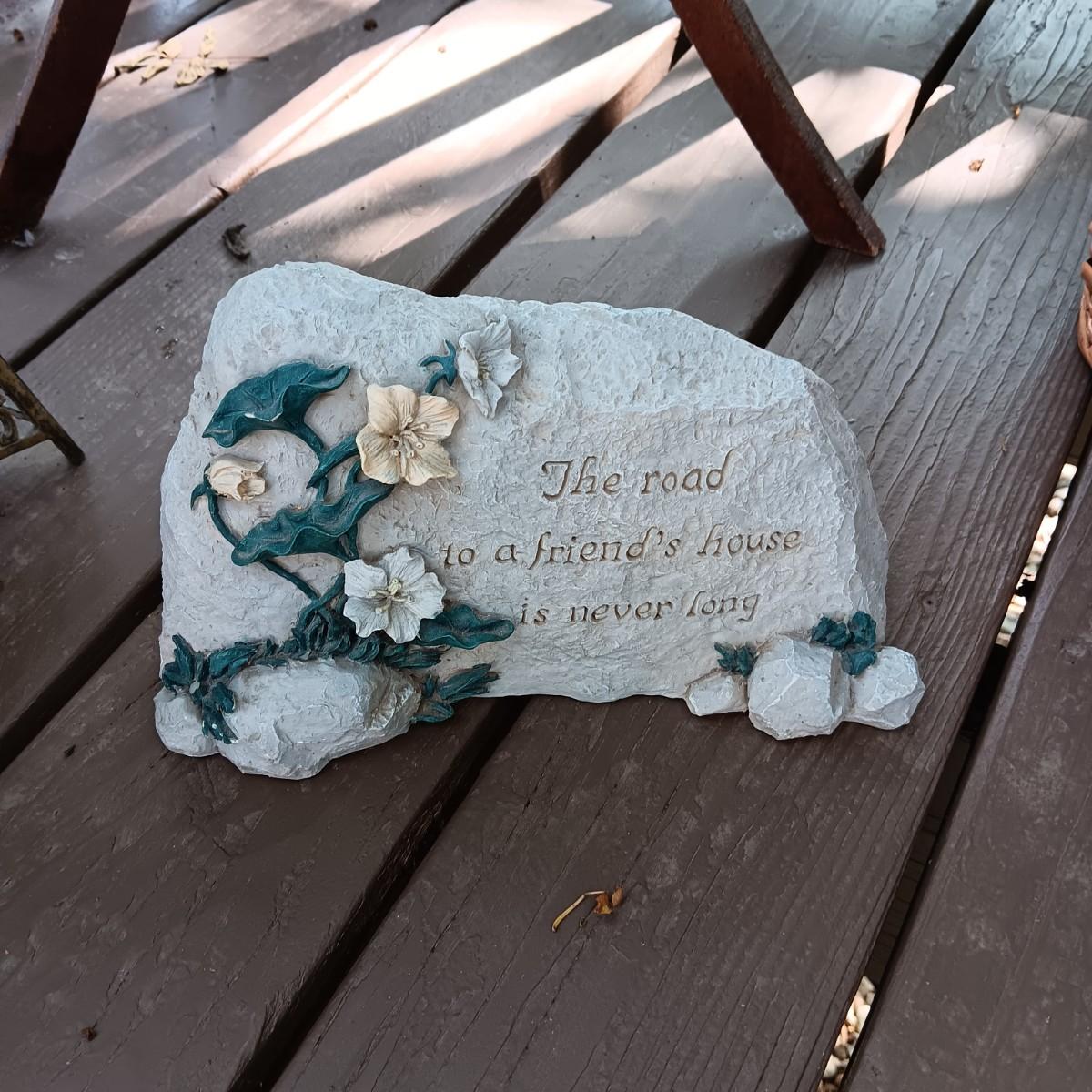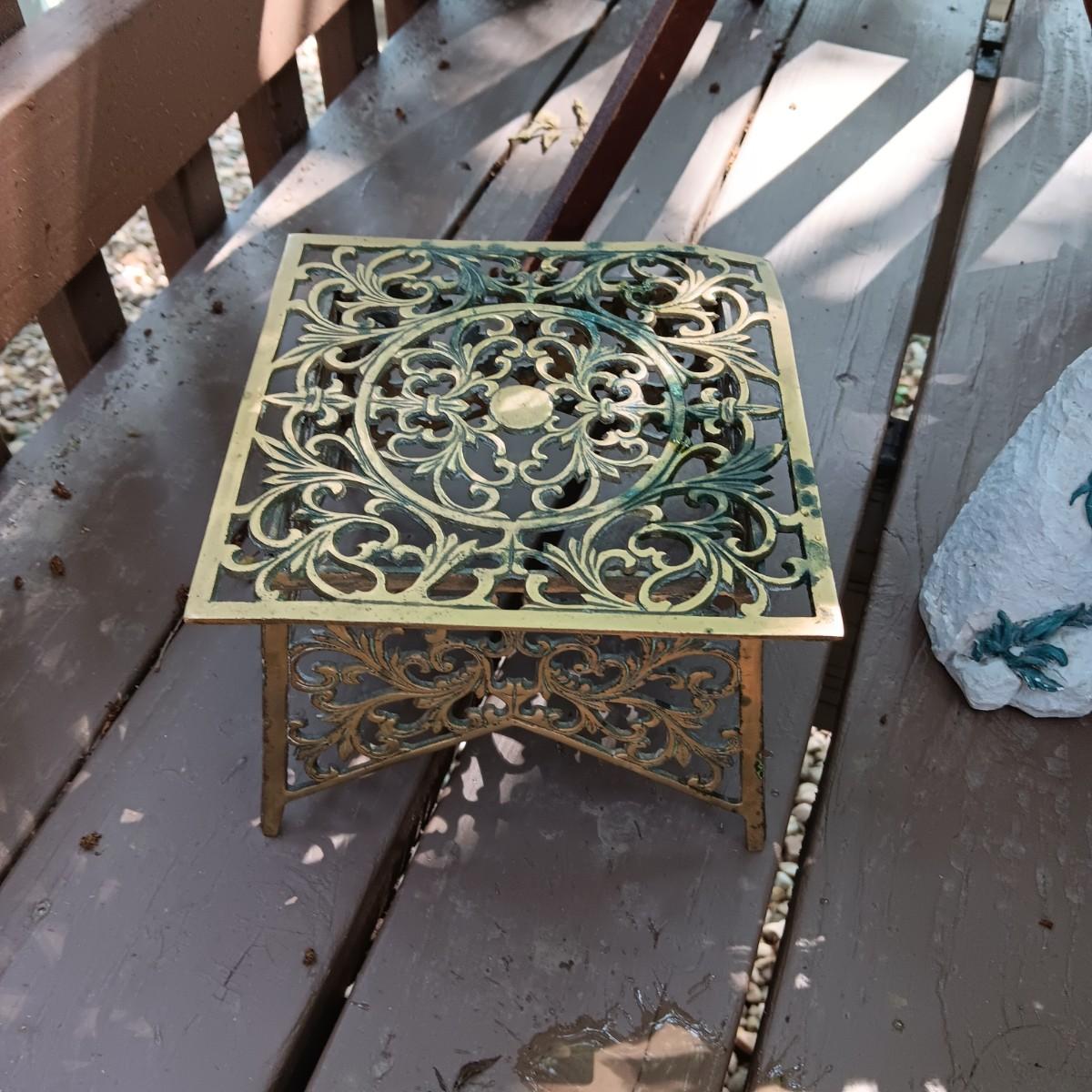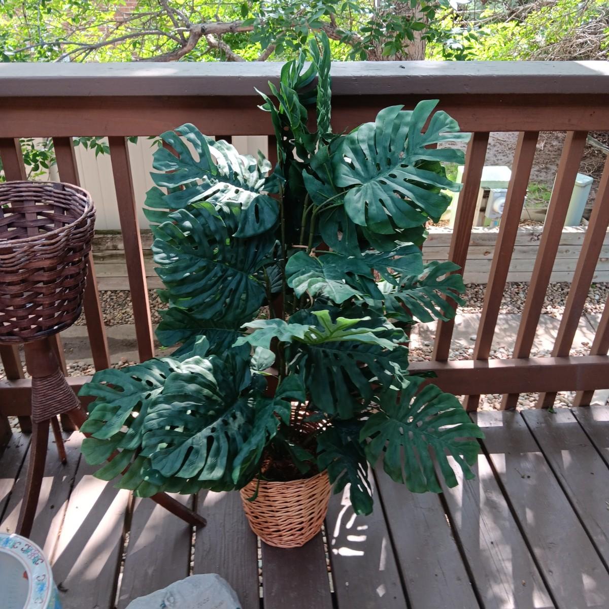 FAUX PLANT, BRASS PLANT STAND, KOI THEMED PLANTER, FAKE ROCK W/WORDS AND A WICKER PLANT STAND