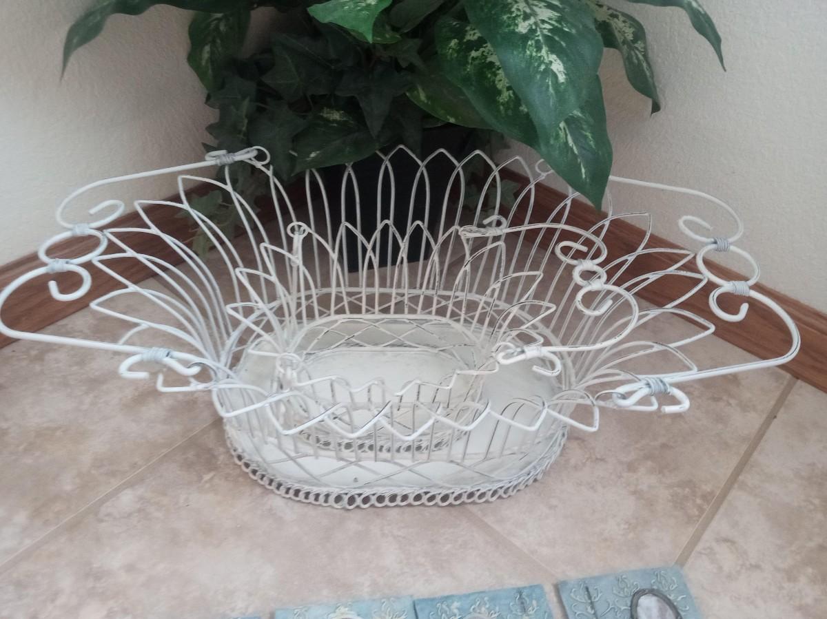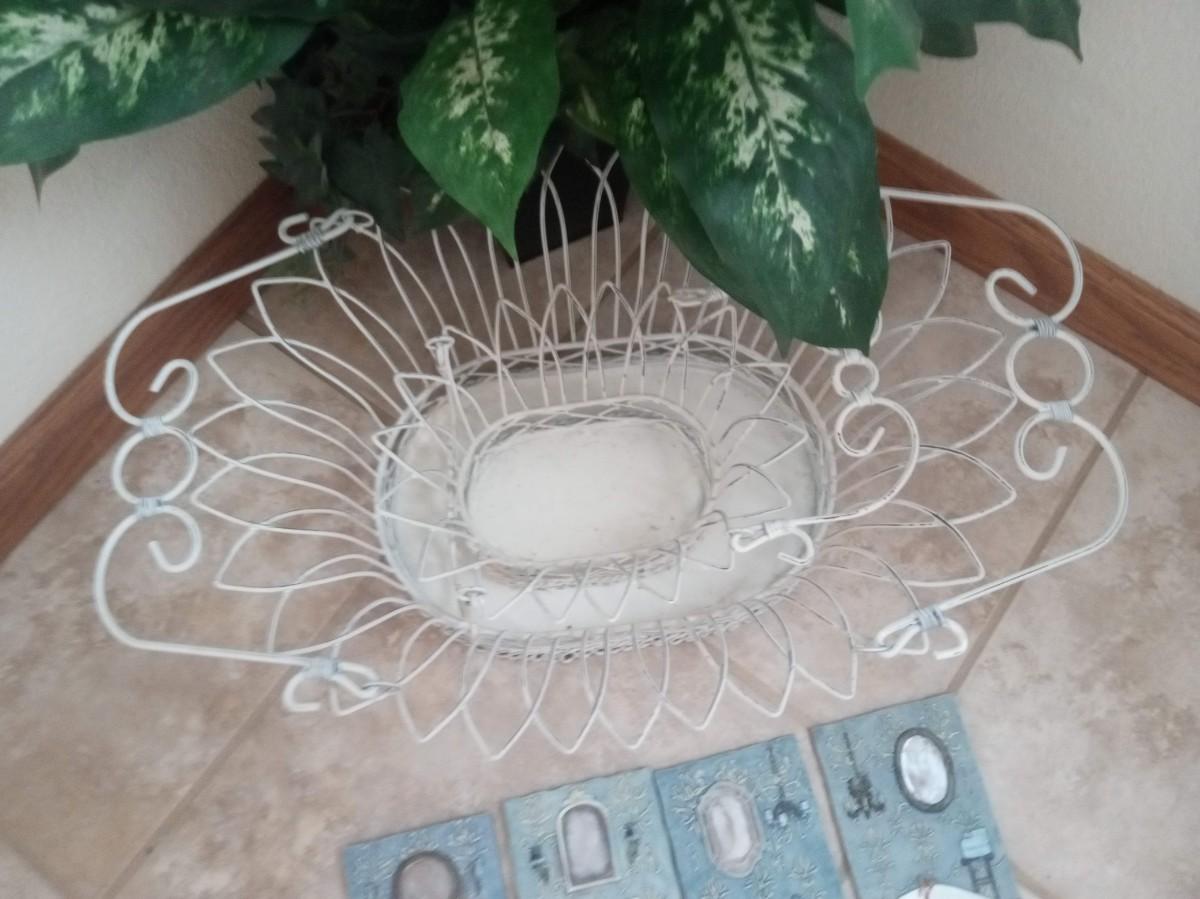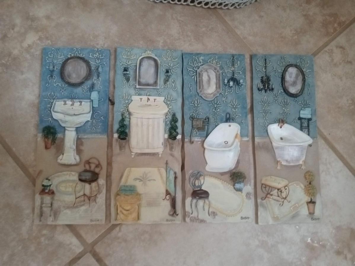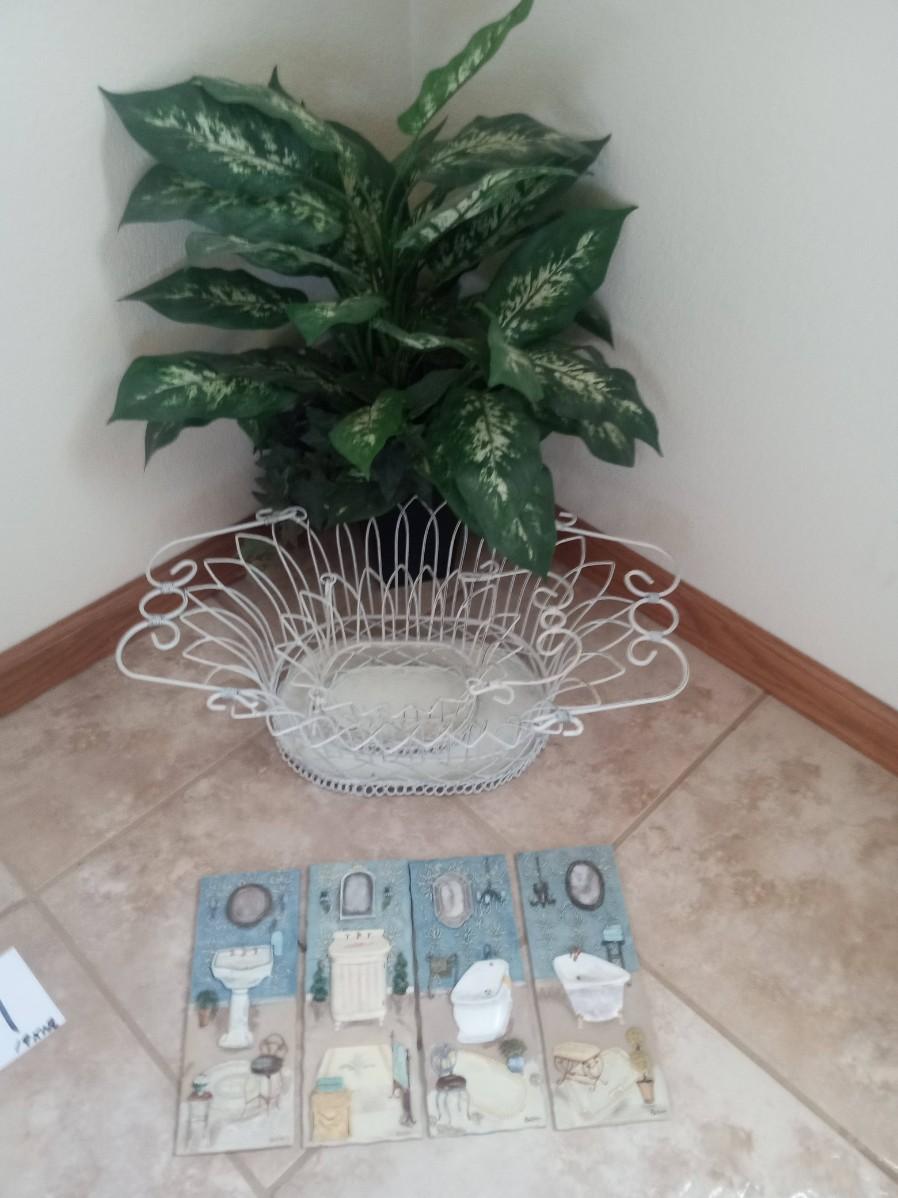 FAUX PLANT, WIRE BASKETS AND 4 BATHROOM THEMED WALL HANGINGS