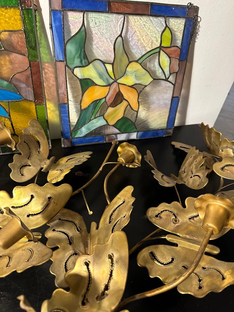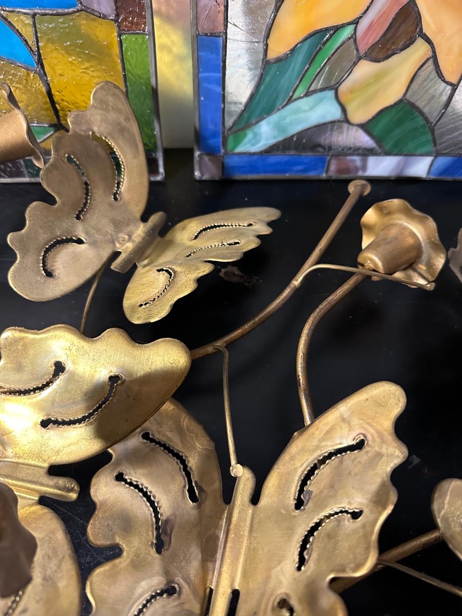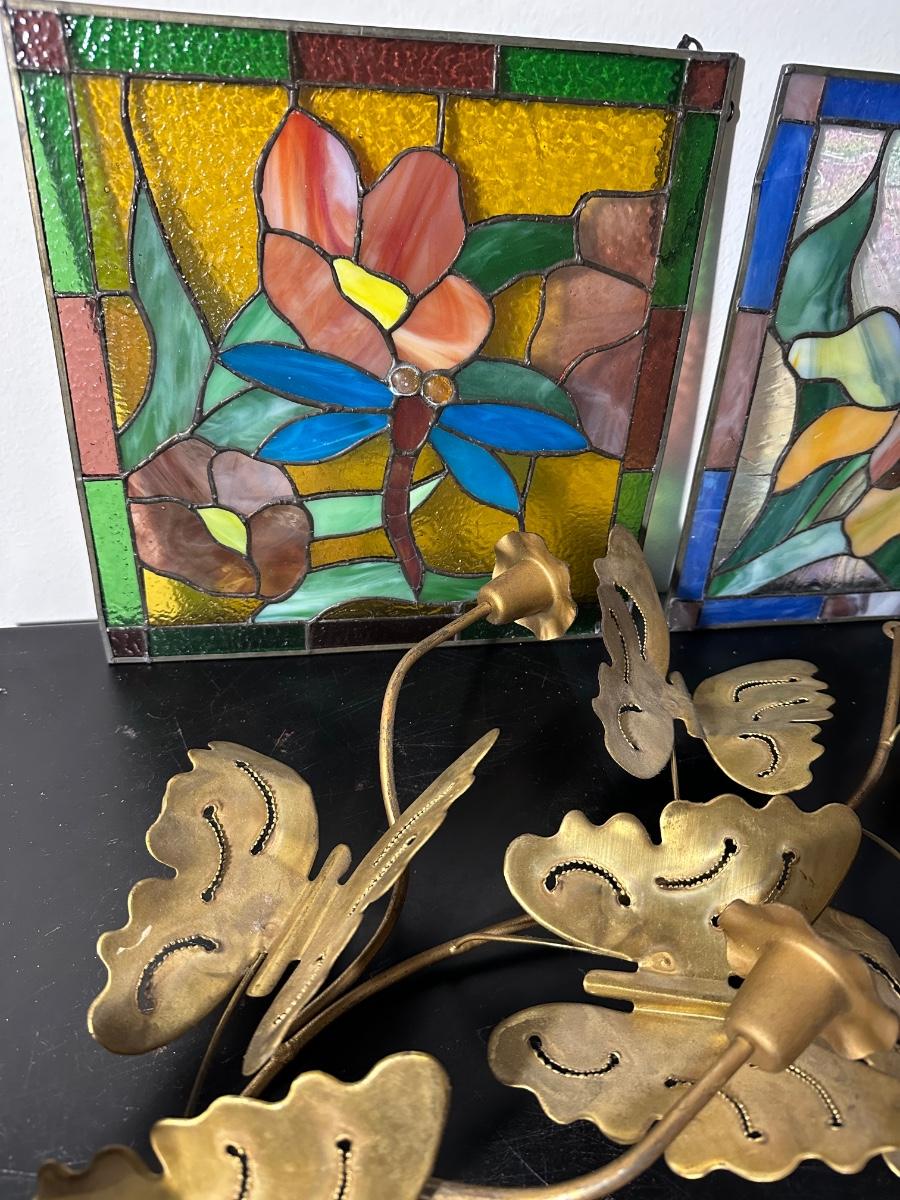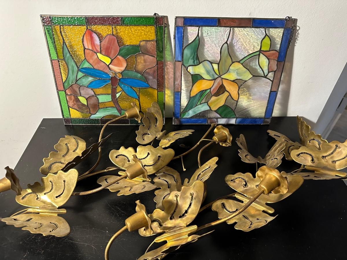 FAUX STAINED GLASS WINDOW LOT, INCLUDES BRASS BUTTERFLY WALL HANGINGS, AS PICTURED