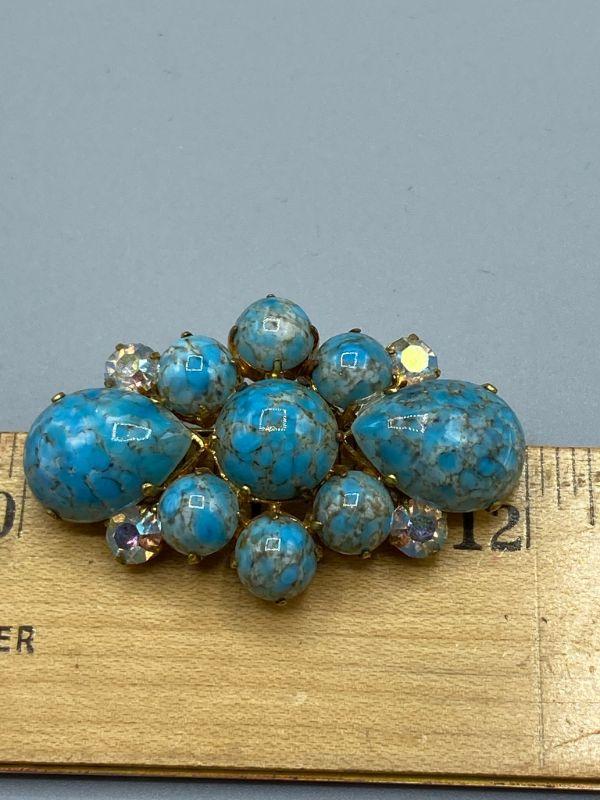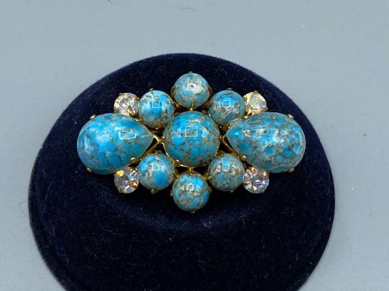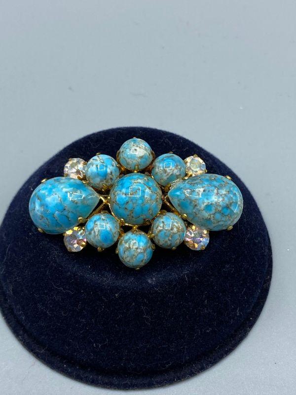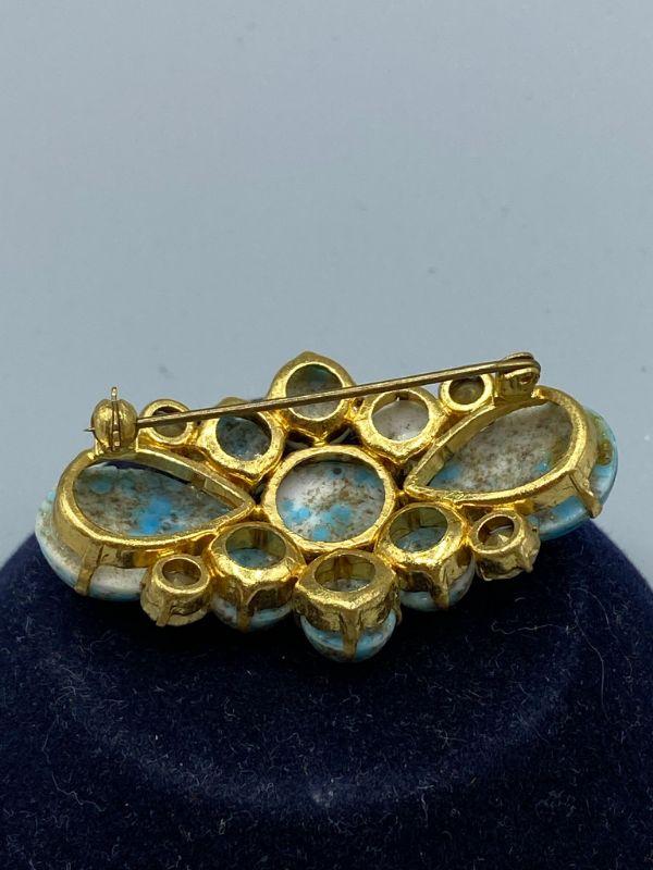 Vintage faux turquoise cabochon pin. Bright gold tone setting. About 2" size.
