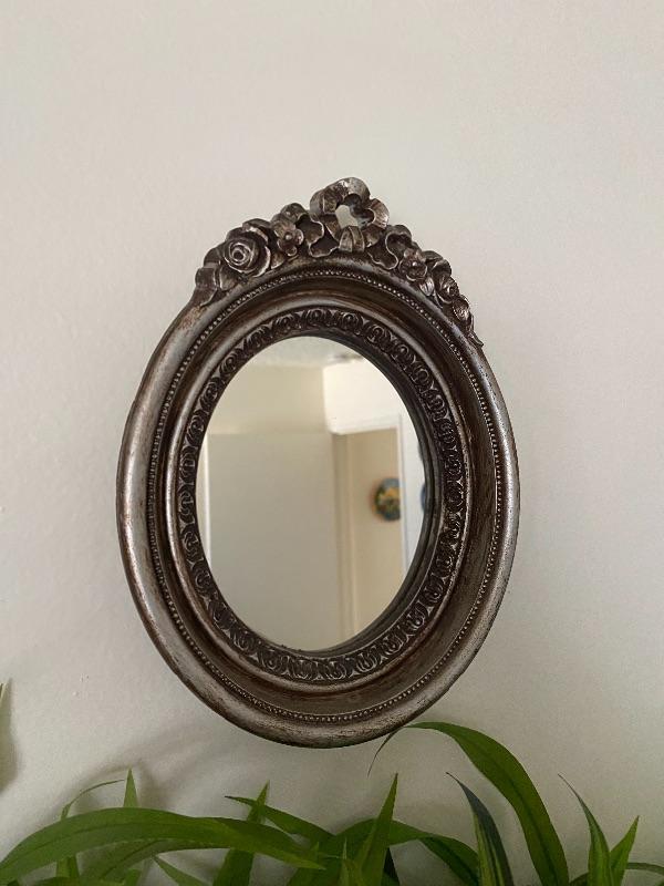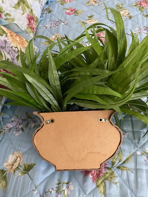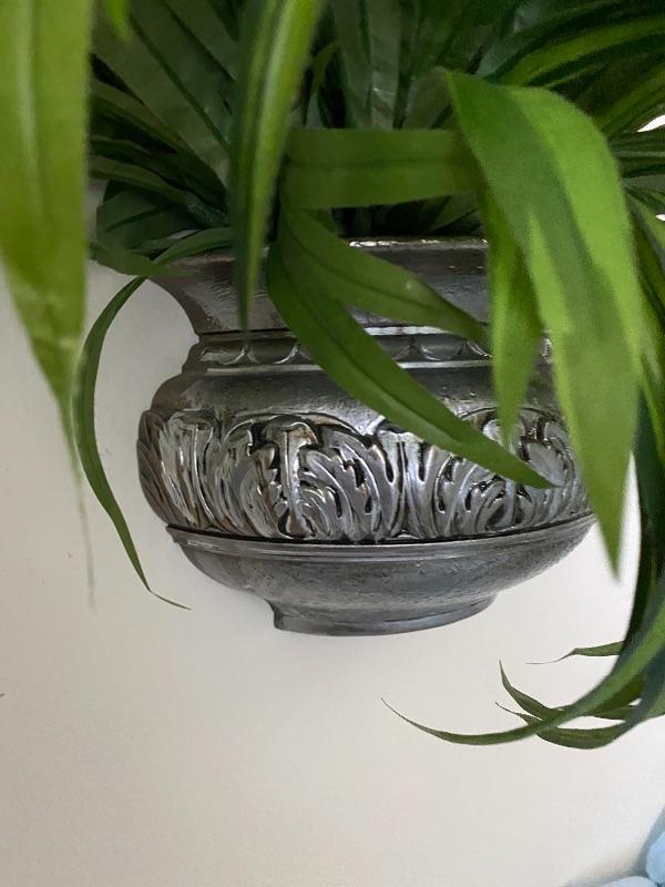 Faux wall hanging plant and mirror. Made of plastic. Silvertone finish.