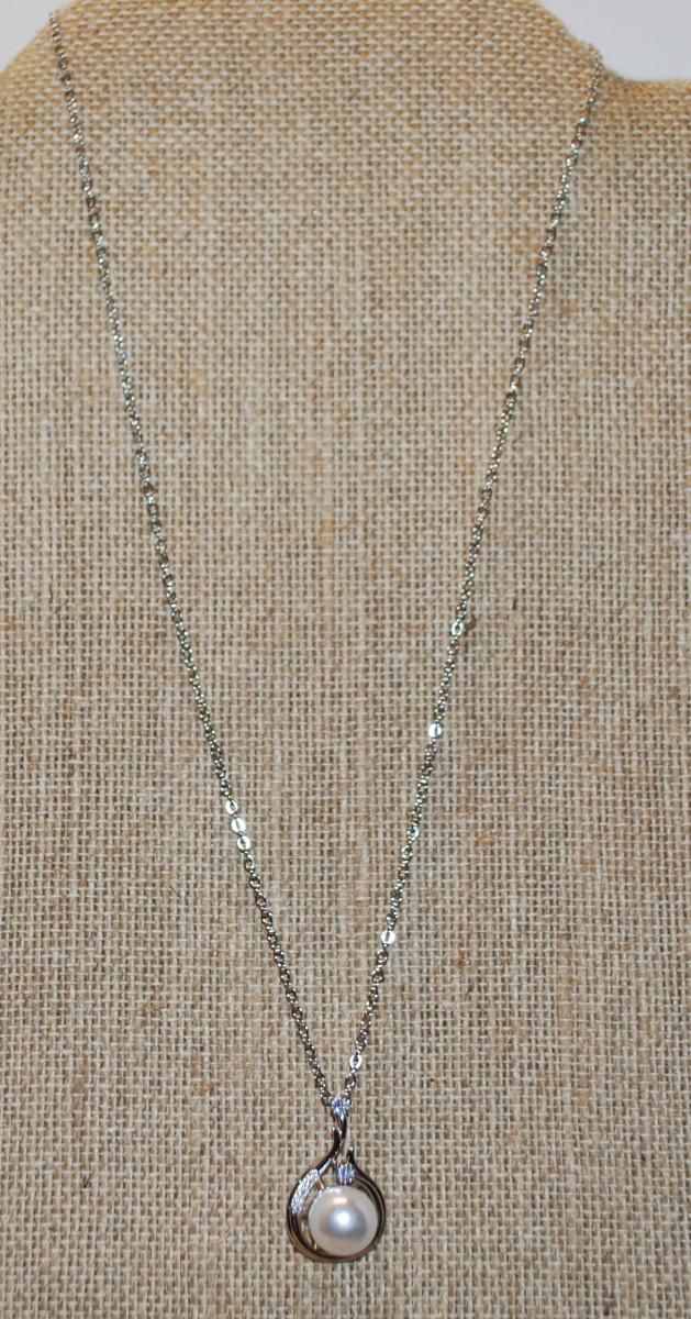 Faux White Single Pearl Cradle Style Setting PENDANT (1" x ½") with Sparkle Accent Stones on a Silver Tone Necklace Chain 17" L