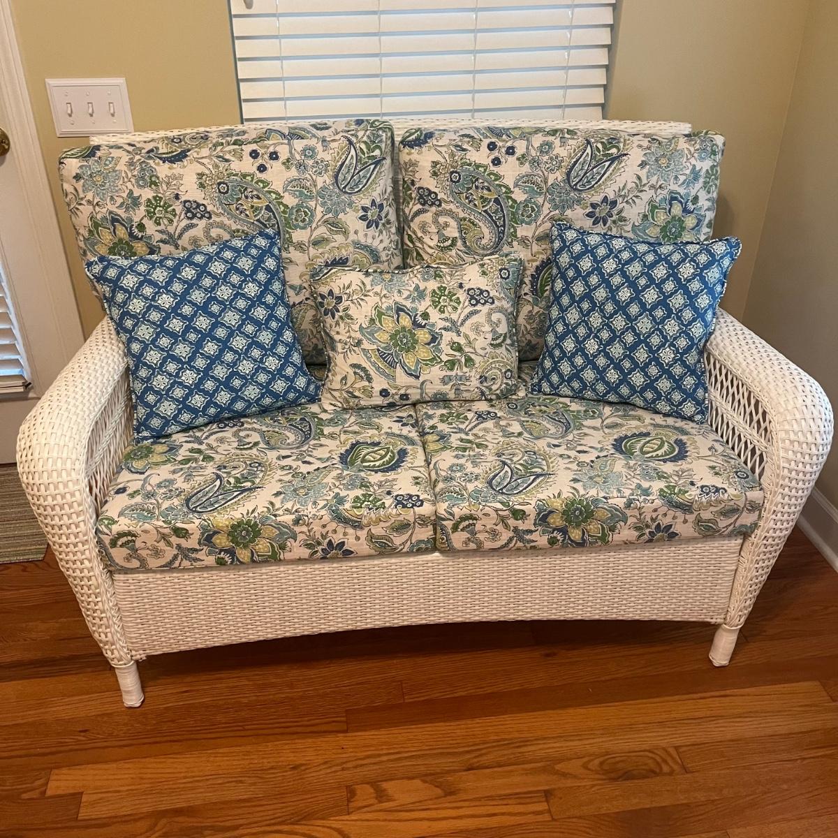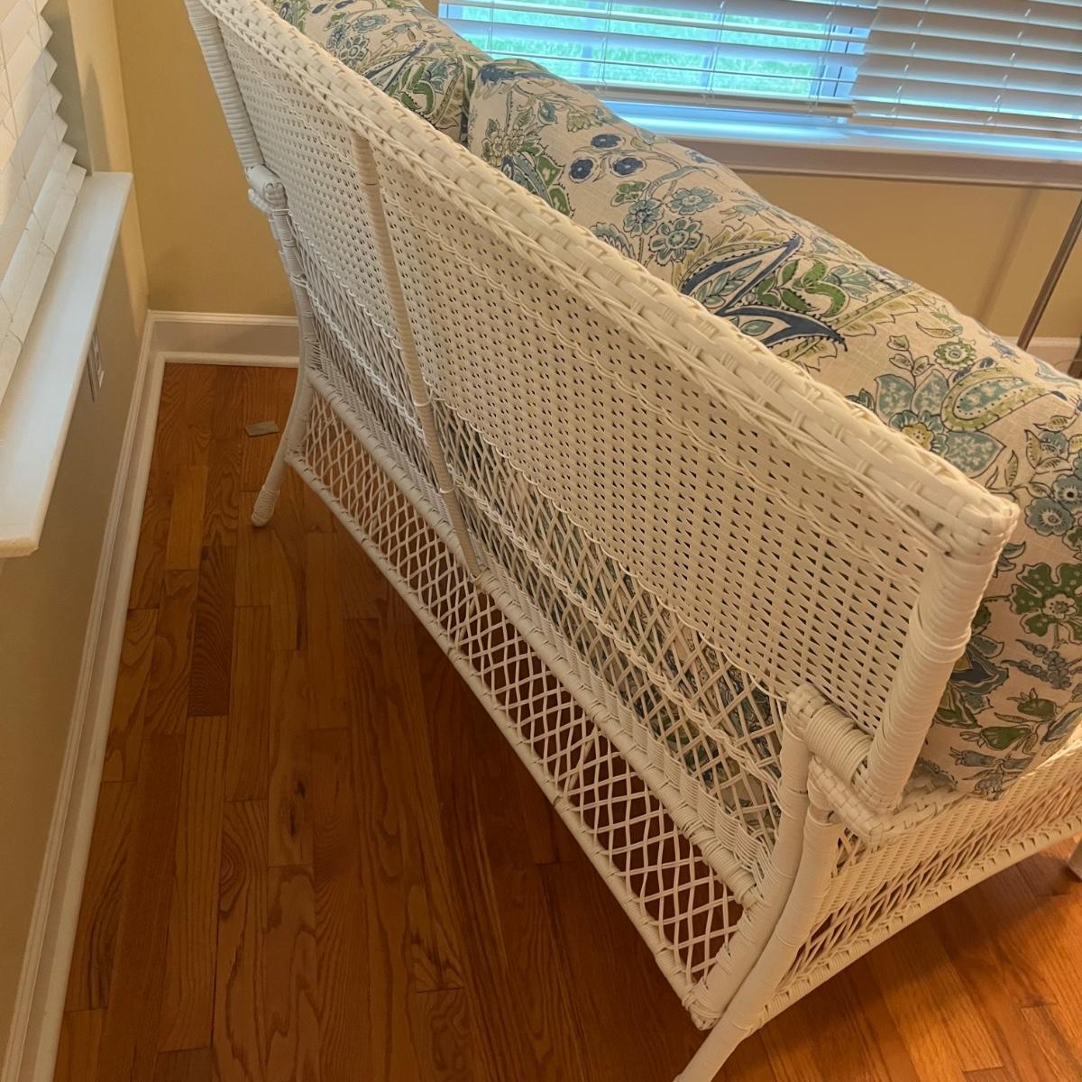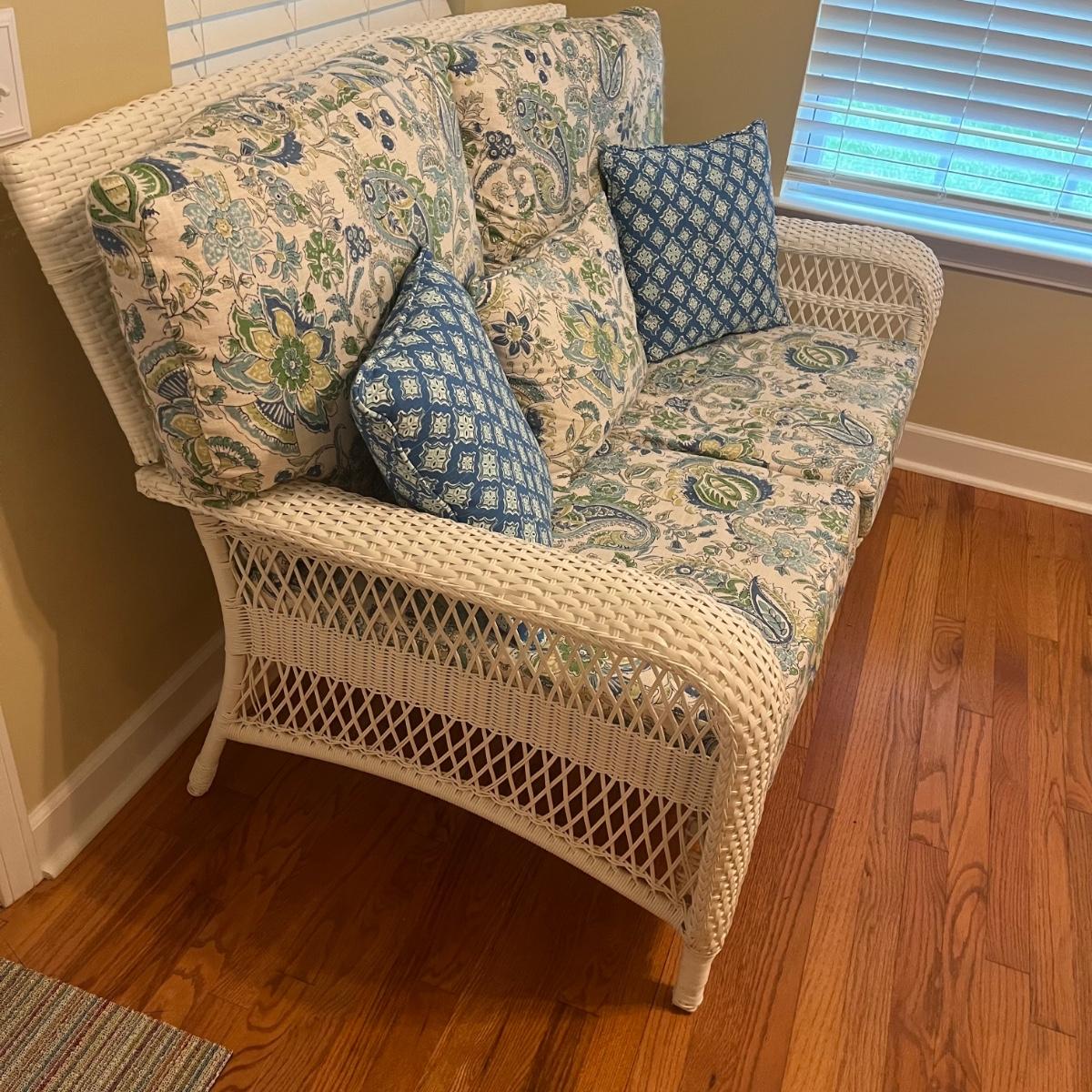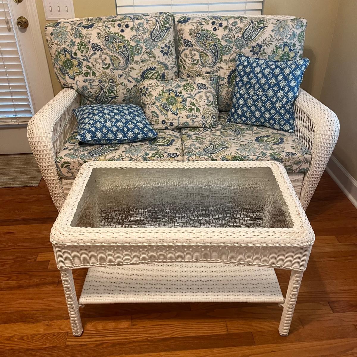 Lot includes a white wicker love seat with paisley print and includes three accent pillows. Also includes a glass top white wicker table. Both pieces are made of faux rattan. Love seat measures 34” x 56” x 37”H with a 18” seat height. Table measures 20” x 34” x 20”H. There is a matching set of seats and tables in another lot.