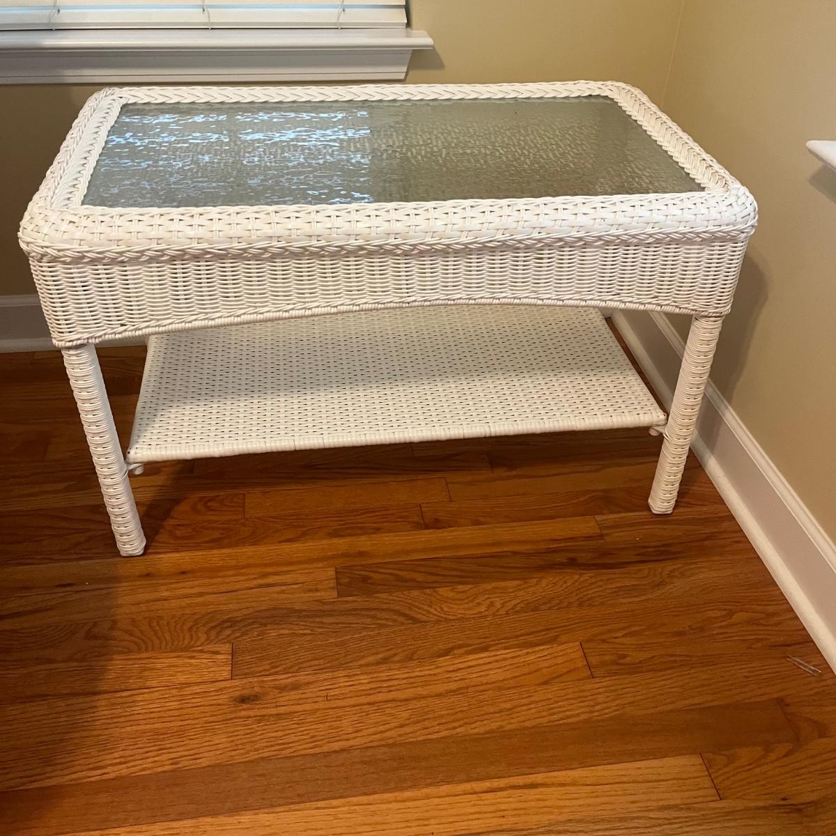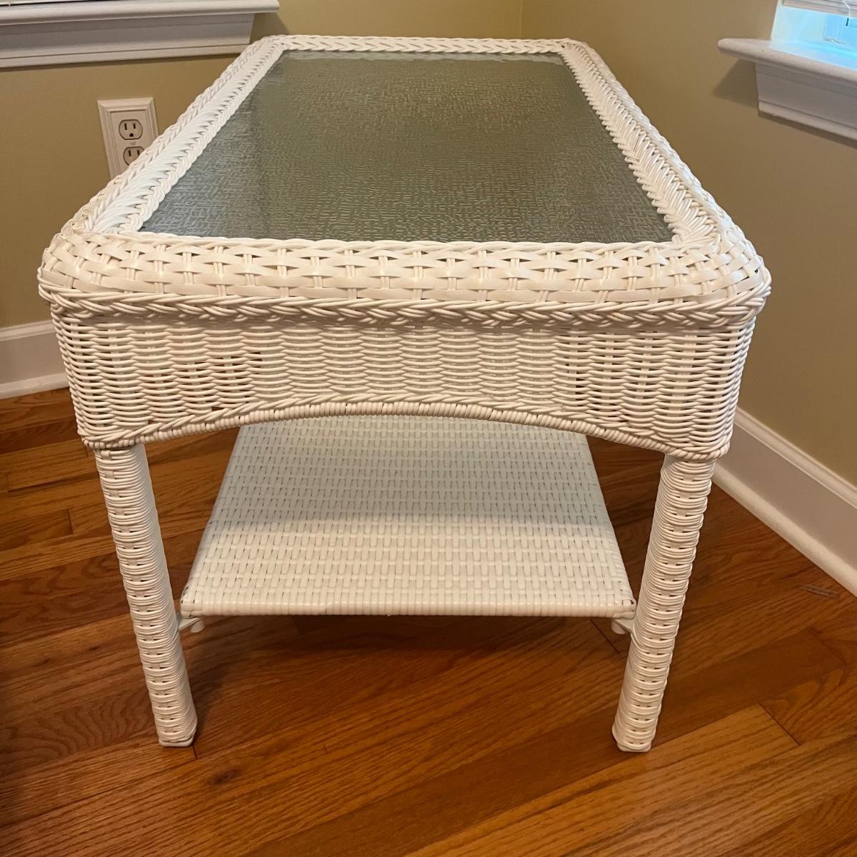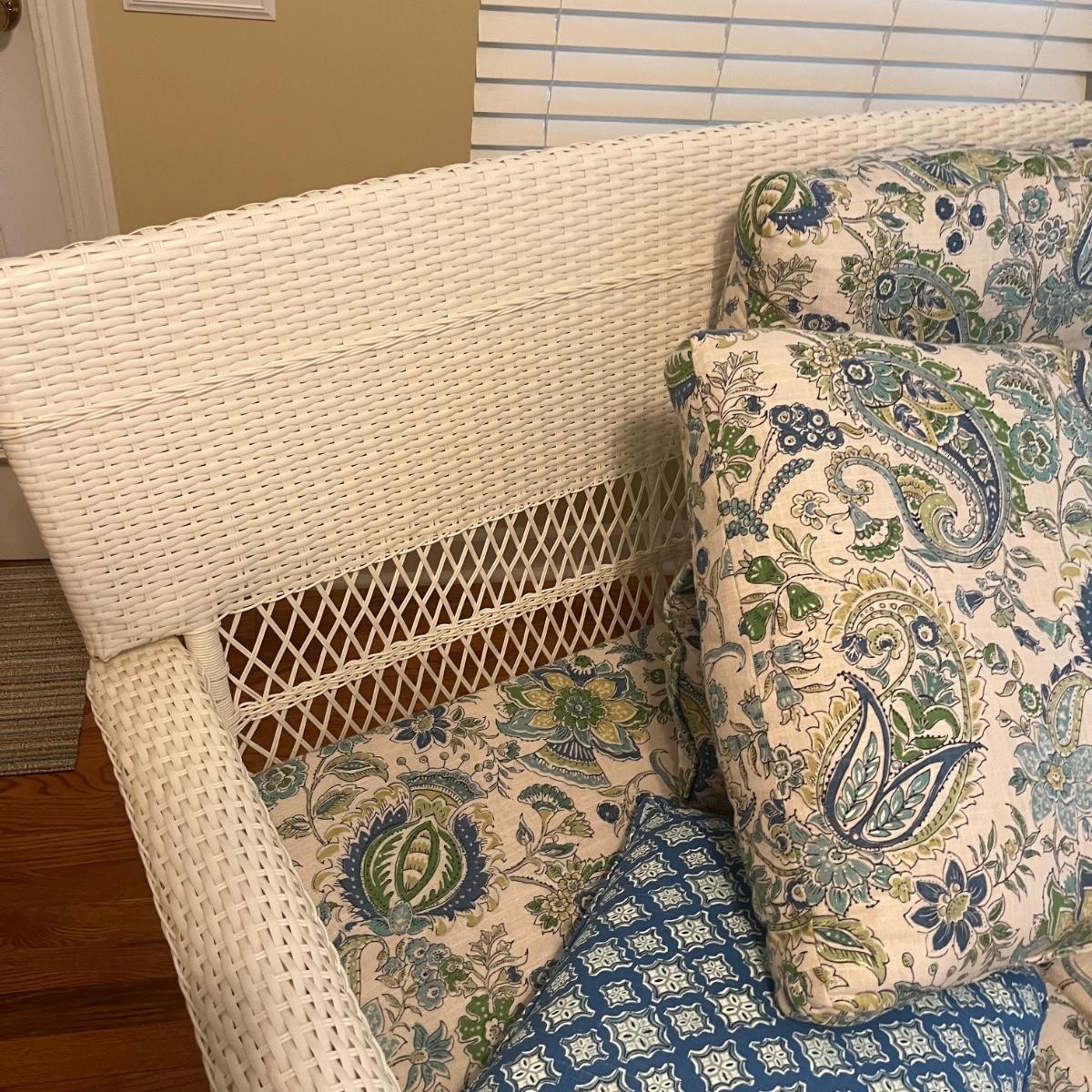 Lot includes a white wicker love seat with paisley print and includes three accent pillows. Also includes a glass top white wicker table. Both pieces are made of faux rattan. Love seat measures 34” x 56” x 37”H with a 18” seat height. Table measures 20” x 34” x 20”H. There is a matching set of seats and tables in another lot.
