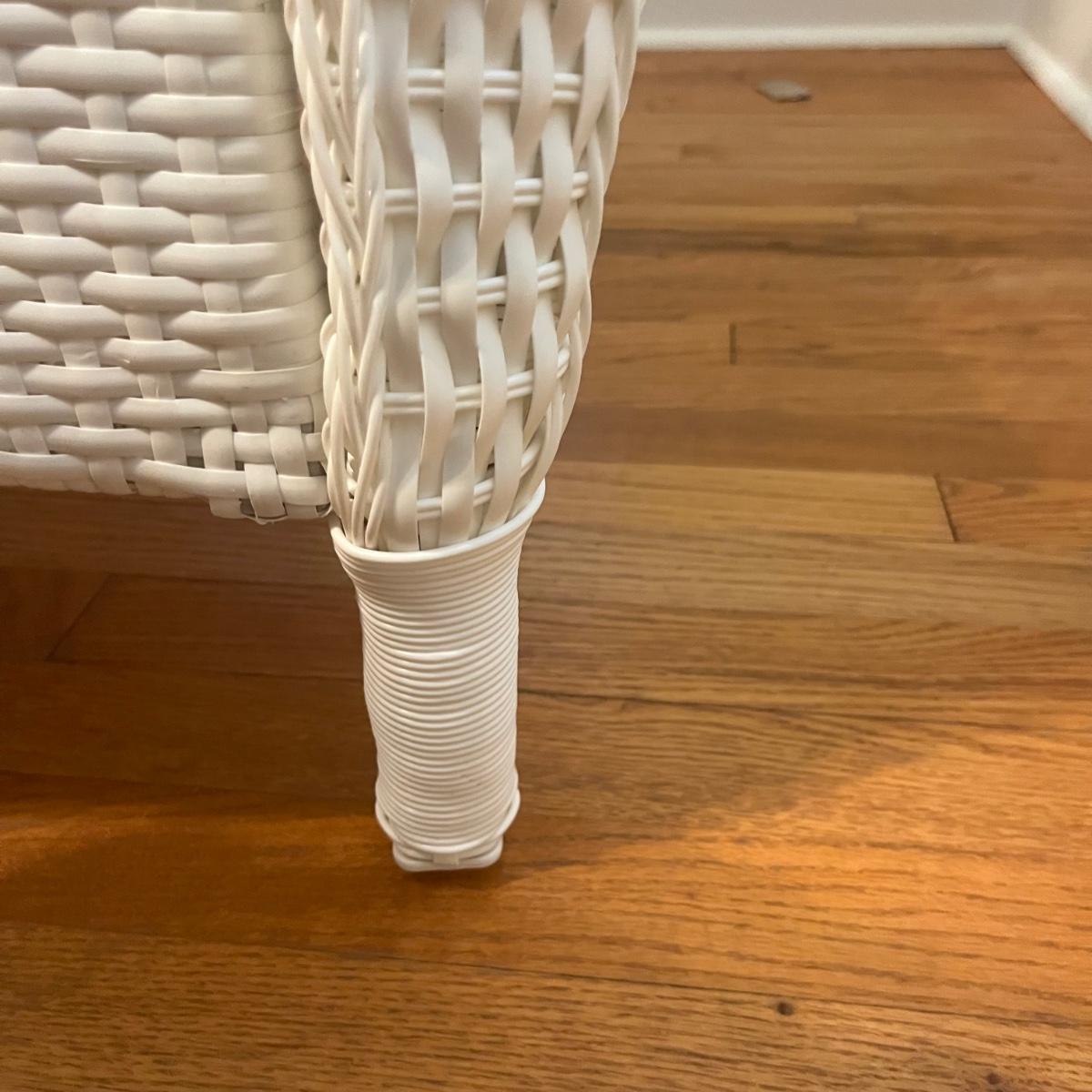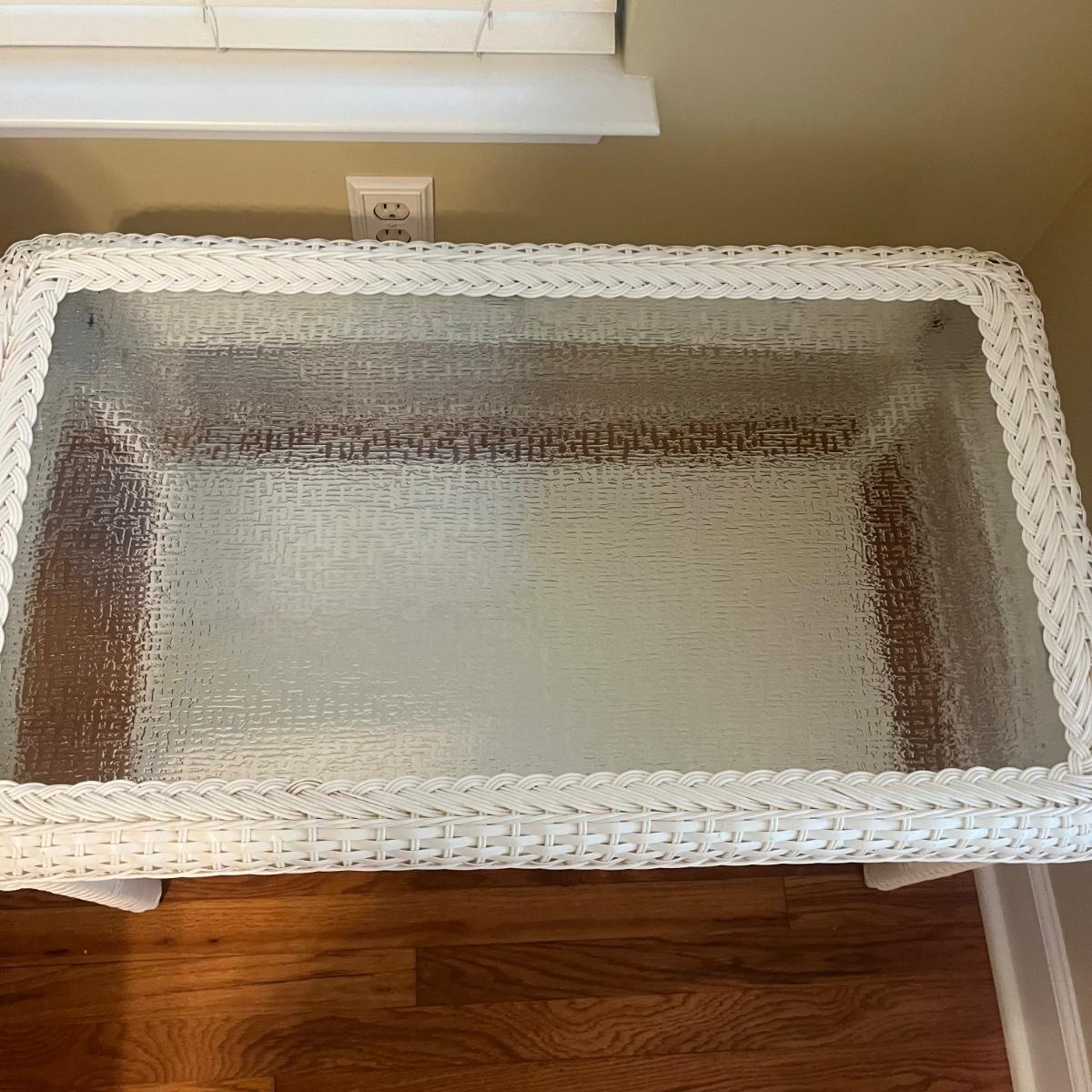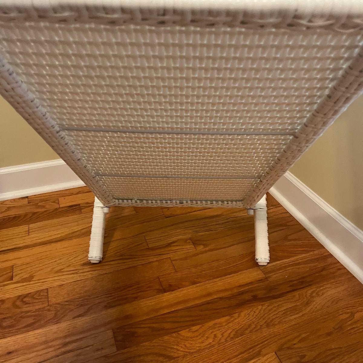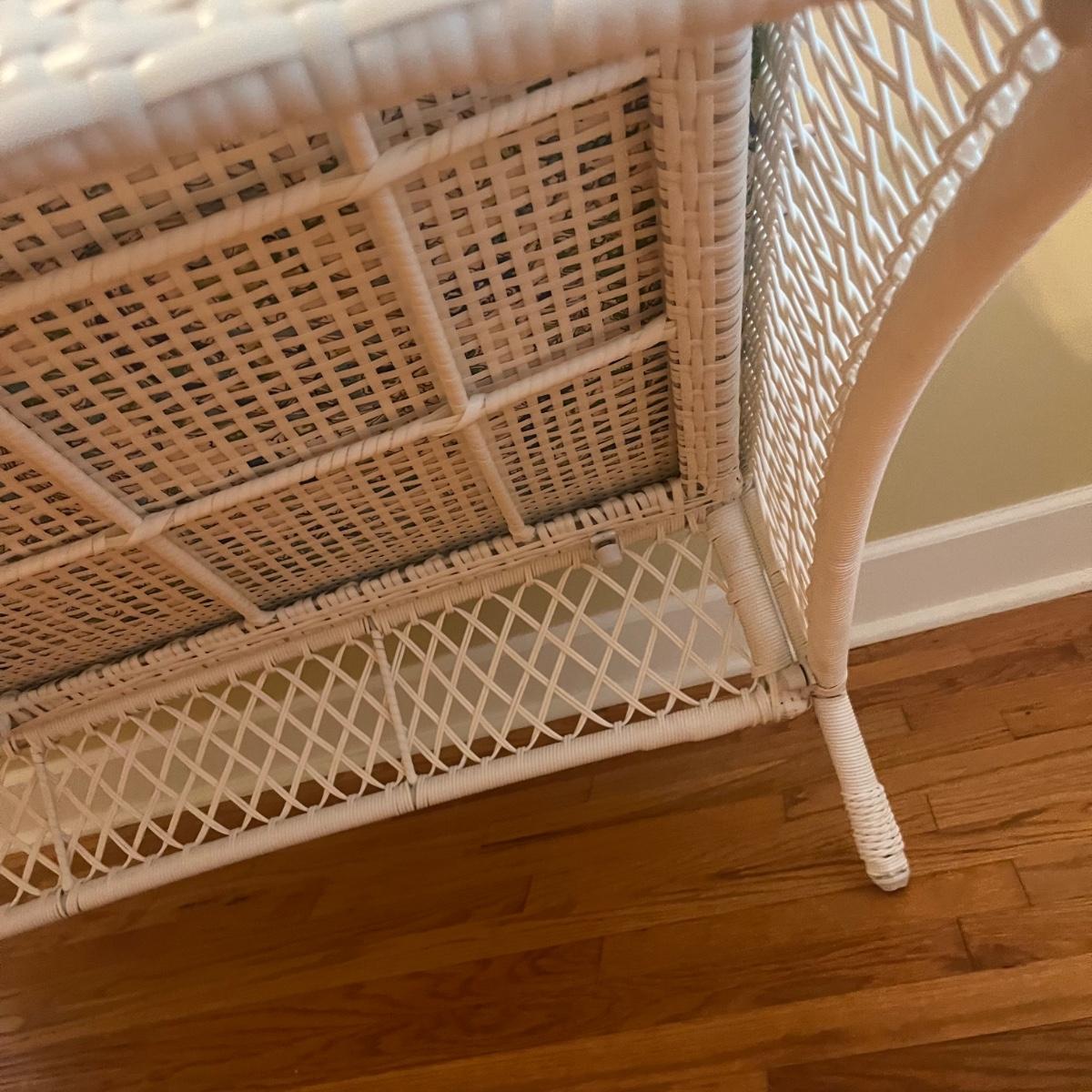 Lot includes a white wicker love seat with paisley print and includes three accent pillows. Also includes a glass top white wicker table. Both pieces are made of faux rattan. Love seat measures 34” x 56” x 37”H with a 18” seat height. Table measures 20” x 34” x 20”H. There is a matching set of seats and tables in another lot.