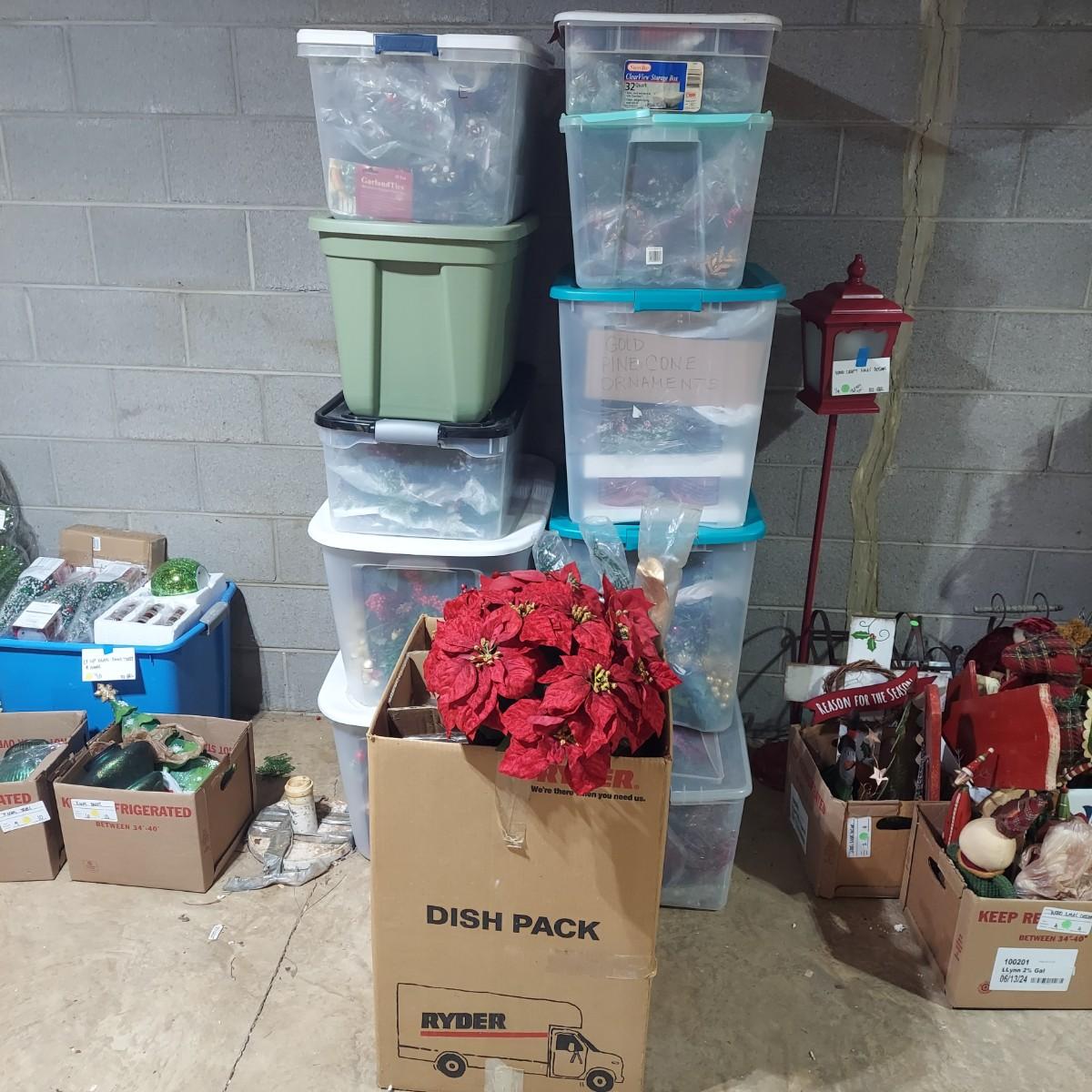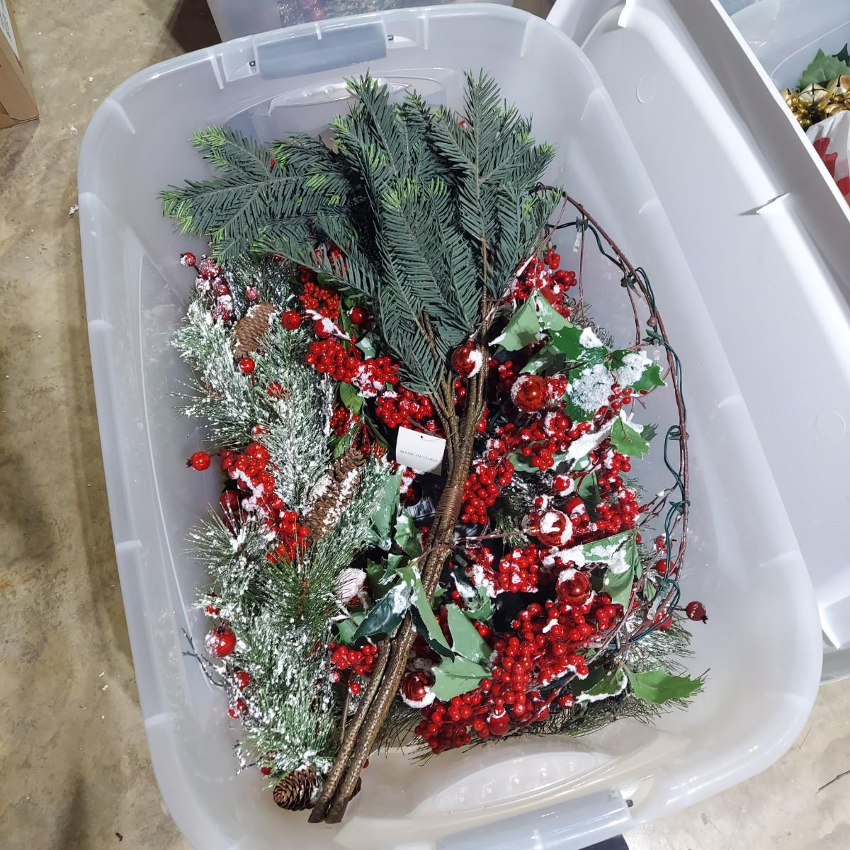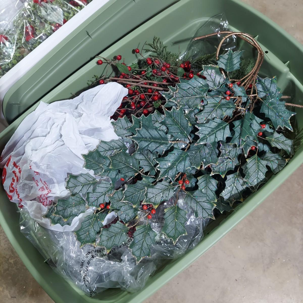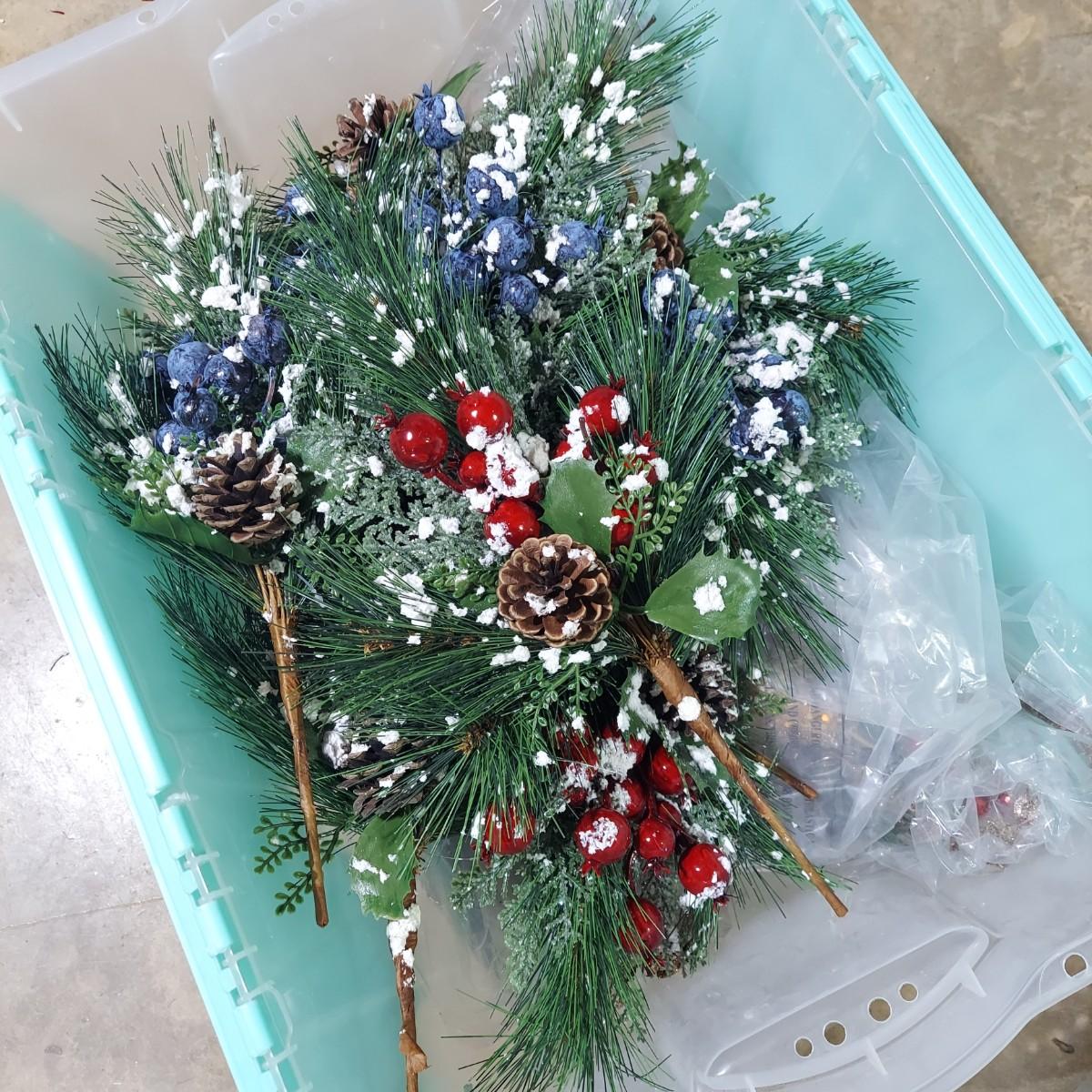 Lot includes ten bins and one large box filled with Winter/Christmas faux foliage. There are candle rings, swags, picks/sprays and vines. Also includes two potted faux poinsettias. Please see photos for details. This is a very large lot. Please plan accordingly for transportation. Local Pickup Only