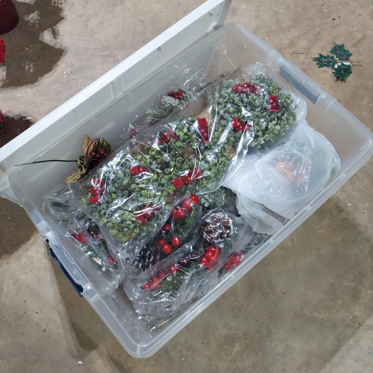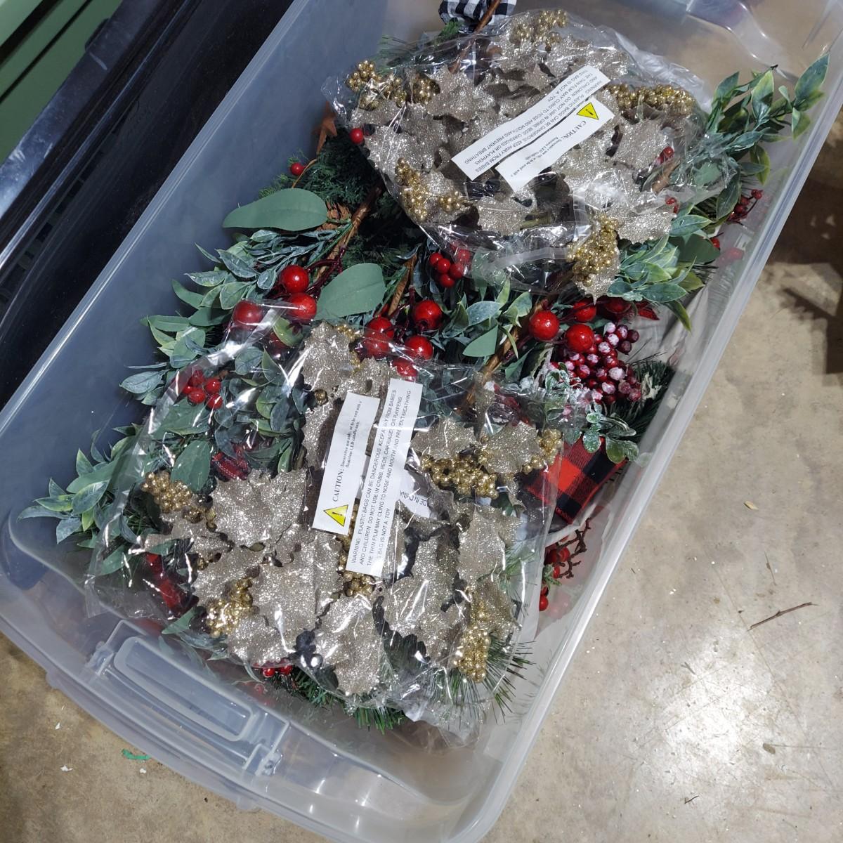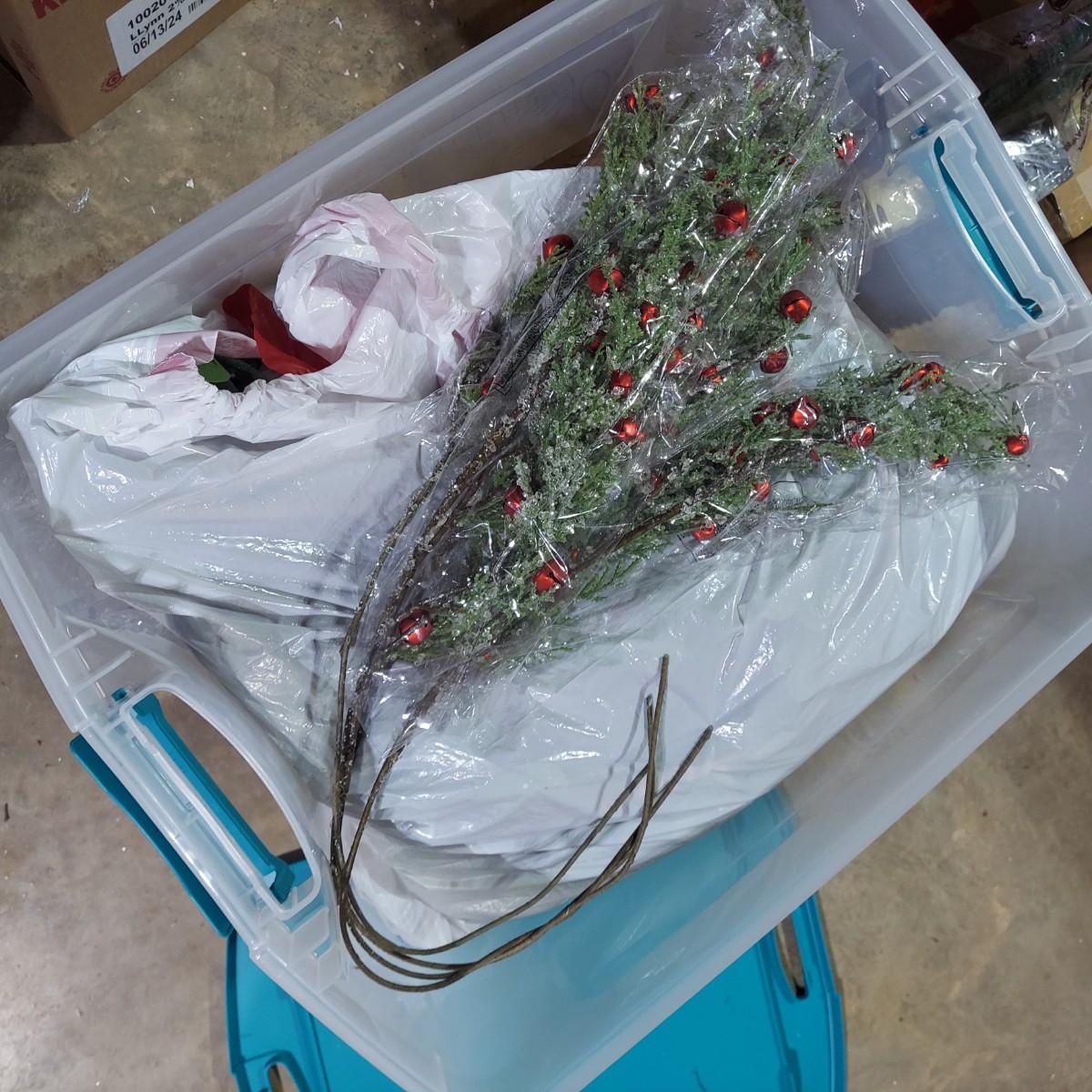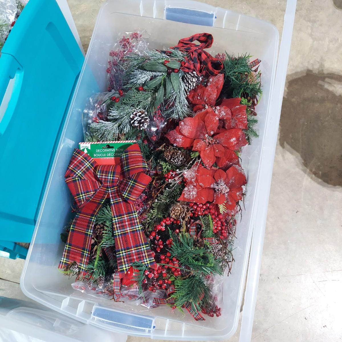 Lot includes ten bins and one large box filled with Winter/Christmas faux foliage. There are candle rings, swags, picks/sprays and vines. Also includes two potted faux poinsettias. Please see photos for details. This is a very large lot. Please plan accordingly for transportation. Local Pickup Only