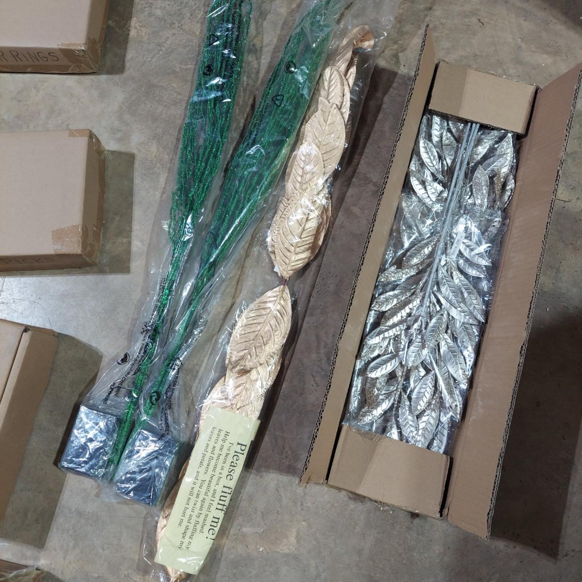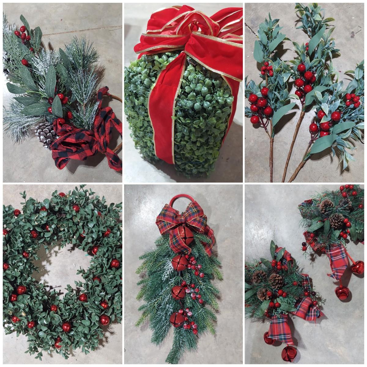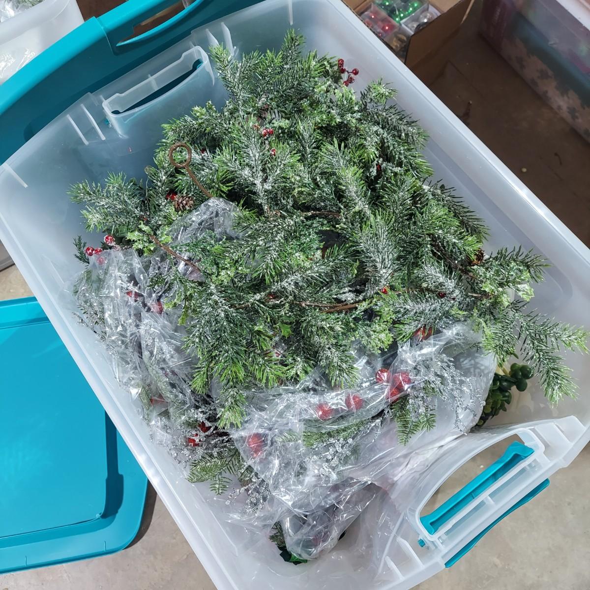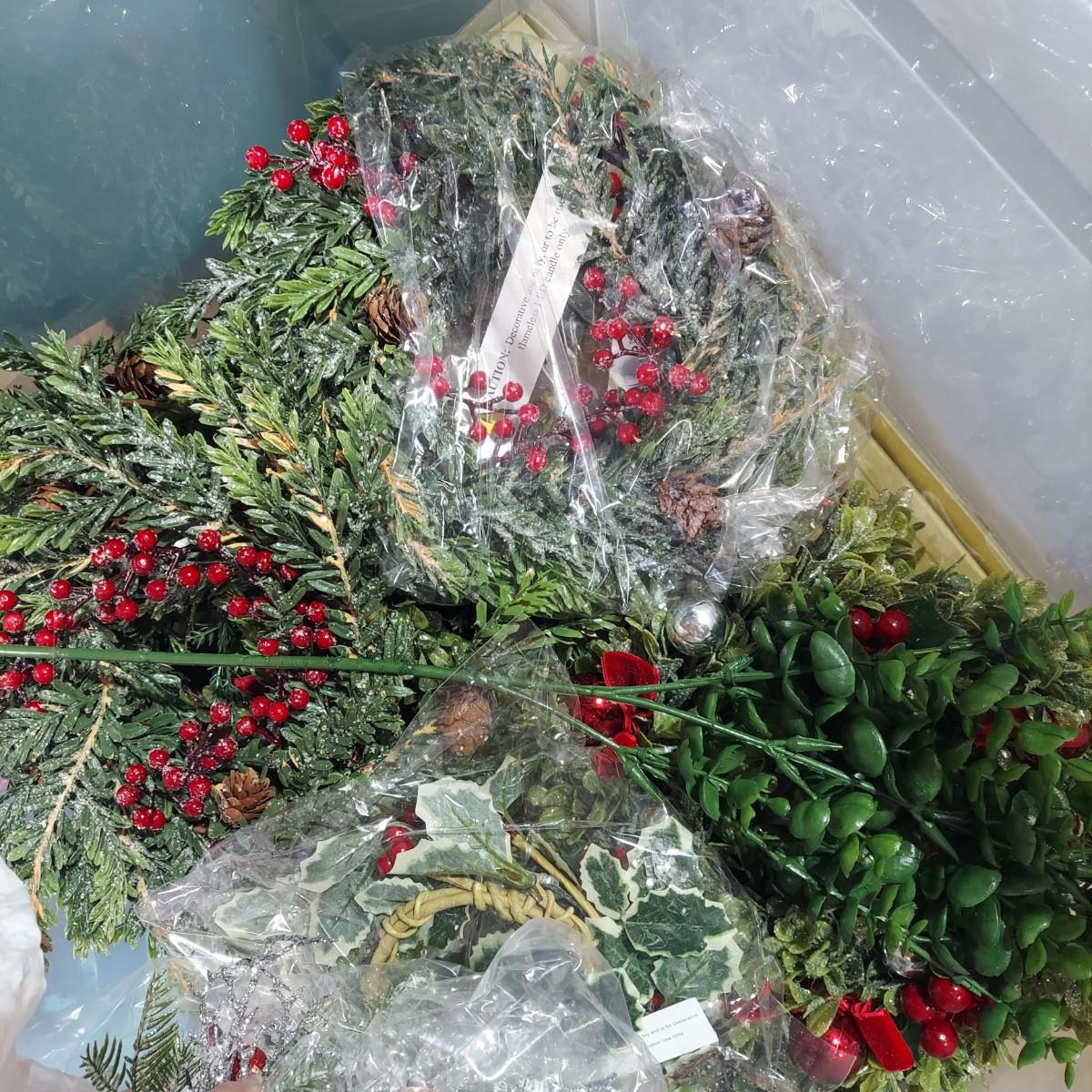 Lot includes ten bins and one large box filled with Winter/Christmas faux foliage. There are candle rings, swags, picks/sprays and vines. Also includes two potted faux poinsettias. Please see photos for details. This is a very large lot. Please plan accordingly for transportation. Local Pickup Only