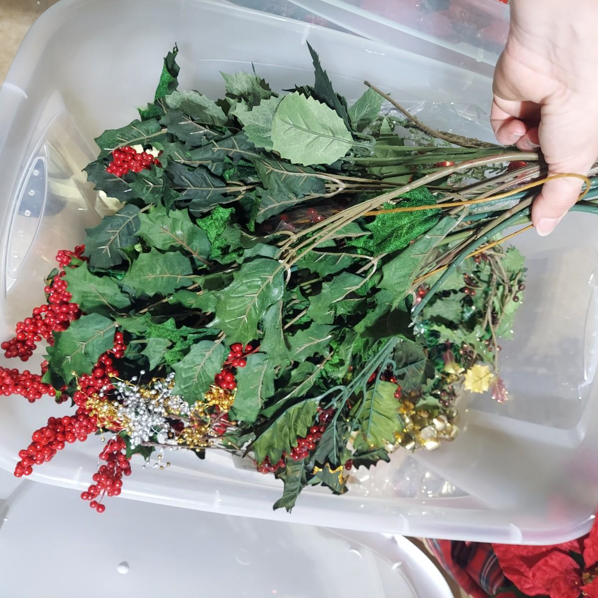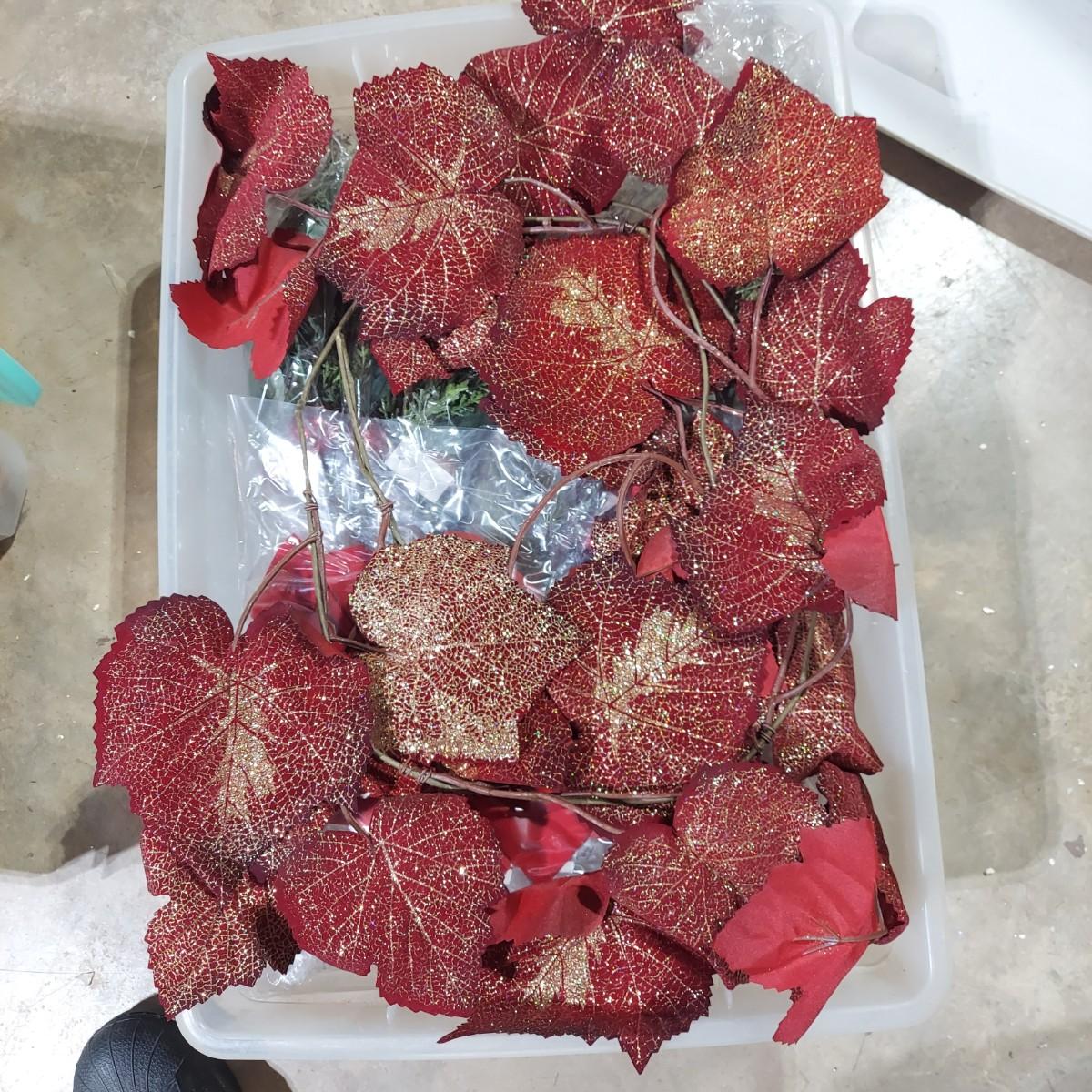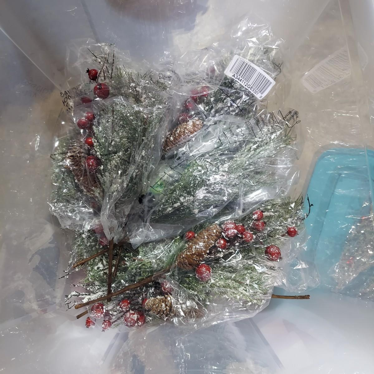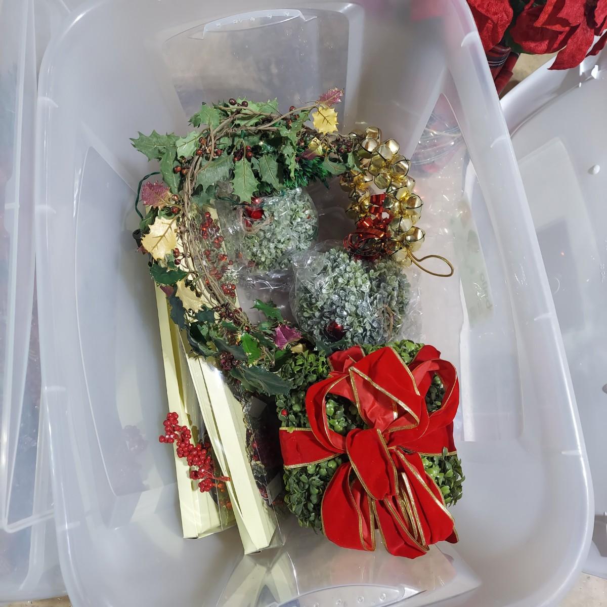 Lot includes ten bins and one large box filled with Winter/Christmas faux foliage. There are candle rings, swags, picks/sprays and vines. Also includes two potted faux poinsettias. Please see photos for details. This is a very large lot. Please plan accordingly for transportation. Local Pickup Only