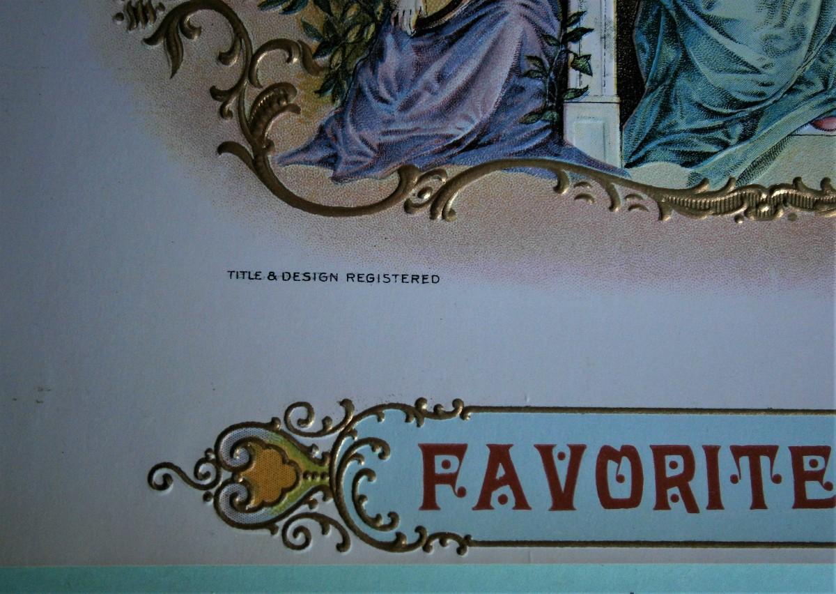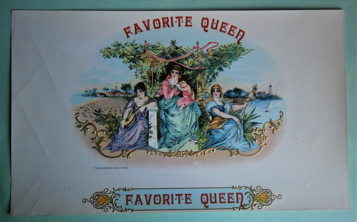 "FAVORITE QUEEN" Inner Lid Cigar Box Label, form early 1900's or earlier, "Trade Mark Registered", 10 x 6 in., embossed & lithographed on paper.