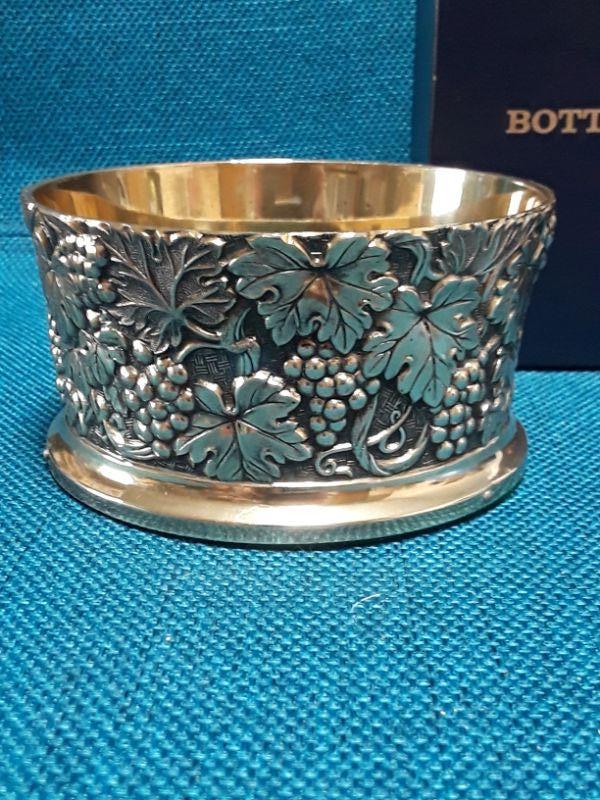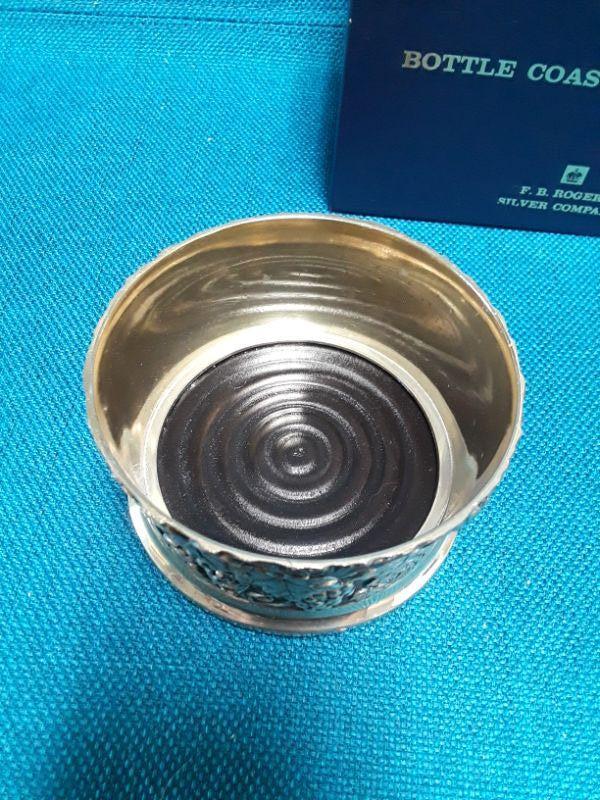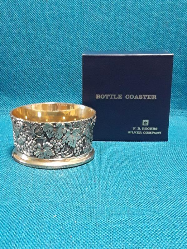 FB Rogers Silver Company Bottle Coaster. Tarnish resistant silverplate. Grape Vine pattern. 4" wide opening, heavy base. Great Condition. Comes in original box.