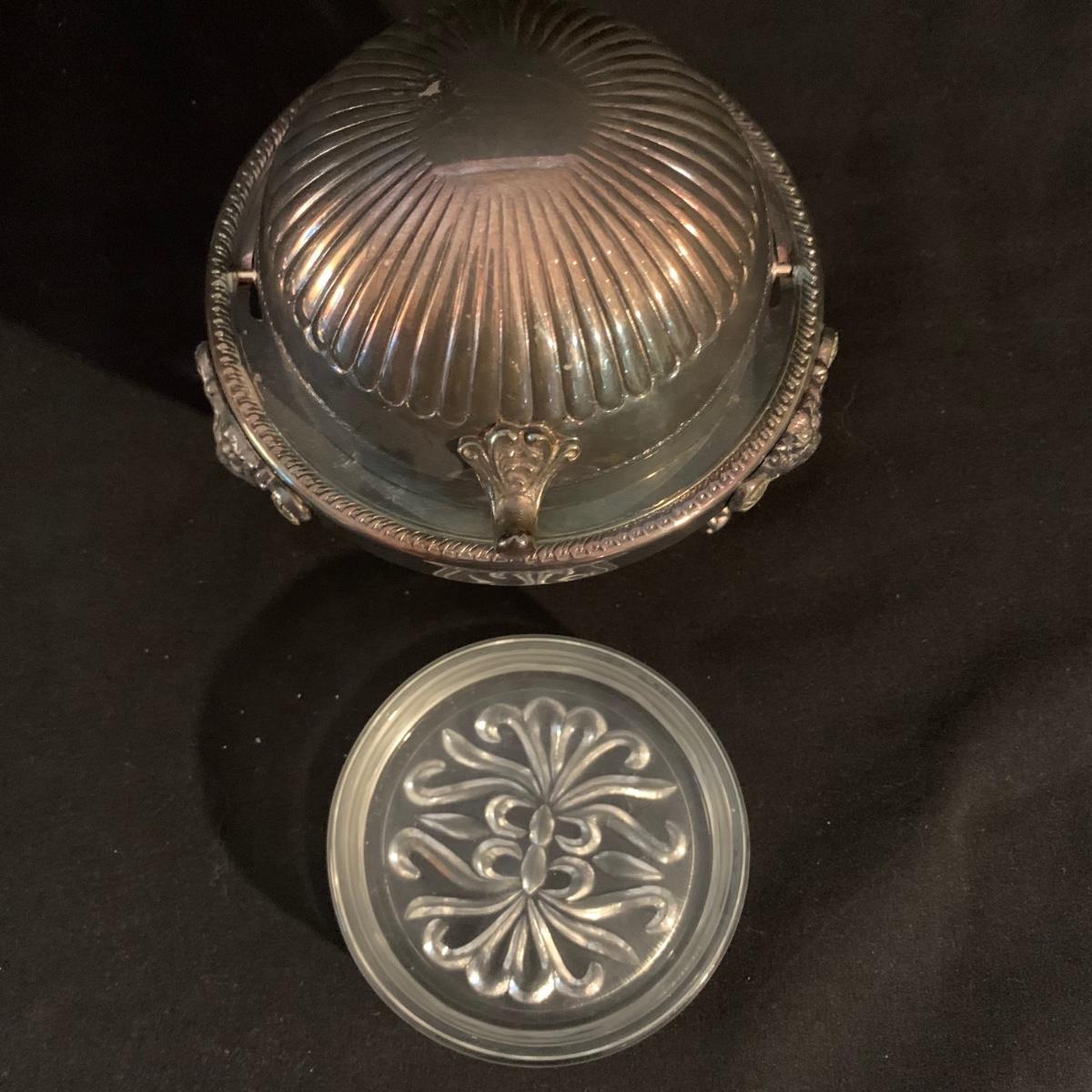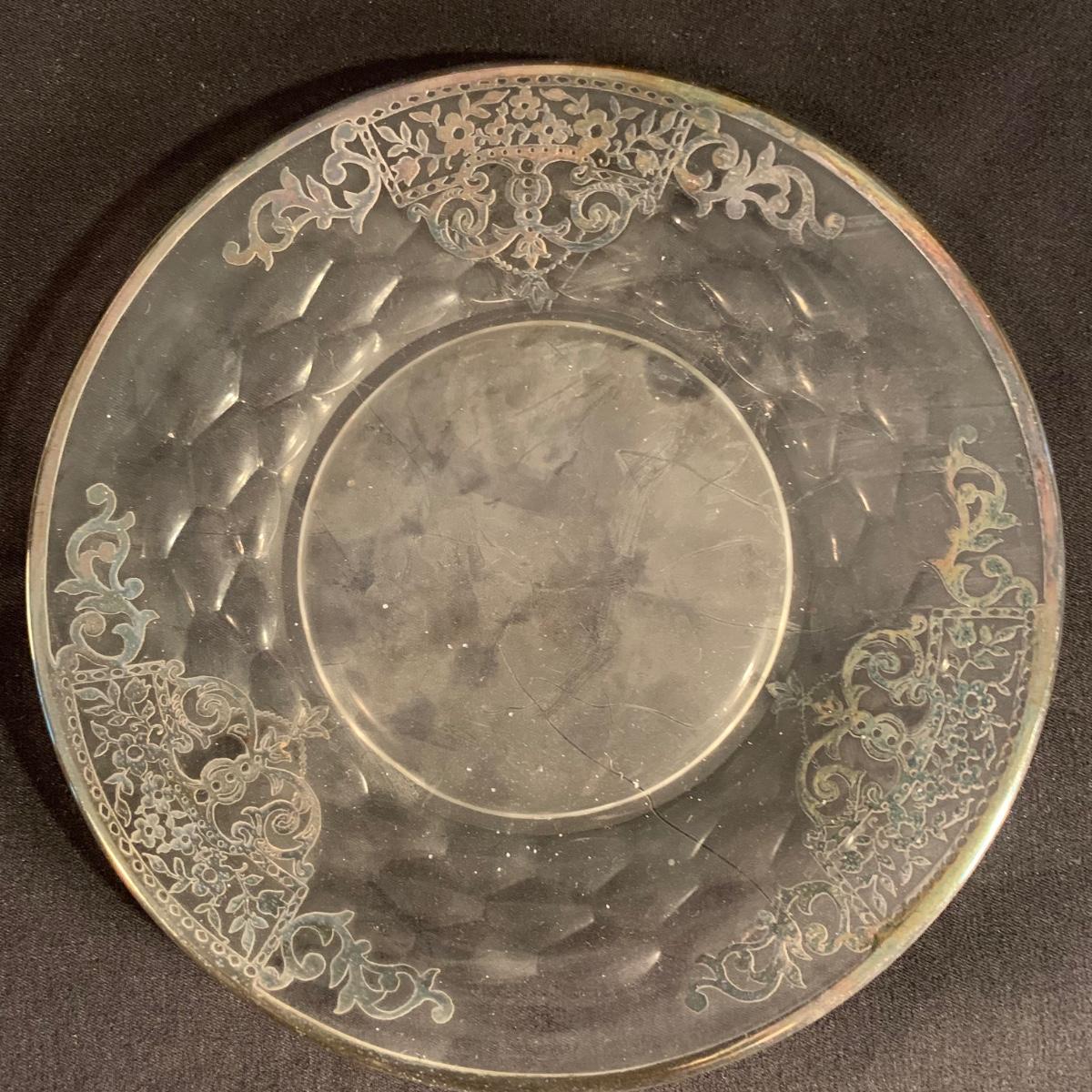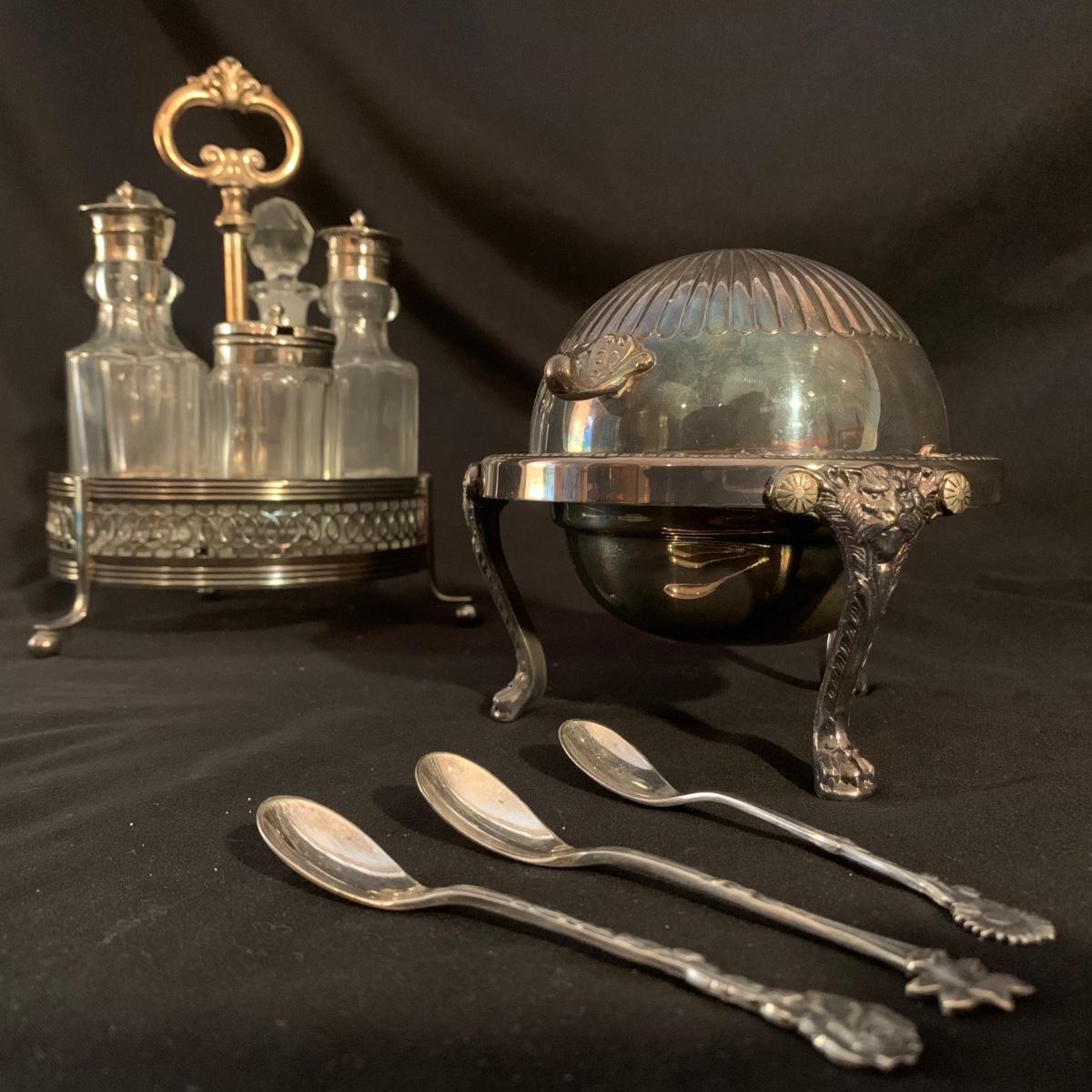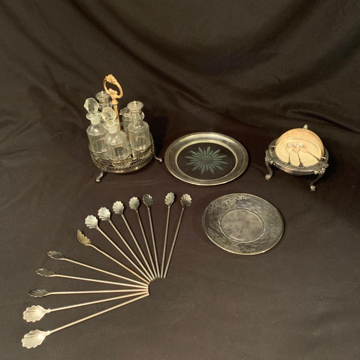 This unique lot includes a small FB Rogers silver caviar dish with domed roll-bad lid and glass insert. This dish features lions at the top of each foot. Lot also includes small plate with silver design that measures 6”D and a larger etched glass plate with a silver-toned rim that measures 8”D. You’ll find three silver metal spoons and thirteen teaspoon straws. This lot is quite unique. All items have aged over time but appear to be in good condition.