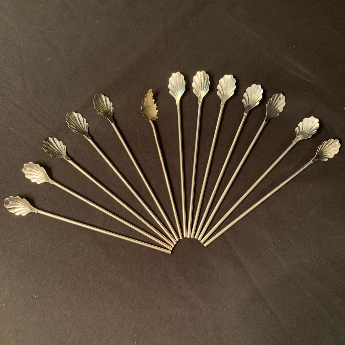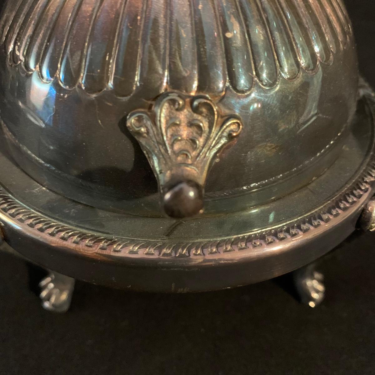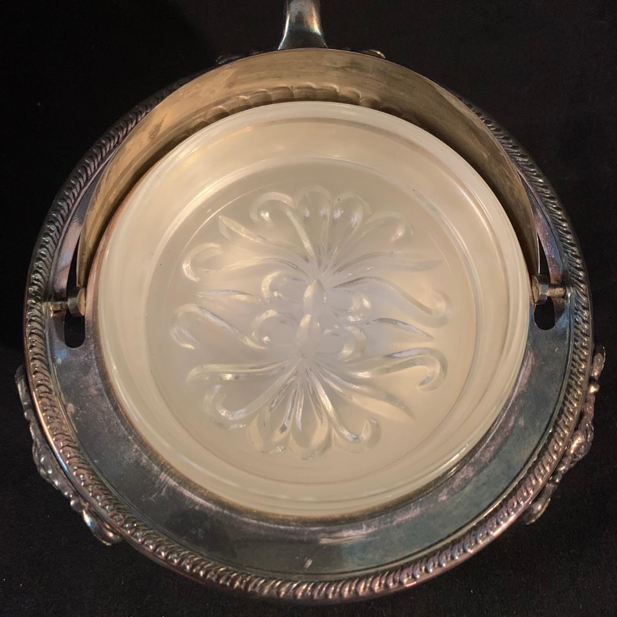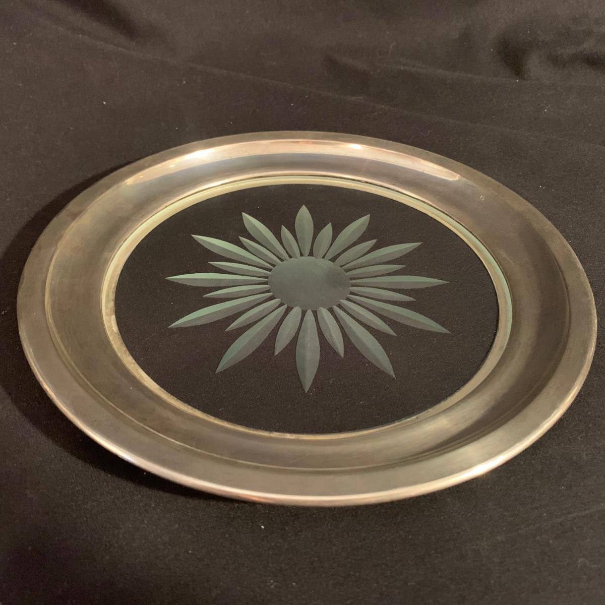 This unique lot includes a small FB Rogers silver caviar dish with domed roll-bad lid and glass insert. This dish features lions at the top of each foot. Lot also includes small plate with silver design that measures 6”D and a larger etched glass plate with a silver-toned rim that measures 8”D. You’ll find three silver metal spoons and thirteen teaspoon straws. This lot is quite unique. All items have aged over time but appear to be in good condition.