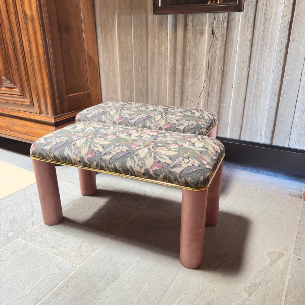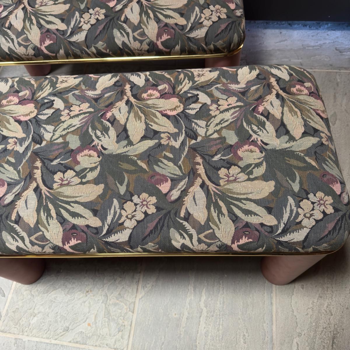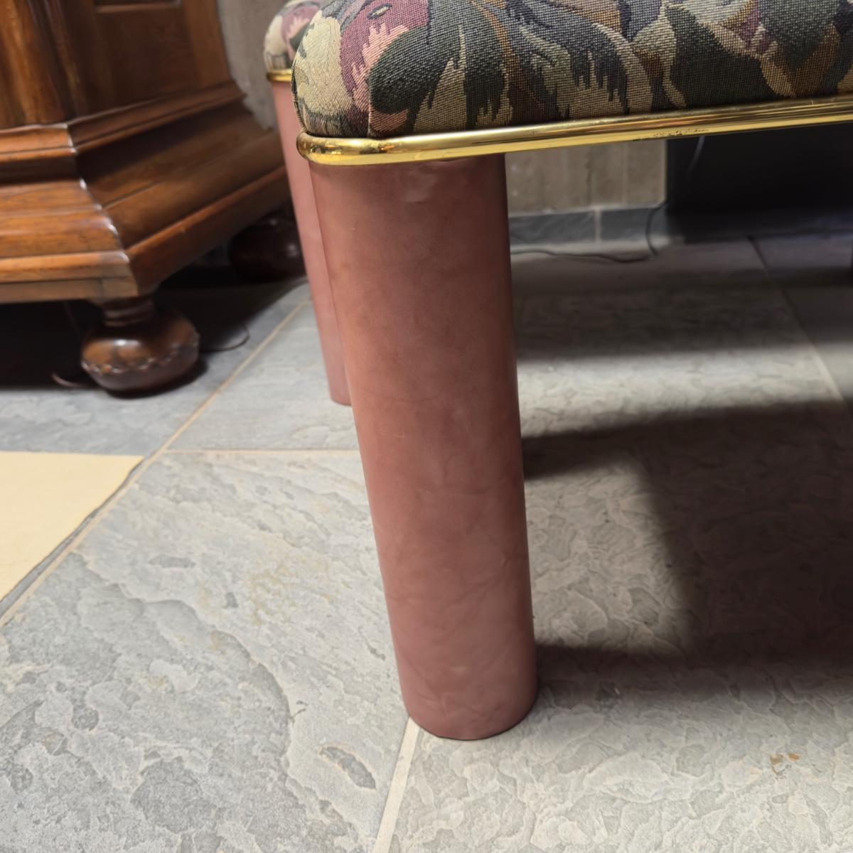 Top of bench is covered in a tapestry style fabric , the round iron legs are covered in pink leather, and gold trim