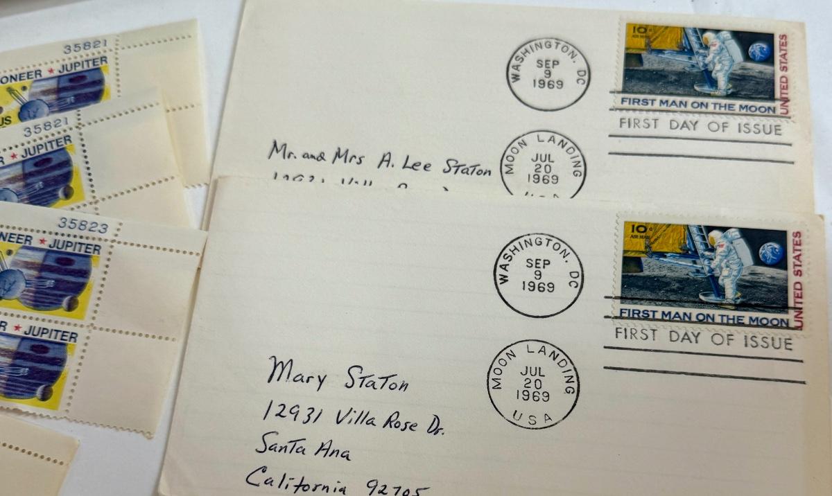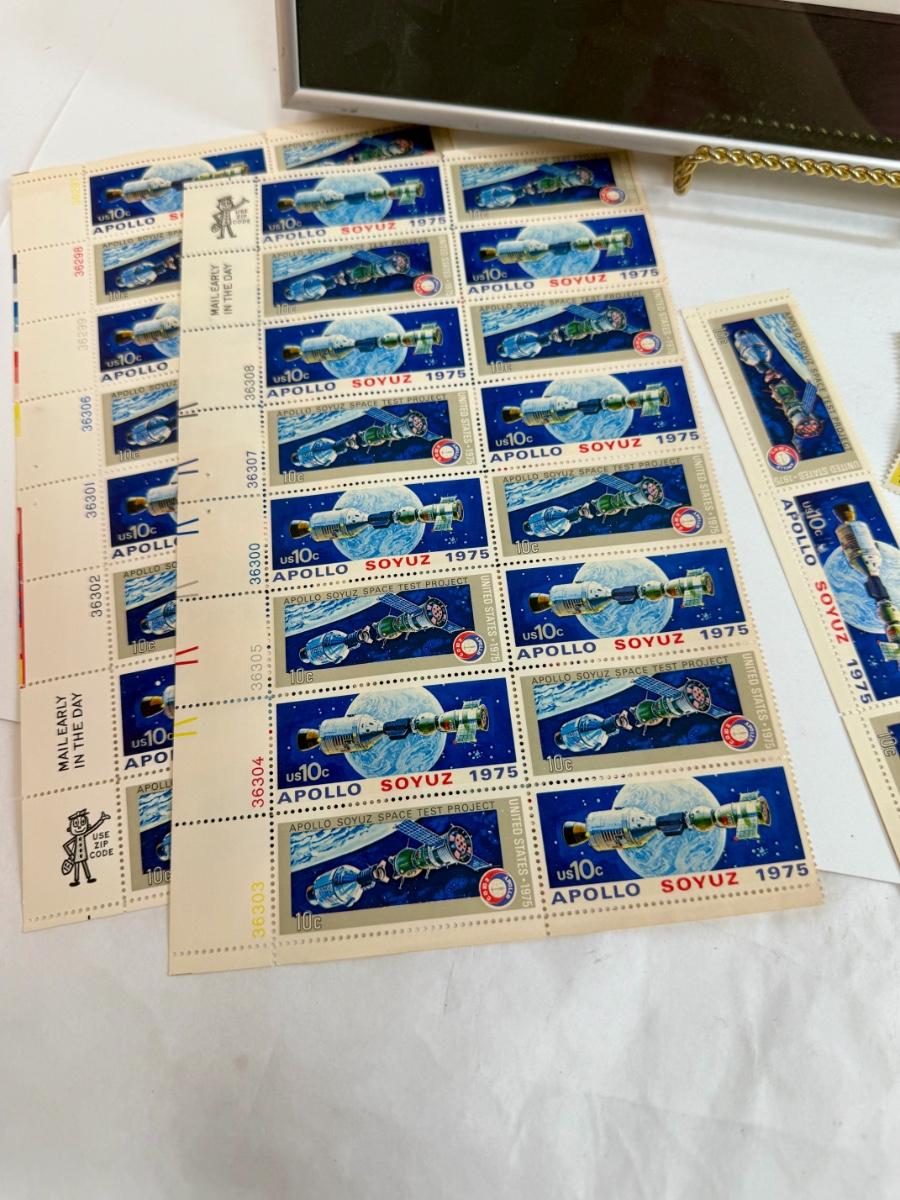 Framed color photo, Apollo-Soyuz Stamps, and more.