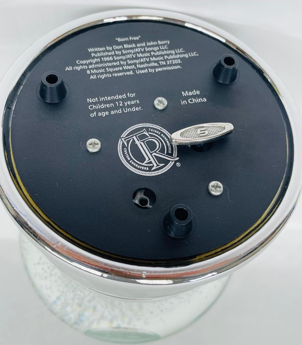 In good condition. Approx. 7" tall. Music box works as expected, plays "Born Free".