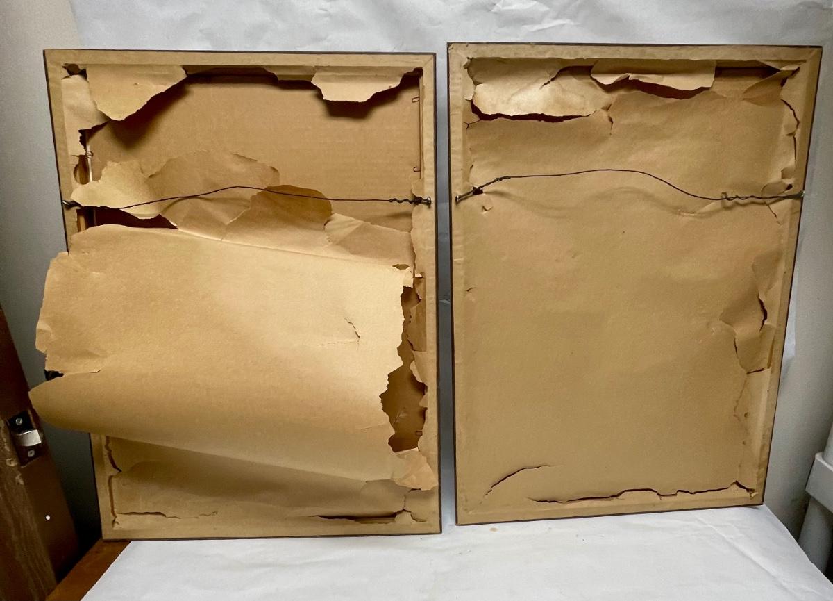 In fair condition. There is some sticker residue that needs to get cleaned off the glass and one of the prints has a few splatter droplets of paint.