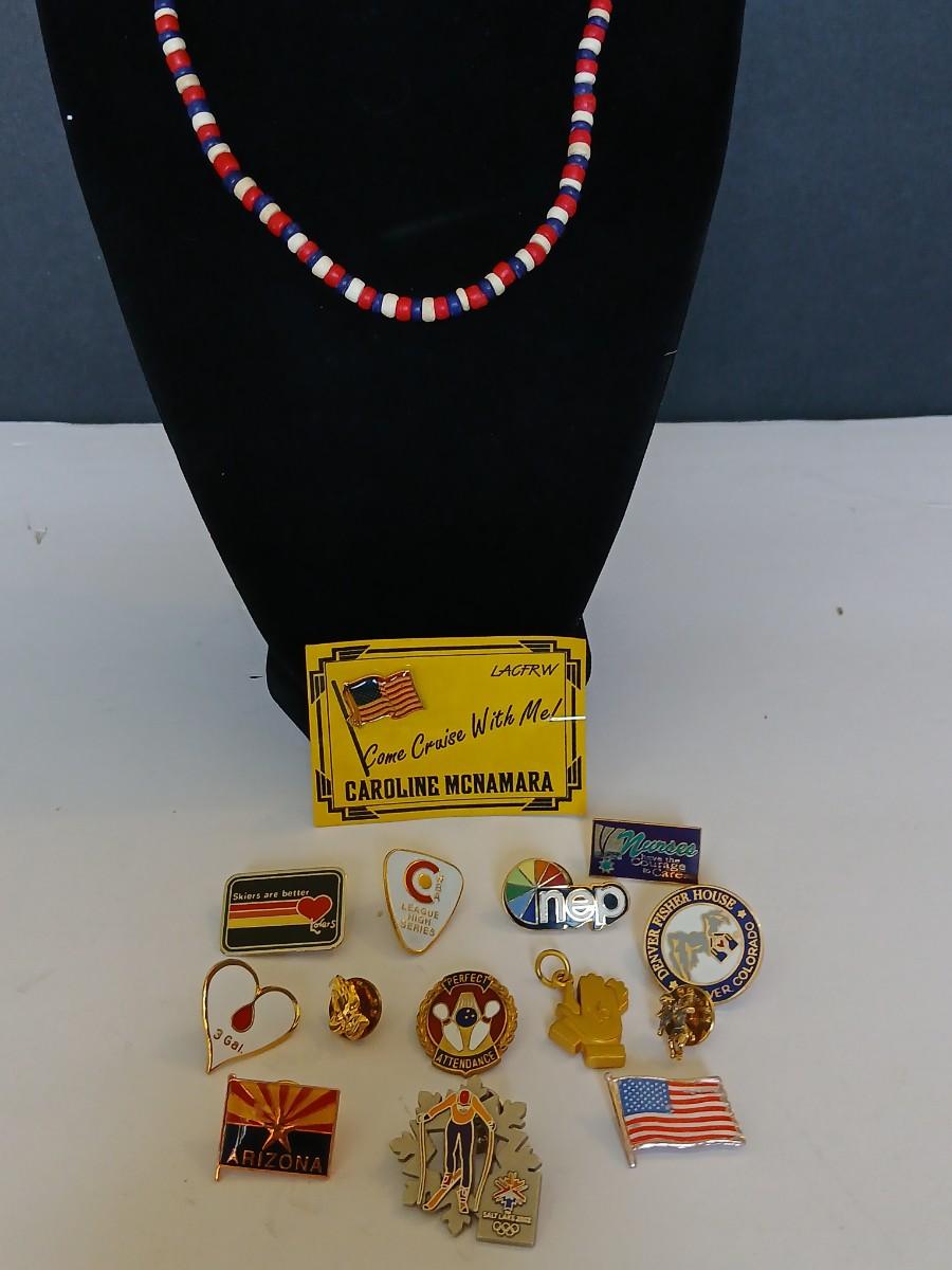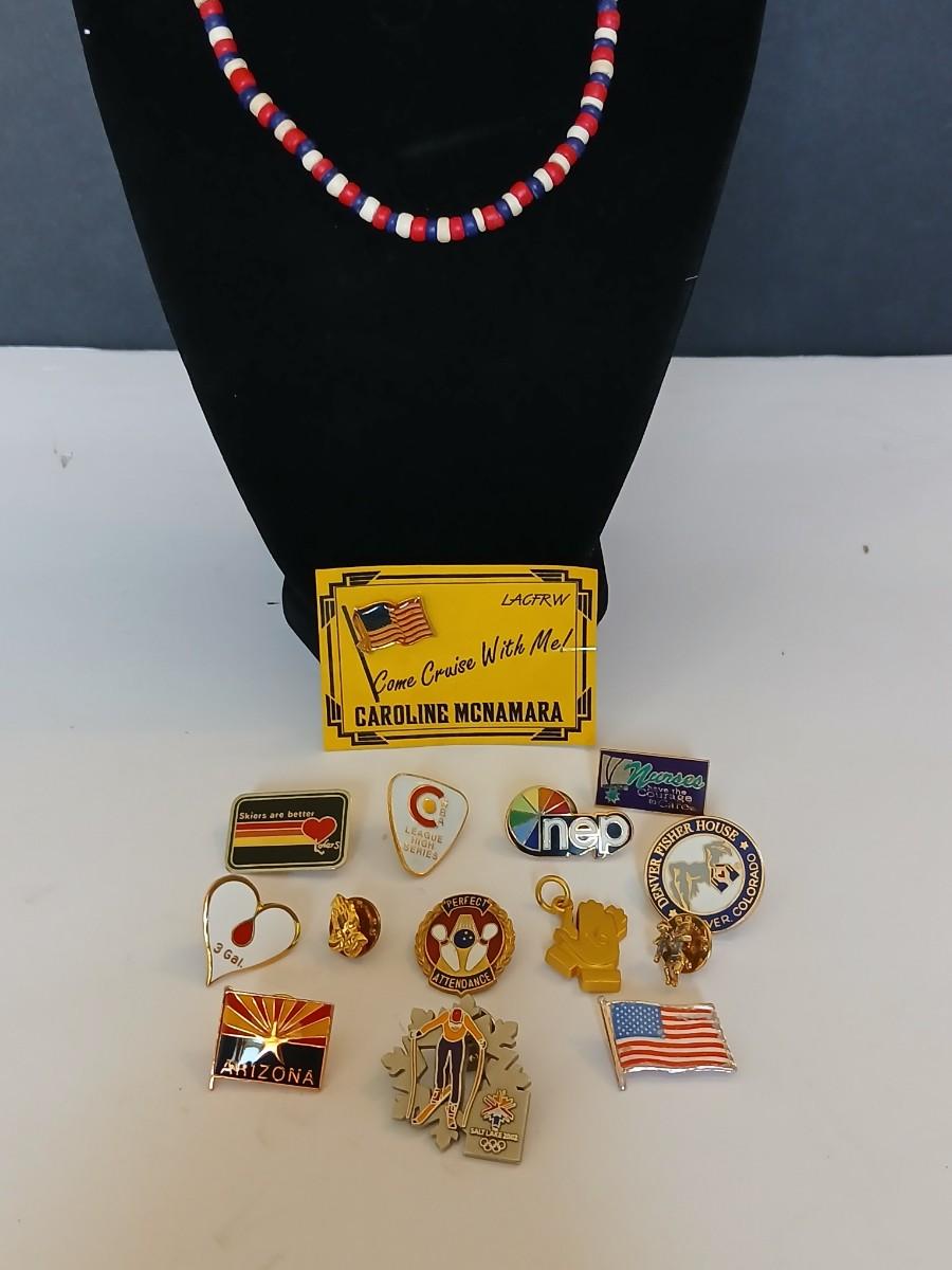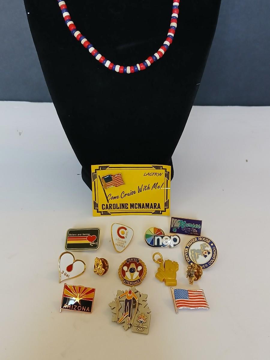 Lot of Enamel Lapel Pins + and an American red, white and blue necklace Just in time for the 4th of July!