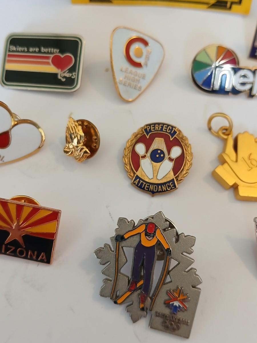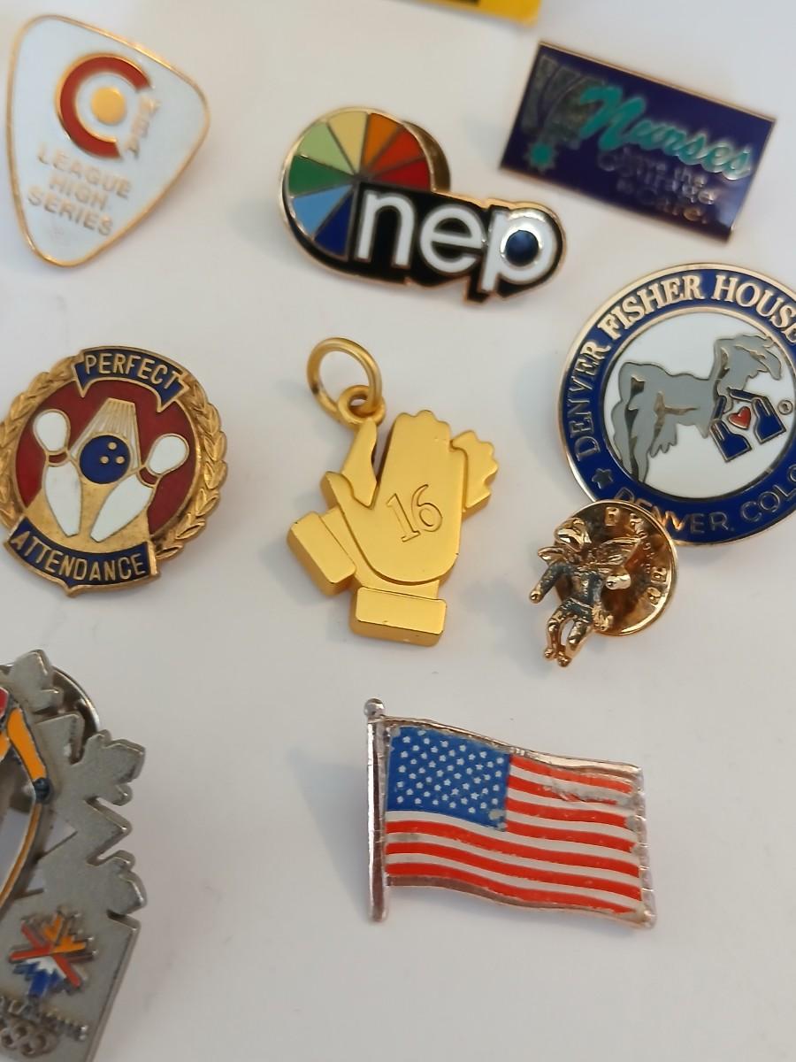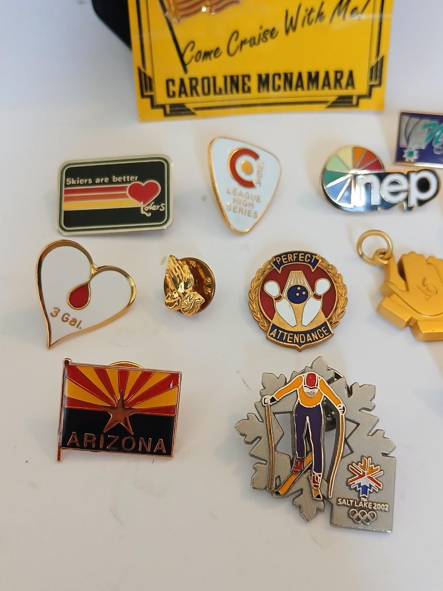 Fun collection of assorted enamel lapel pins plus one handmade-style necklace, including a wide variety of travel, patriotic, Olympic, and commemorative themes. Lot includes: