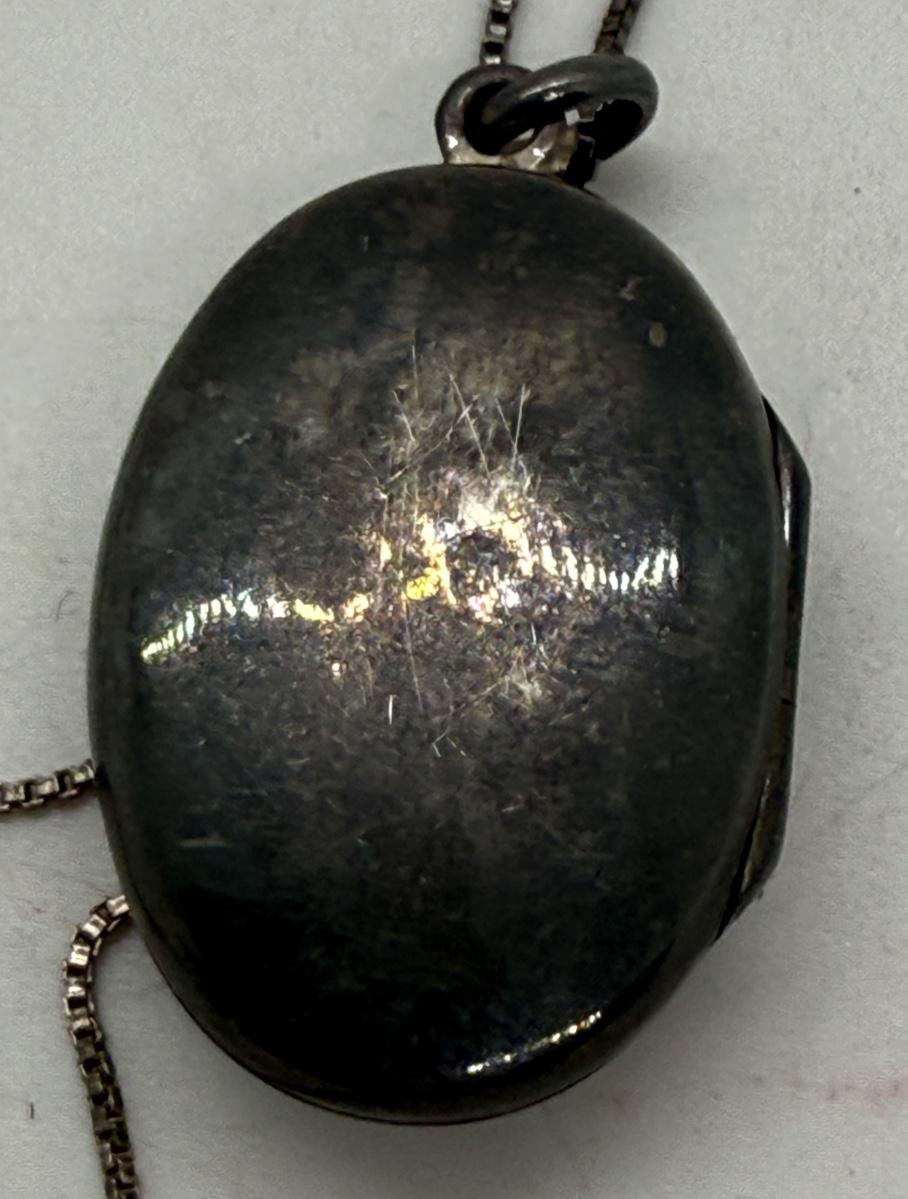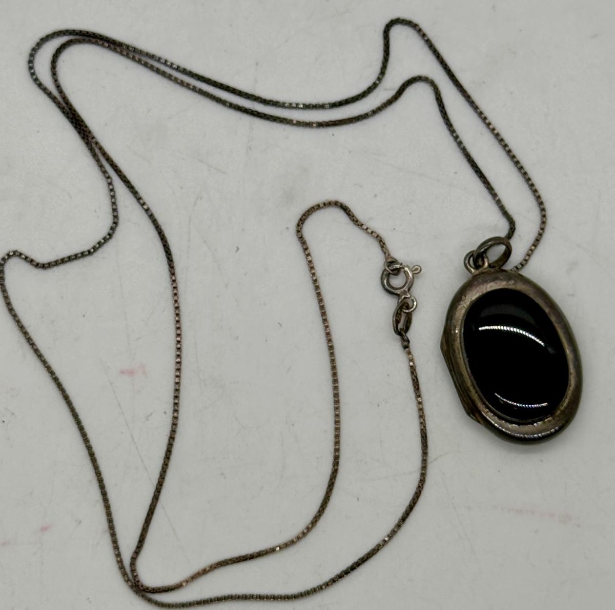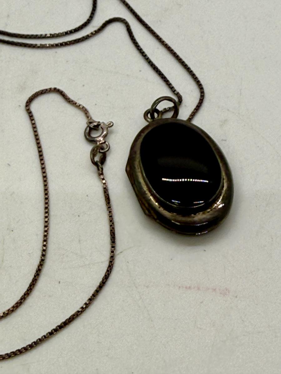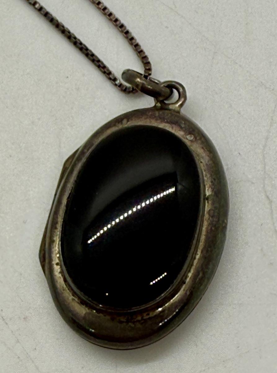 24" necklace chain. Pendant opens to reveal 2 spaces for small oval photos. Oval stone looks to be made of onyx.