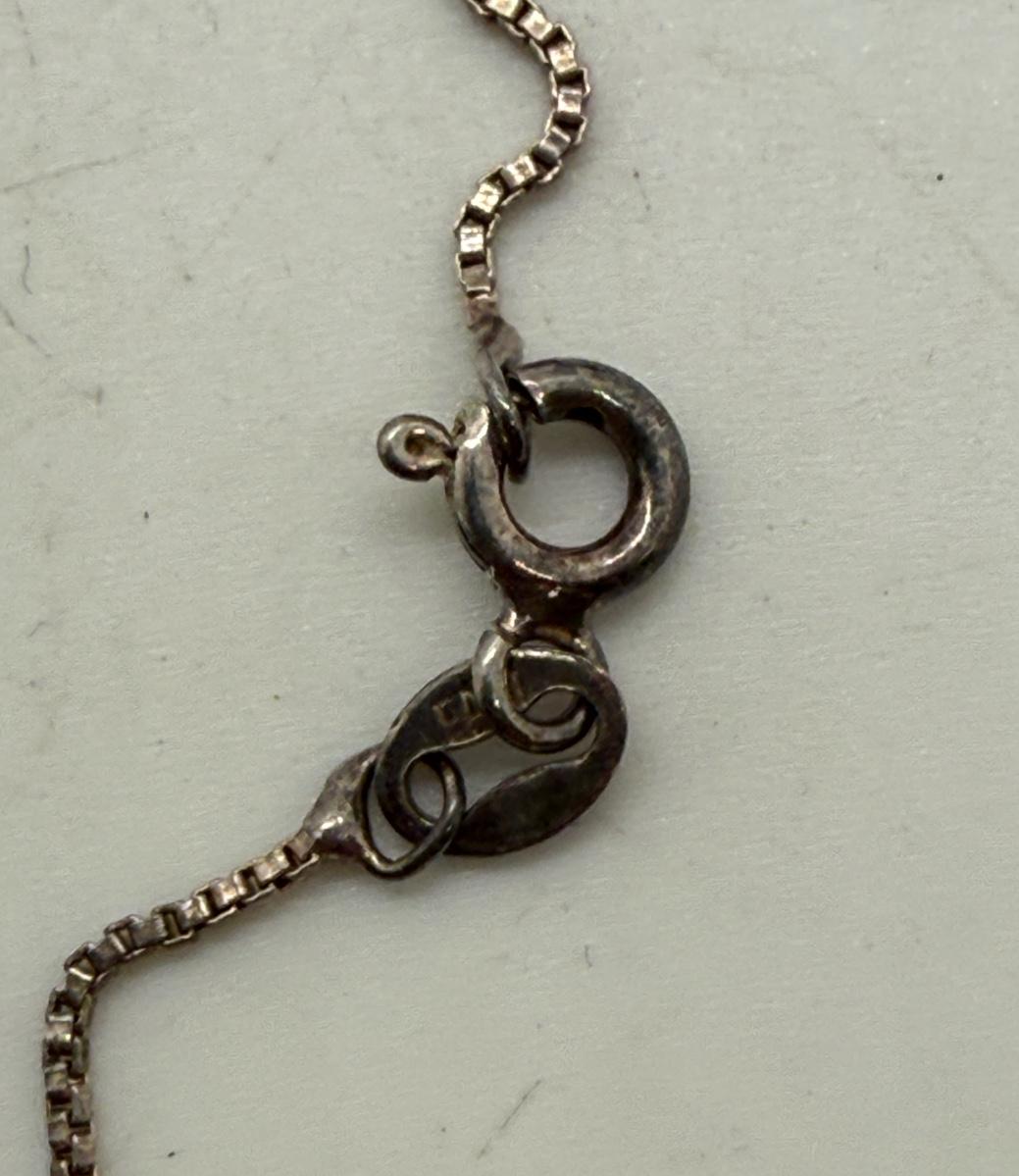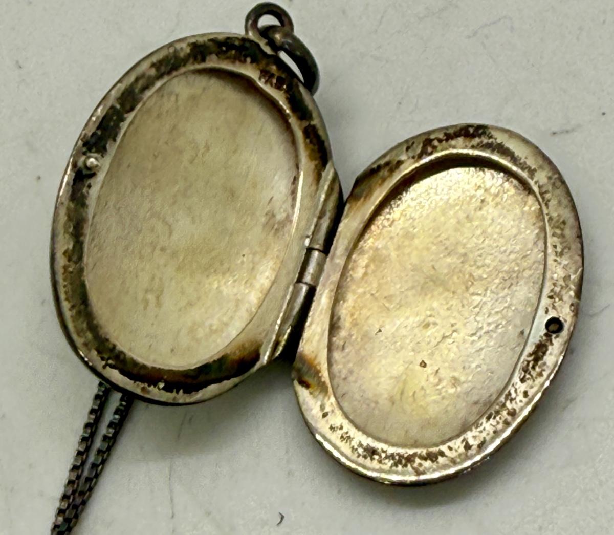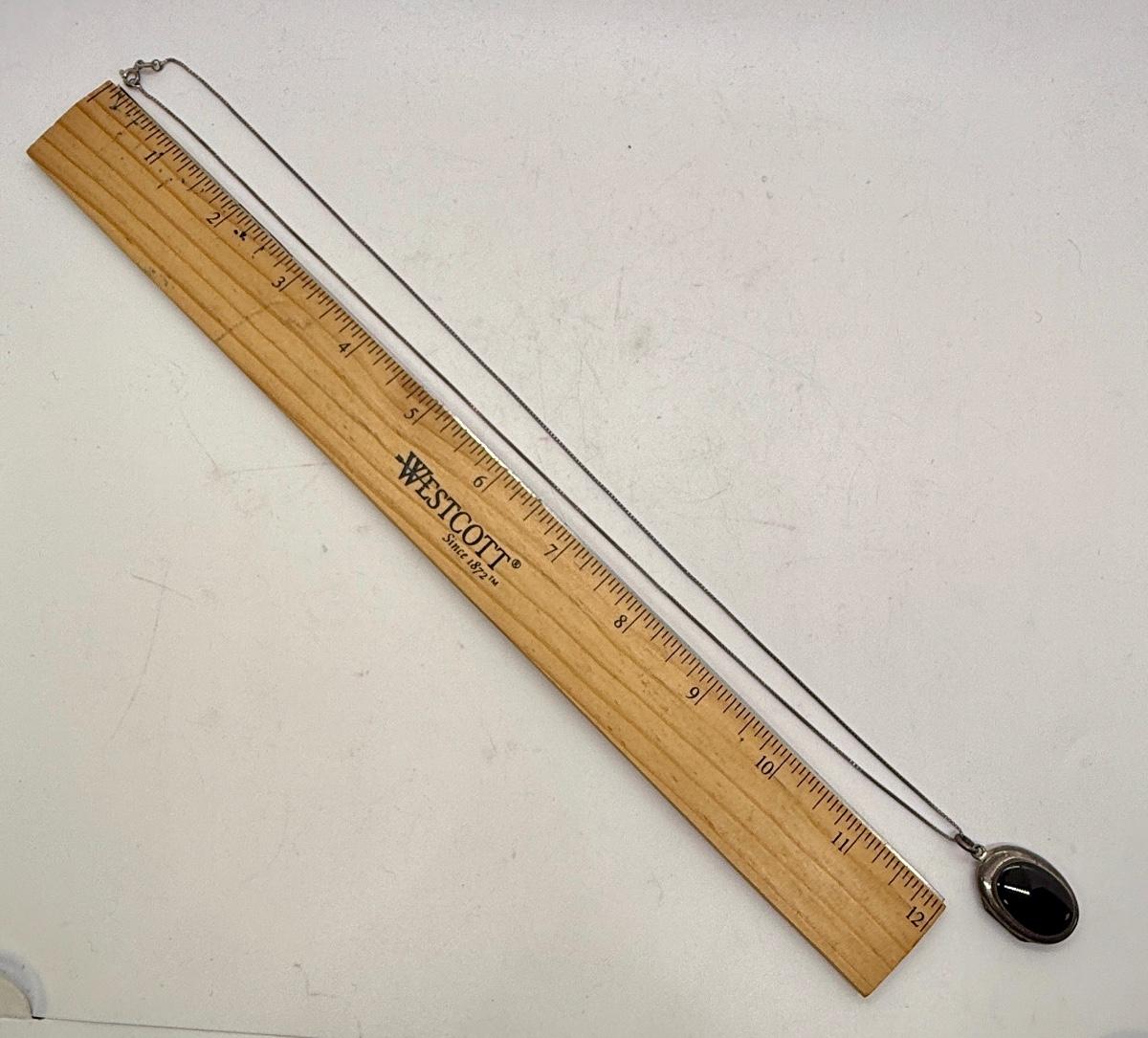24" necklace chain. Pendant opens to reveal 2 spaces for small oval photos. Oval stone looks to be made of onyx.