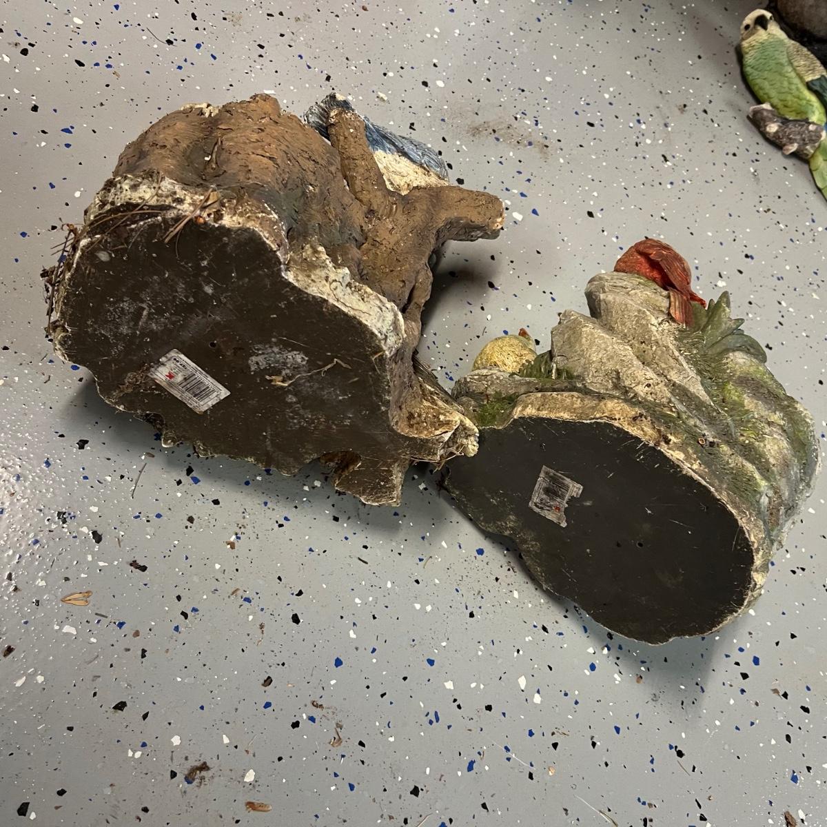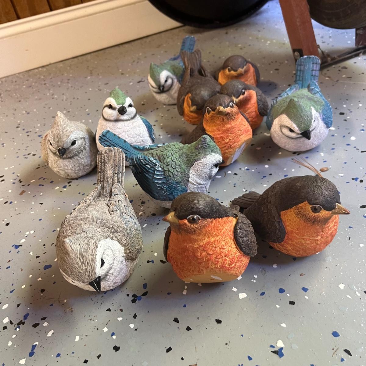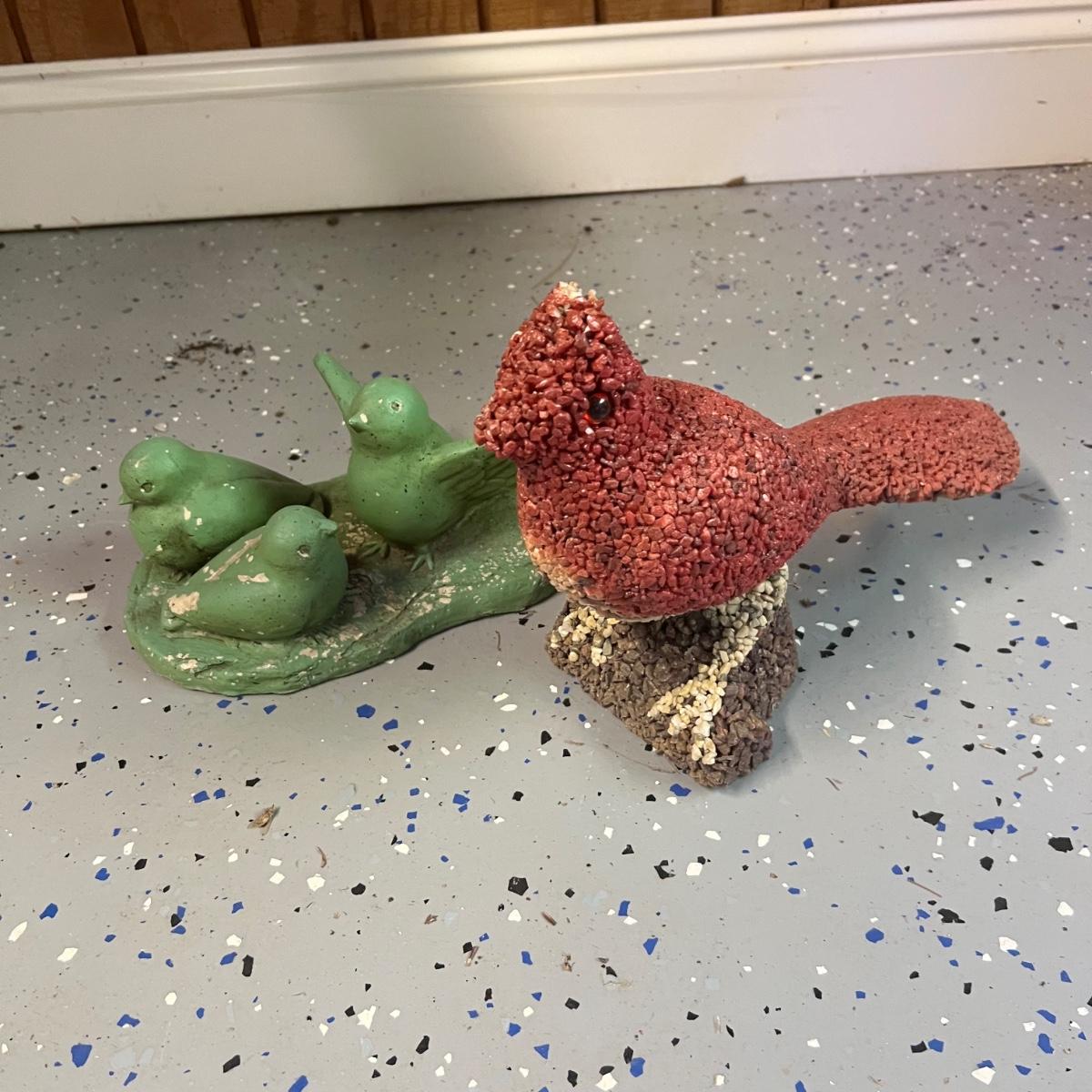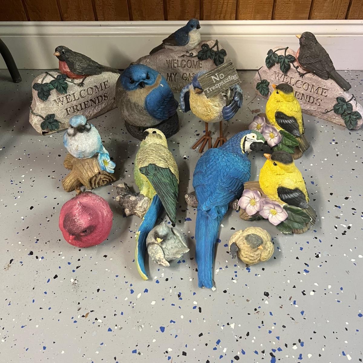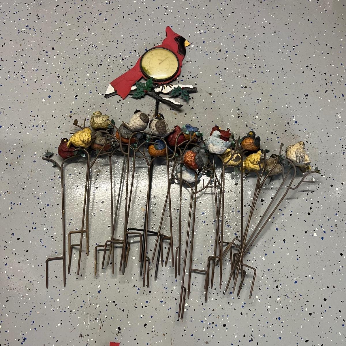 This large lot of over 50 items will brighten and add cheer to your yard. Over 15 staked birds plus a red cardinal thermometer stake which is metal, most other pieces are a hard resin like material. Please note the small welcome sign has one break that needs gluing back into place. The red squirrel has a painted gravel body and does need a little paint touch up on its head; it measures 10” x 5” x 9”H.