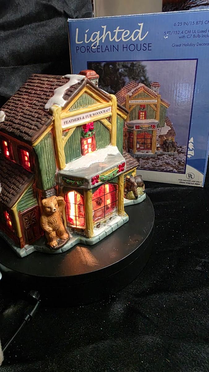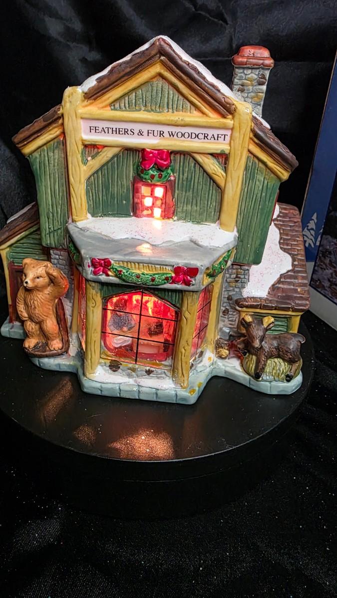 Feathers & Fur Woodcraft – Rustic Lighted Porcelain Village Shop (Wildlife Lodge Series)